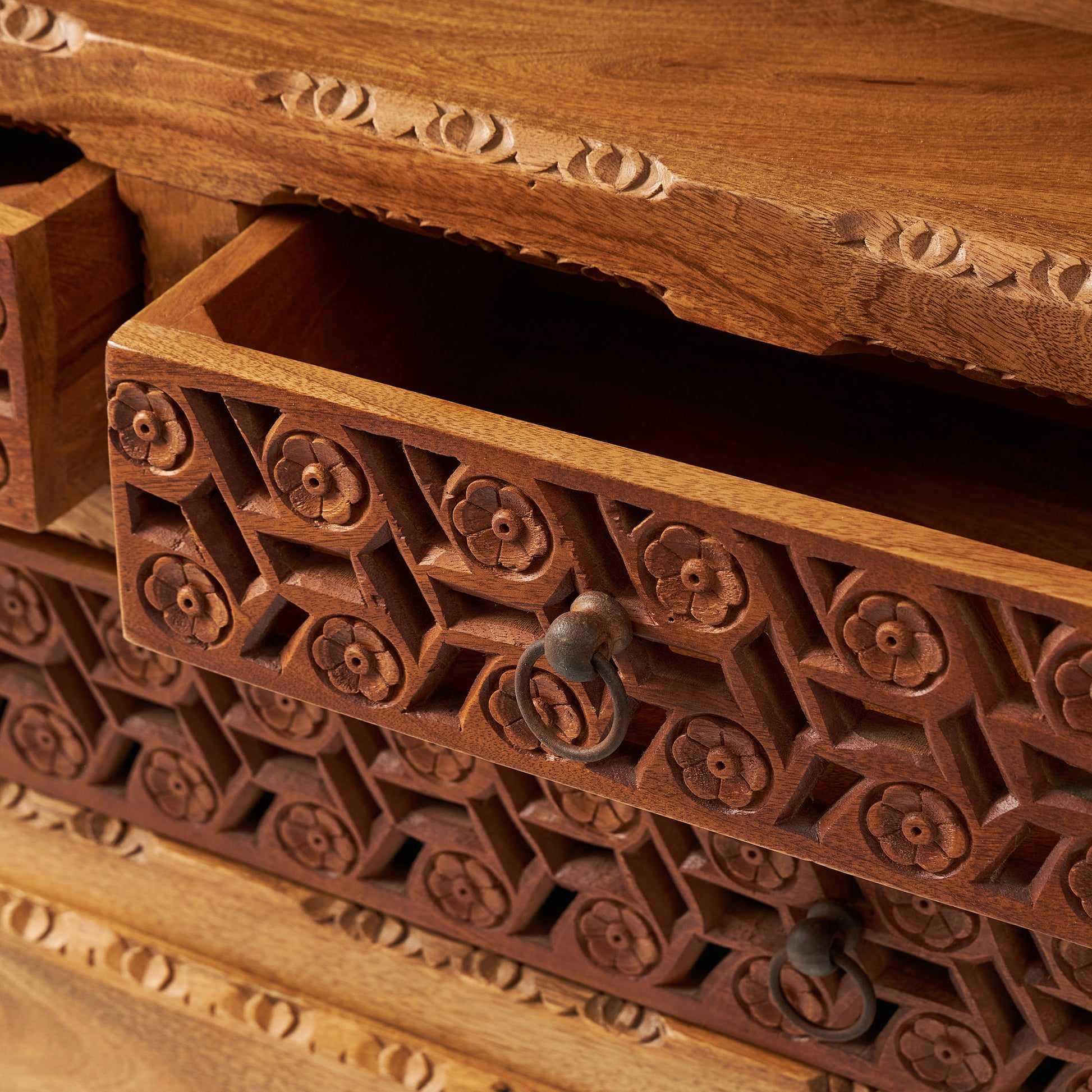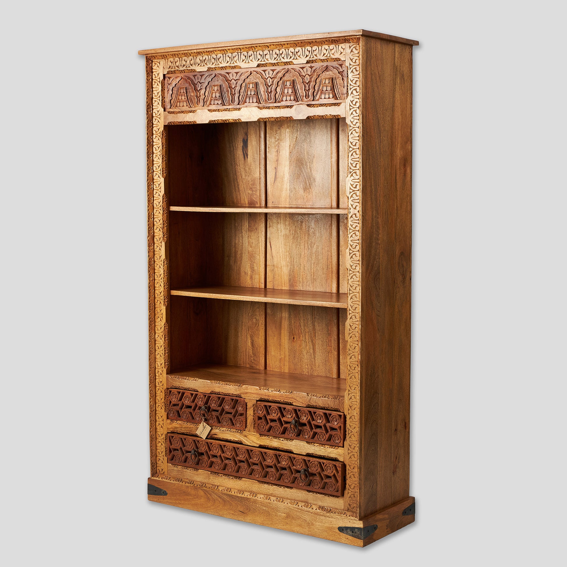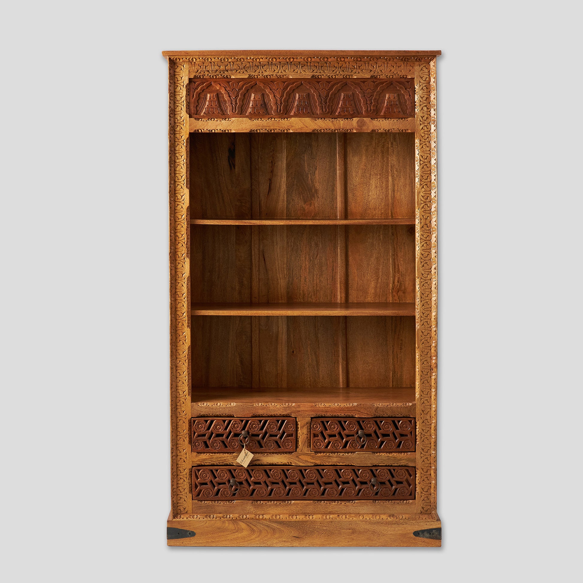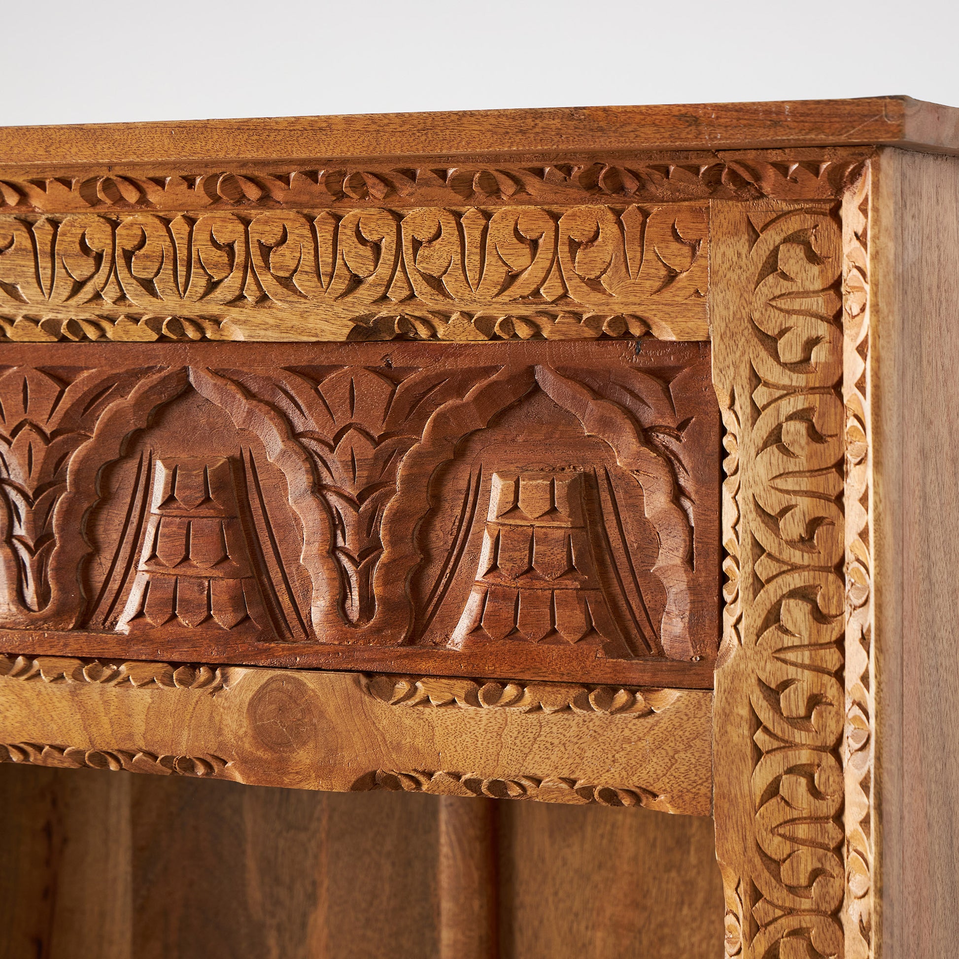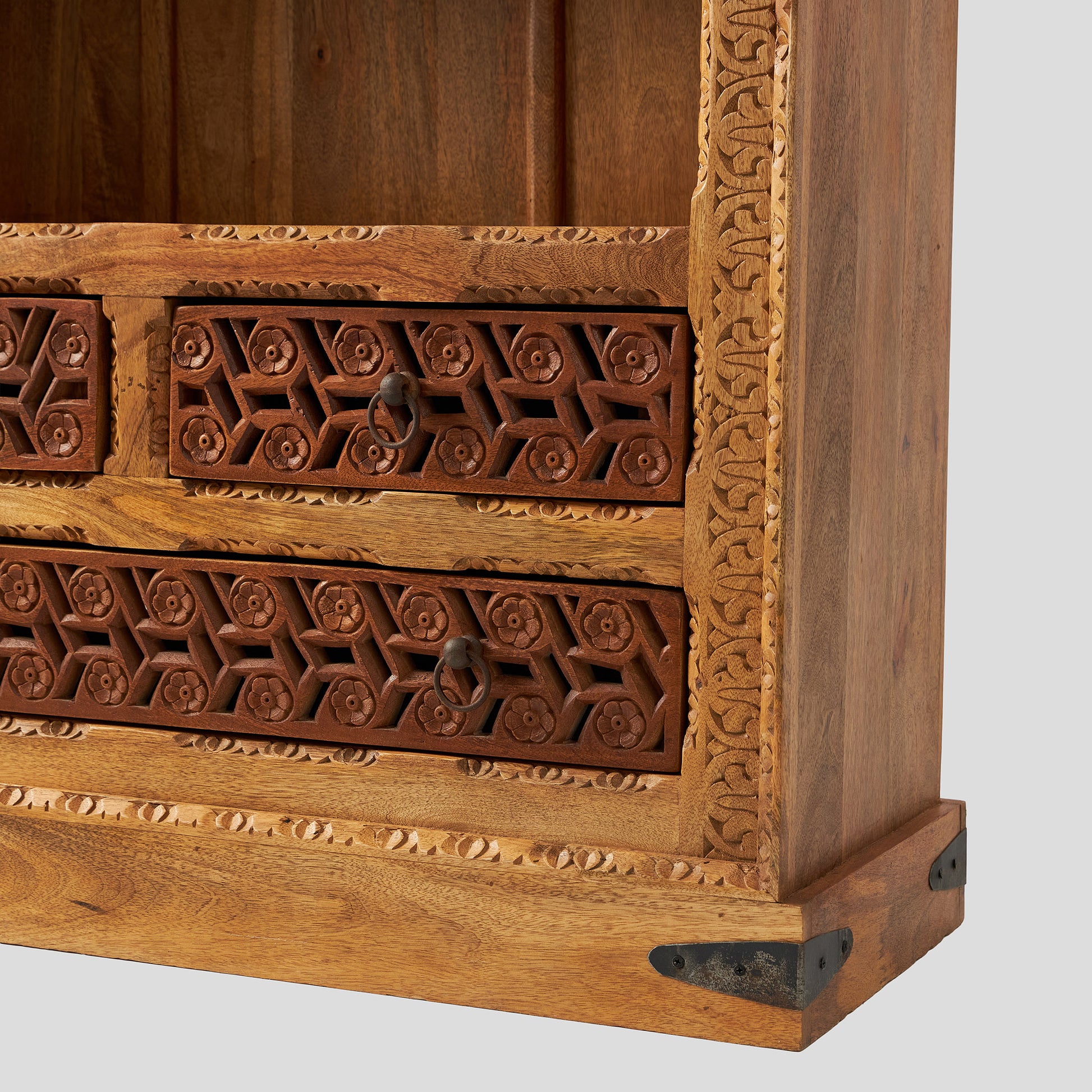 Bibliotecă realizată manual din lemn de mango, cu detalii sculptate în modele deosebite, ce atrag privirea prin finețea lor. Finisajul cald pune în evidență frumusețea lemnului și a lucrului artizanal. Dispune de rafturi încăpătoare și sertare practice, ideale pentru depozitarea obiectelor mici. Este o piesă remarcabilă, potrivită pentru un birou de acasă sau un colț de lectură, unde aduce un plus de originalitate și eleganță.