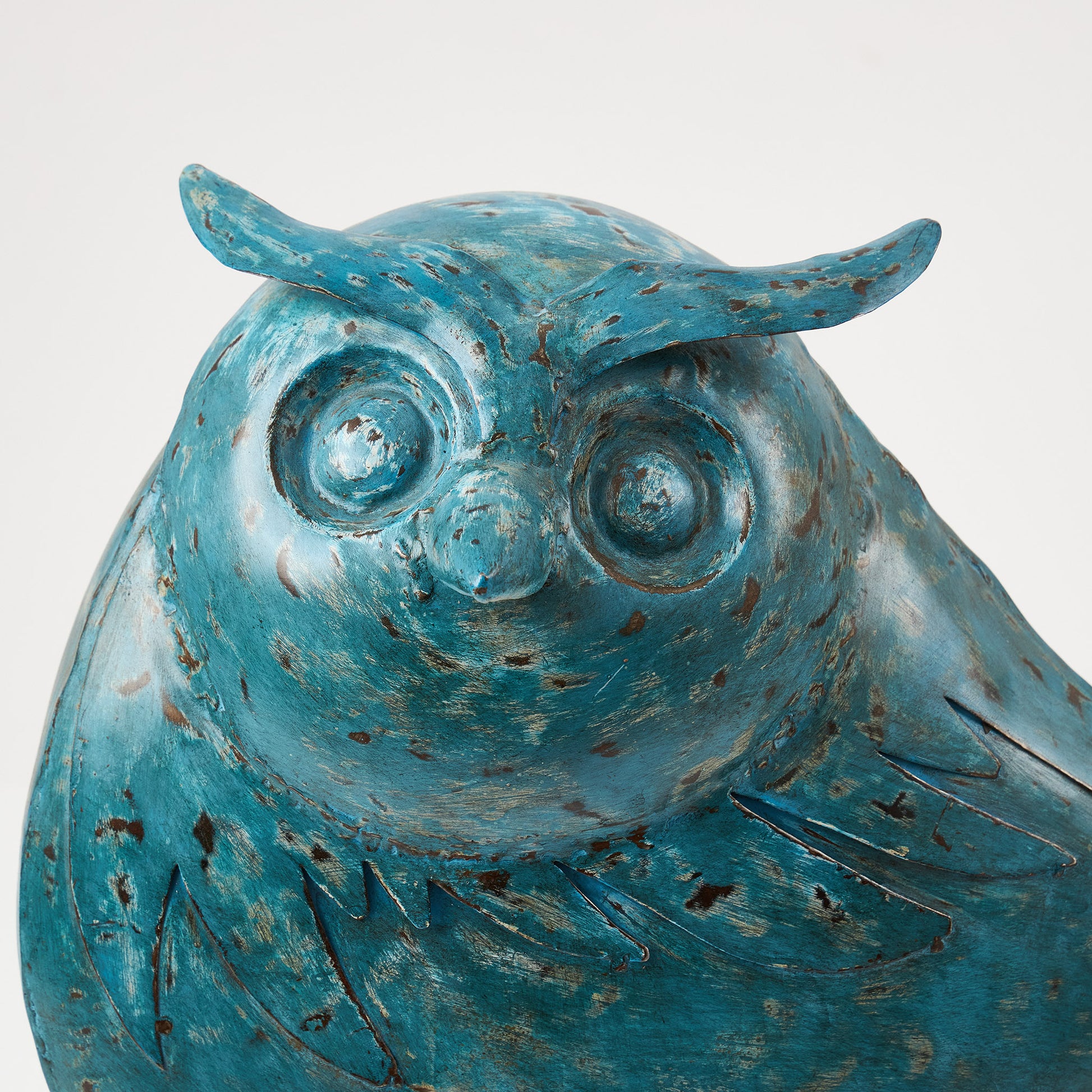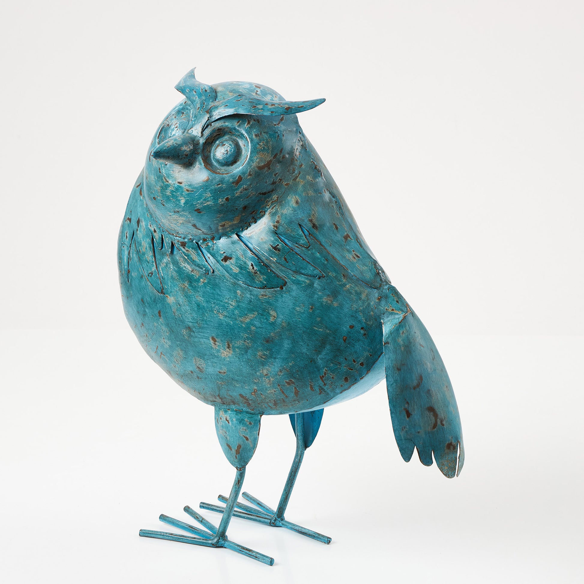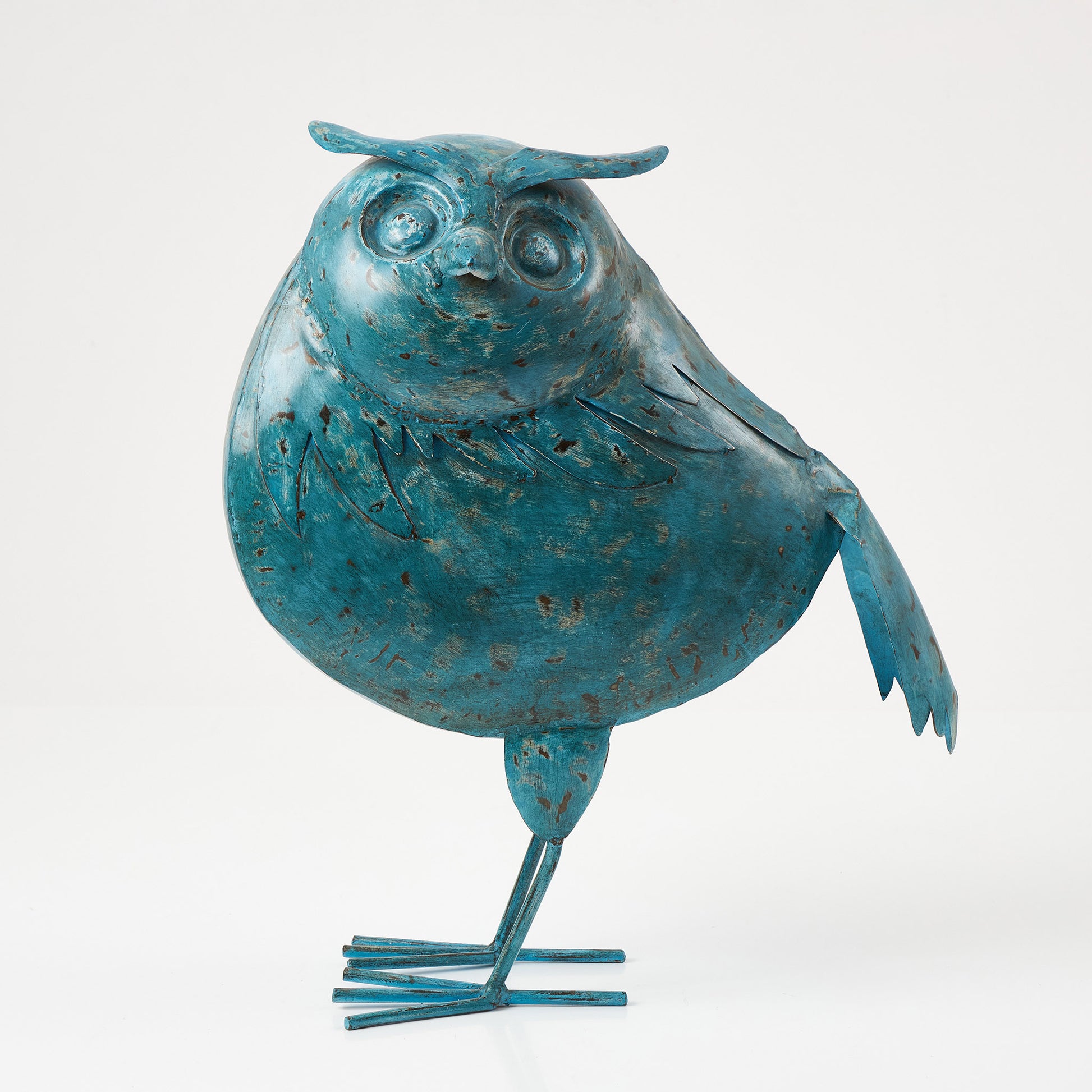 Figurină decorativă în formă de bufniță, realizată din metal cu finisaj patinat în nuanțe de albastru. Bufnița este un simbol al înțelepciunii și al protecției, ceea ce o face potrivită nu doar ca decor, ci și ca obiect cu semnificație. Poate fi așezată pe o comodă, un raft de bibliotecă sau ca accent pe terasa unei case.