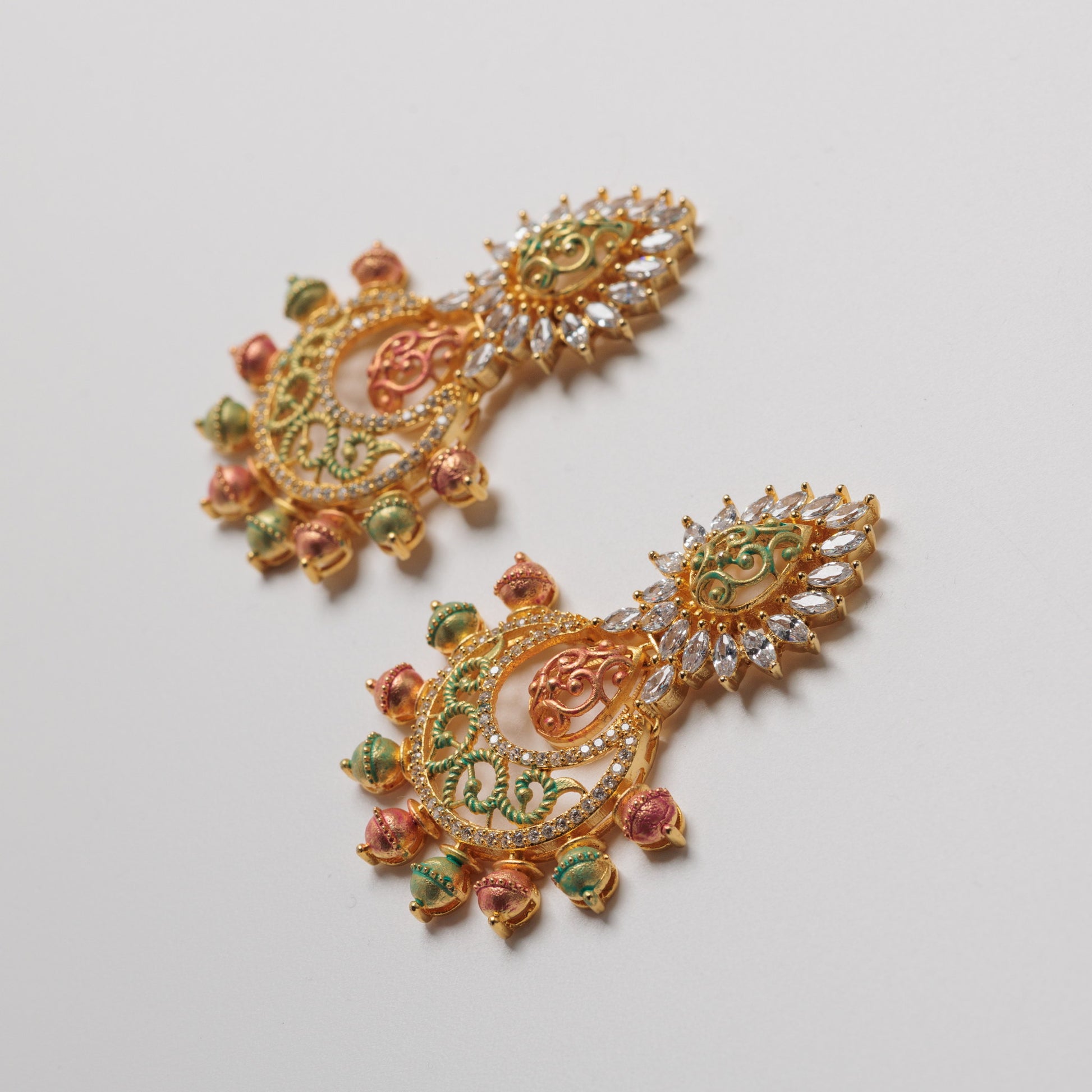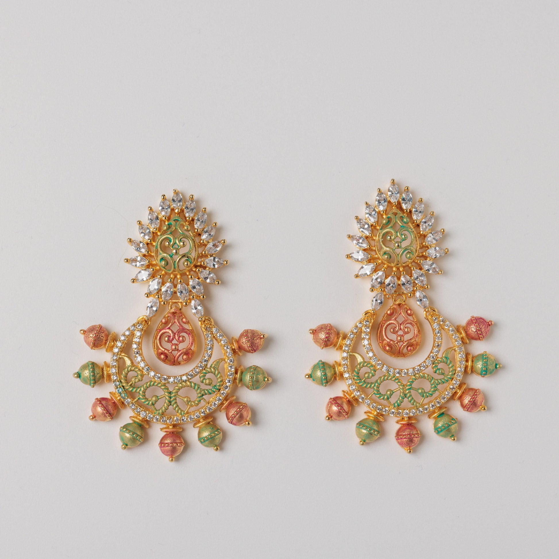 Îmbină arta și rafinamentul cu acești cercei pictați manual, bogat decorați, și încrustați cu zirconii delicate și strălucitoare. Designul lor sofisticat și plin de detalii îi transformă într-un accesoriu statement, perfect pentru ocazii speciale sau pentru momentele în care vrei să ieși în evidență. Hipoalergenici și fără nichel.