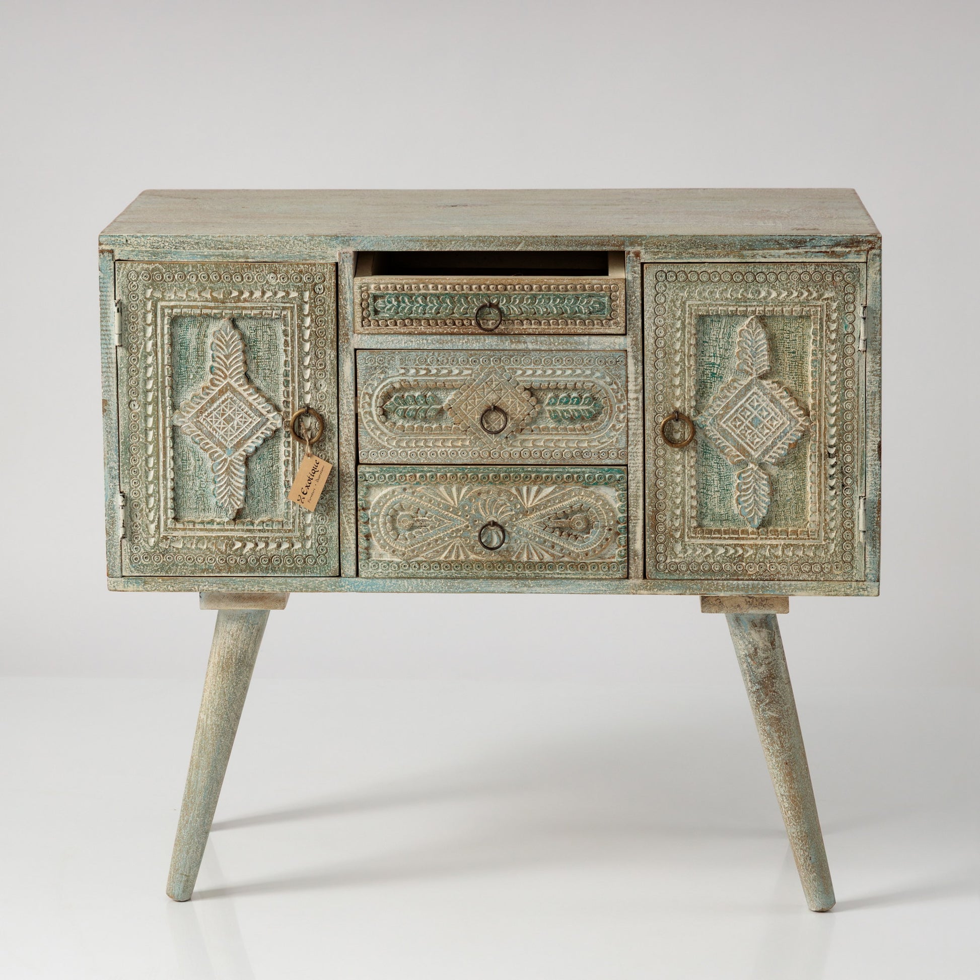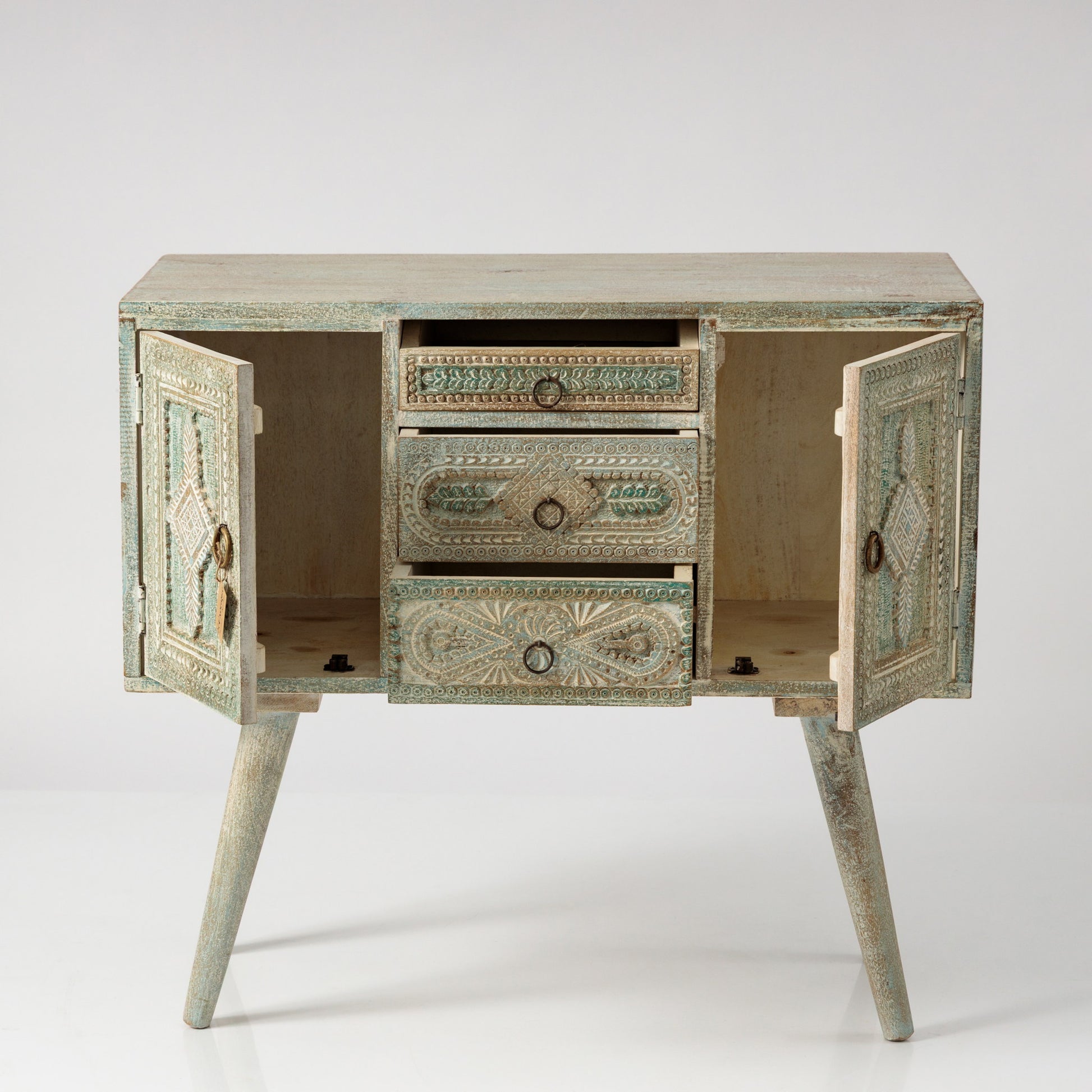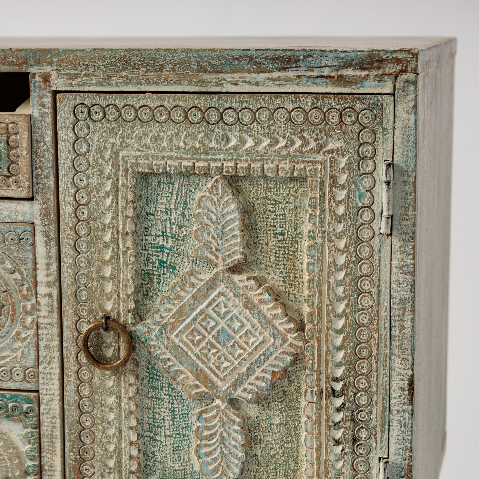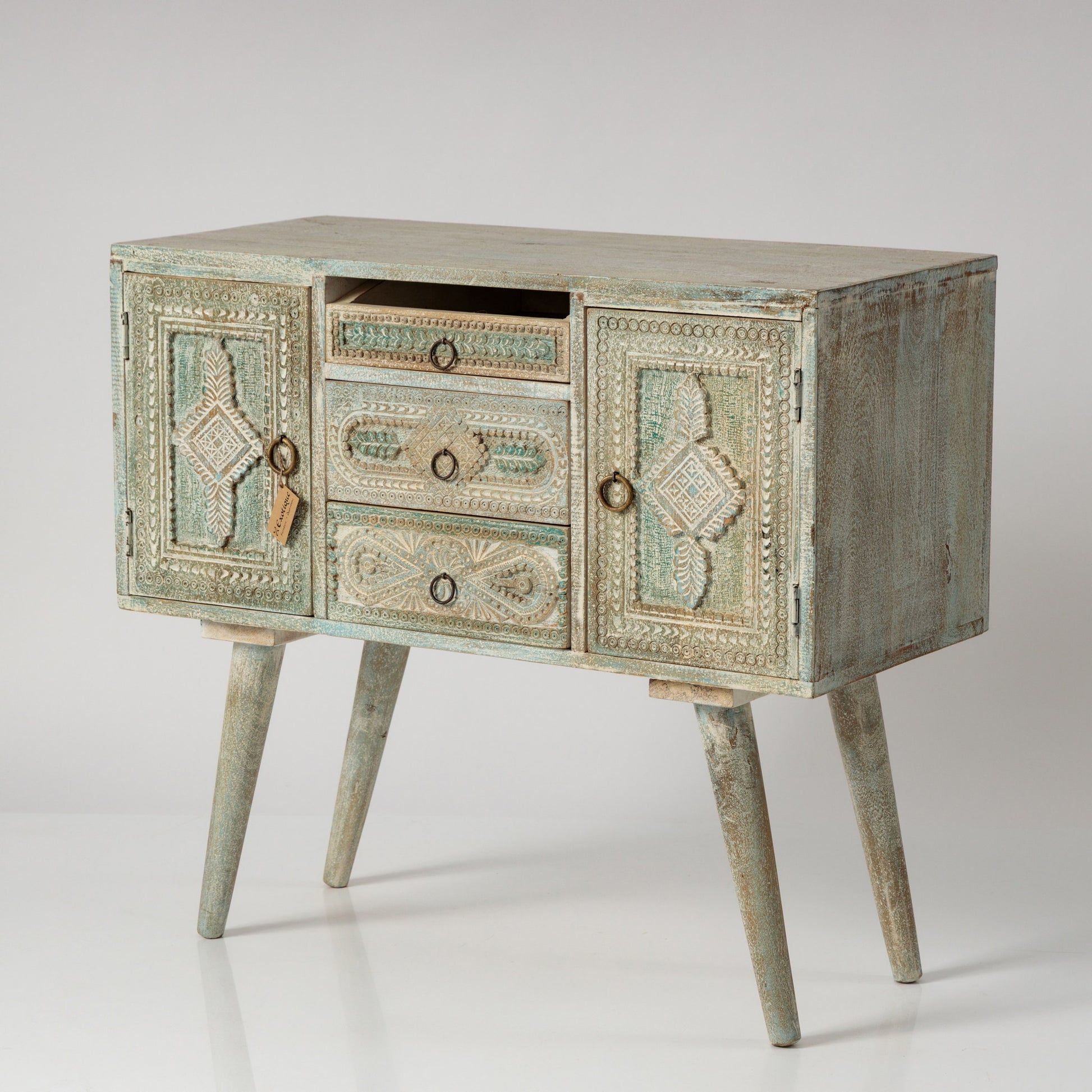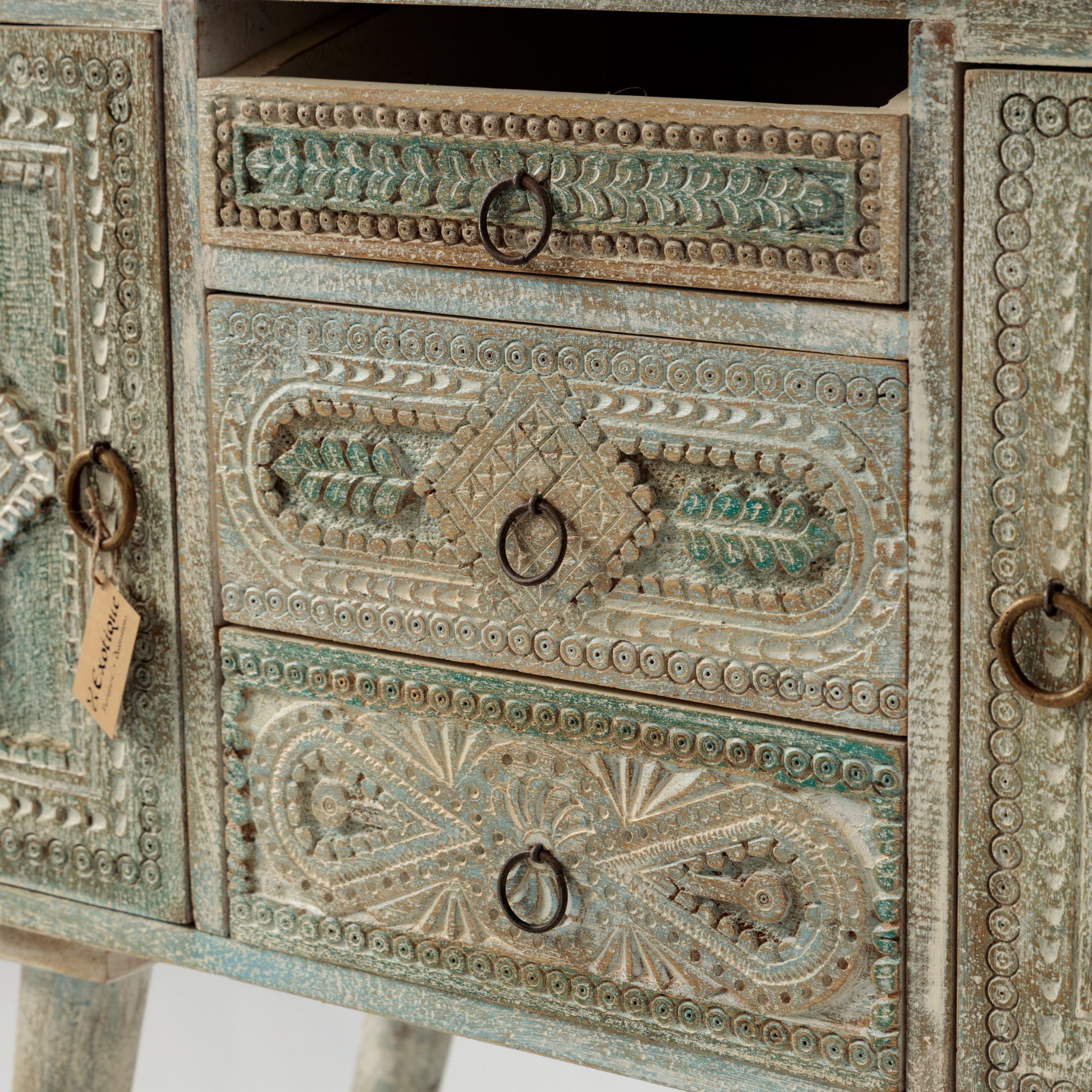 O comodă cu un design cu totul aparte, datorită detaliilor sculptate manual și nuanțelor patinate de crem și turcoaz. Are trei sertare și două uși laterale, așezate pe picioare oblice, care îi dau un aer modern, dar păstrează și acel farmec lucrat de mână. Poate fi integrată într-un dormitor, hol sau într-un spațiu comercial precum un boutique sau un restaurant cu atmosferă caldă și detalii atent alese.