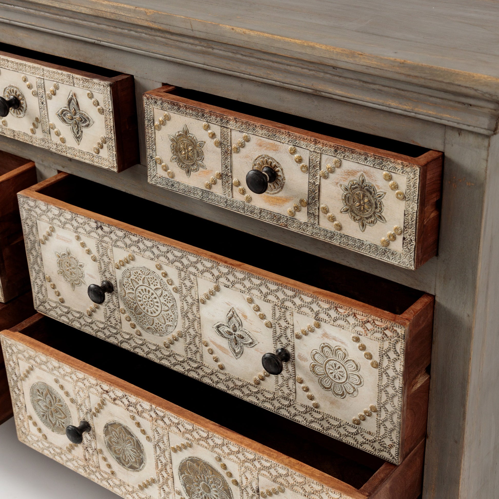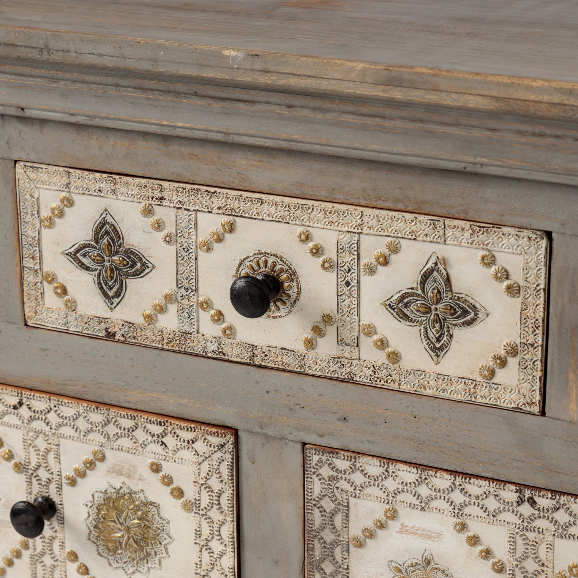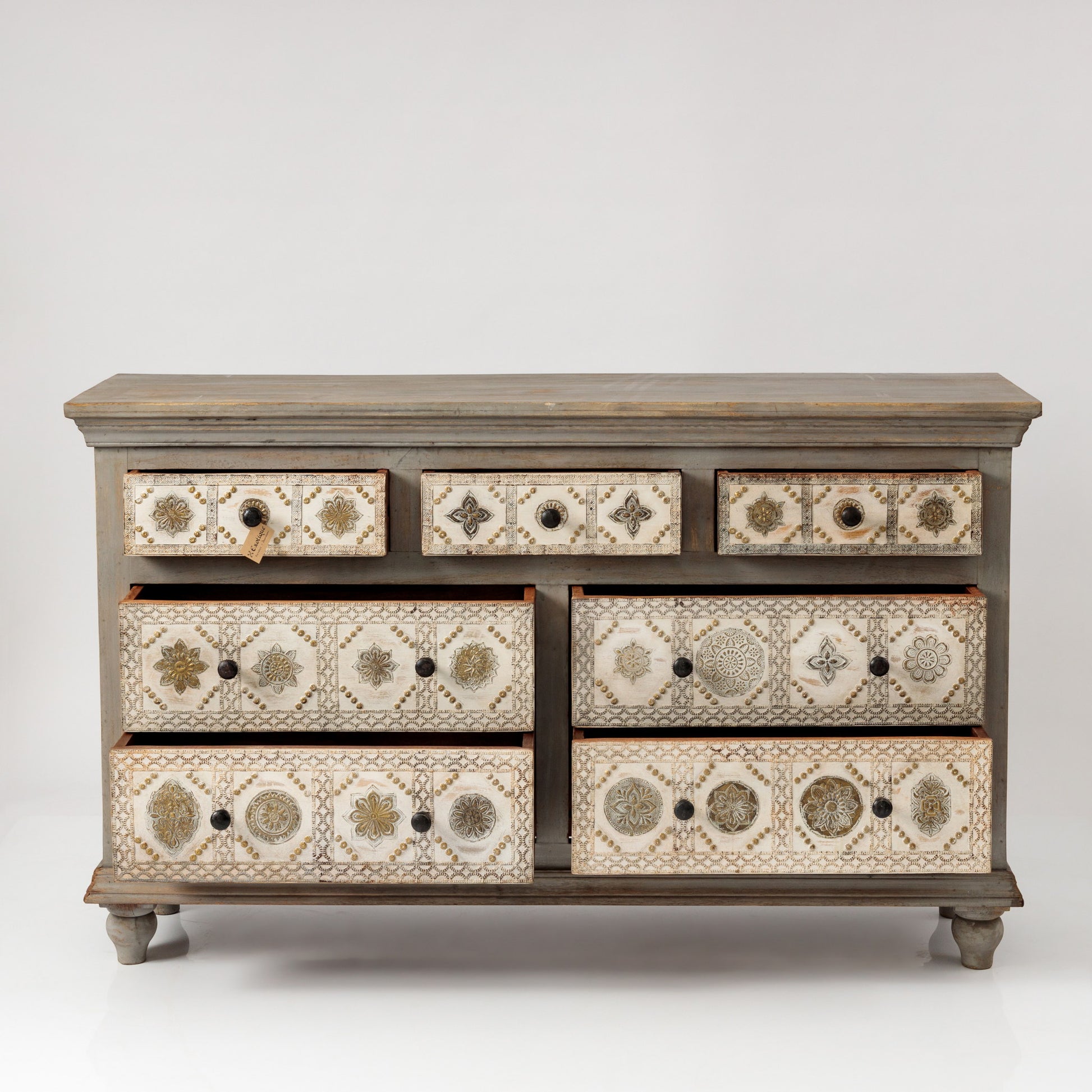 Comodă practică din lemn de mango, cu sertare încăpătoare și fronturi decorate cu modele gravate și mici aplicații metalice. Are un aspect ușor vintage, în nuanțe deschise, care se potrivesc ușor în multe spații. Poate fi folosită în dormitor, living, hol sau chiar într-un birou. E utilă pentru depozitare și poate susține deasupra o lampă, o oglindă, rame foto sau alte obiecte decorative.