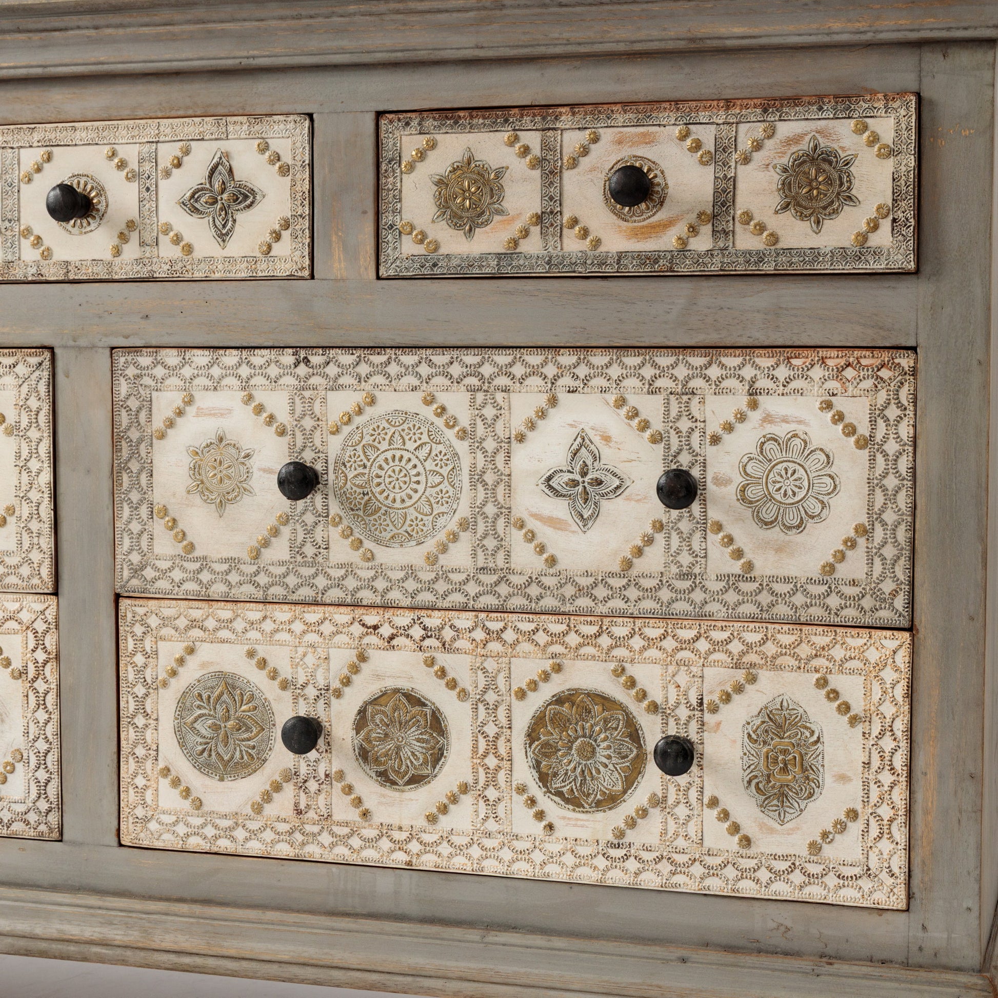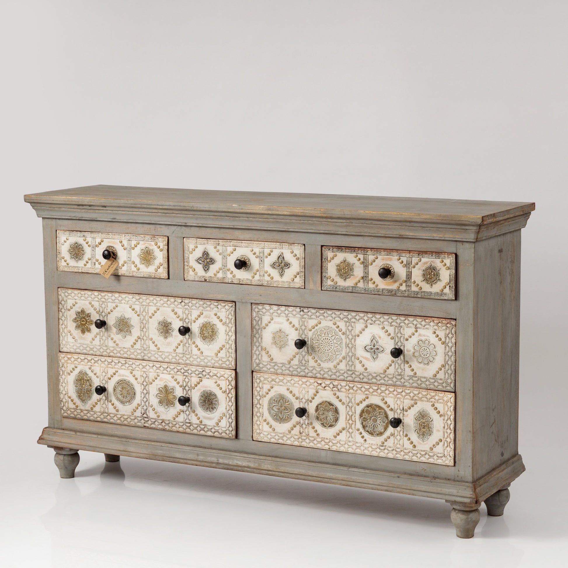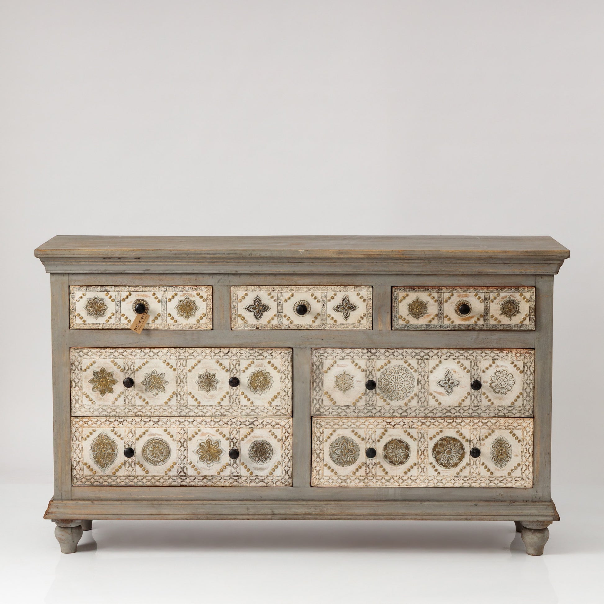 Comodă practică din lemn de mango, cu sertare încăpătoare și fronturi decorate cu modele gravate și mici aplicații metalice. Are un aspect ușor vintage, în nuanțe deschise, care se potrivesc ușor în multe spații. Poate fi folosită în dormitor, living, hol sau chiar într-un birou. E utilă pentru depozitare și poate susține deasupra o lampă, o oglindă, rame foto sau alte obiecte decorative.