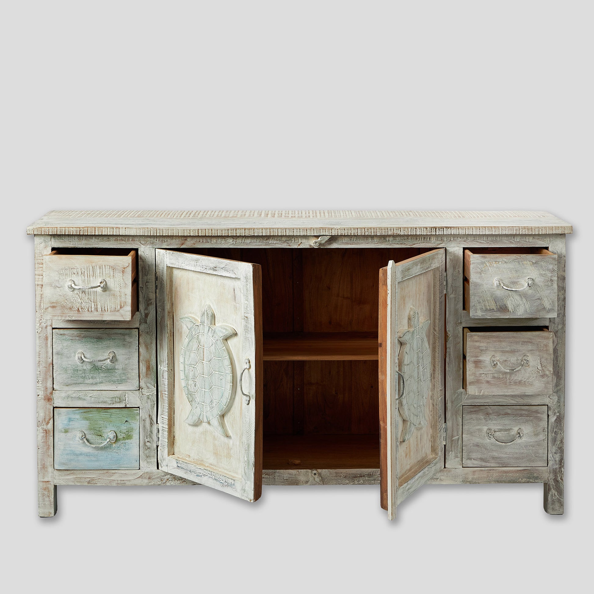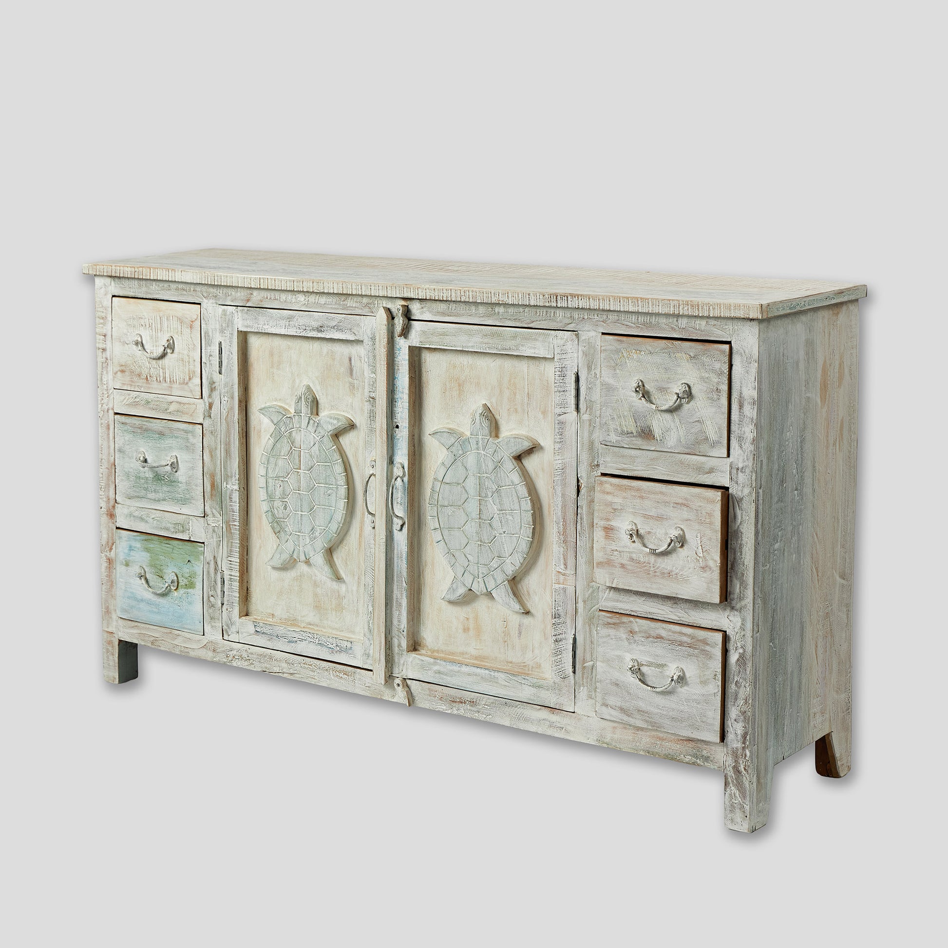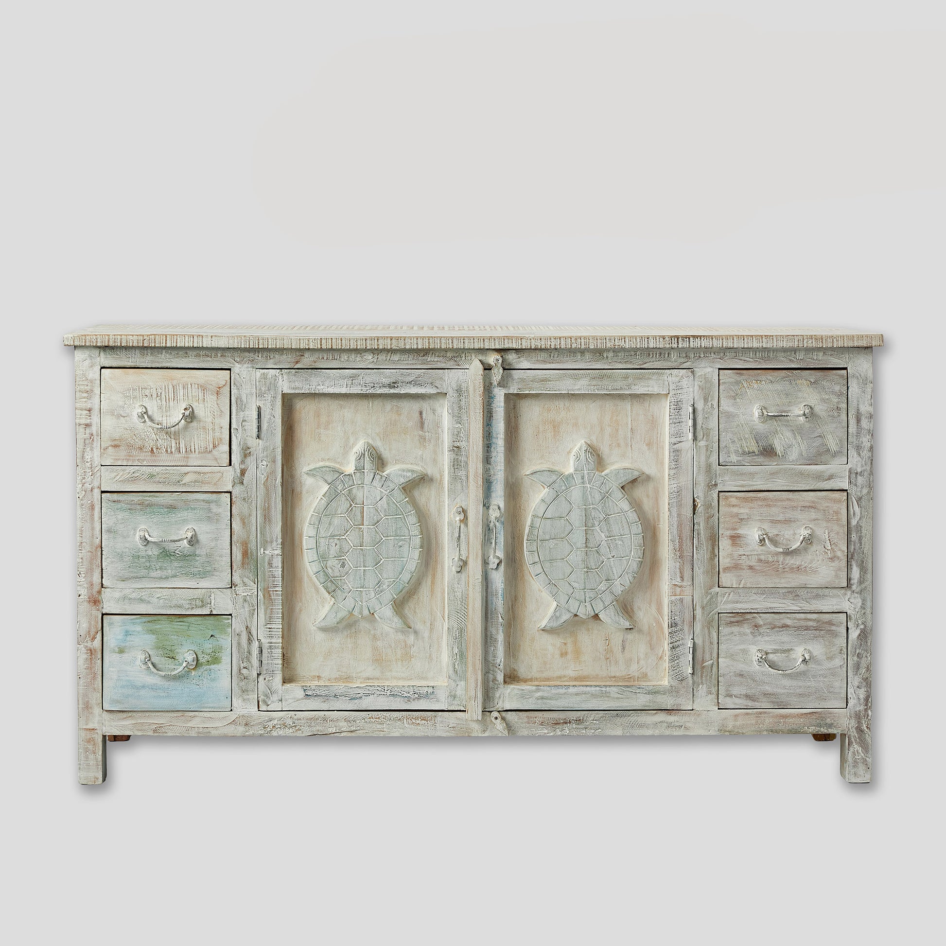 Comodă realizată manual din lemn de mango, decorată cu broaște țestoase sculptate – simbol al înțelepciunii și longevității. Finisajul patinat îi dă un aer autentic și cald. Oferă spațiu generos cu două uși centrale și șase sertare laterale. Practică și decorativă, poate fi integrată în living, dormitor sau chiar în camera unui copil, unde adaugă o notă veselă și originală.