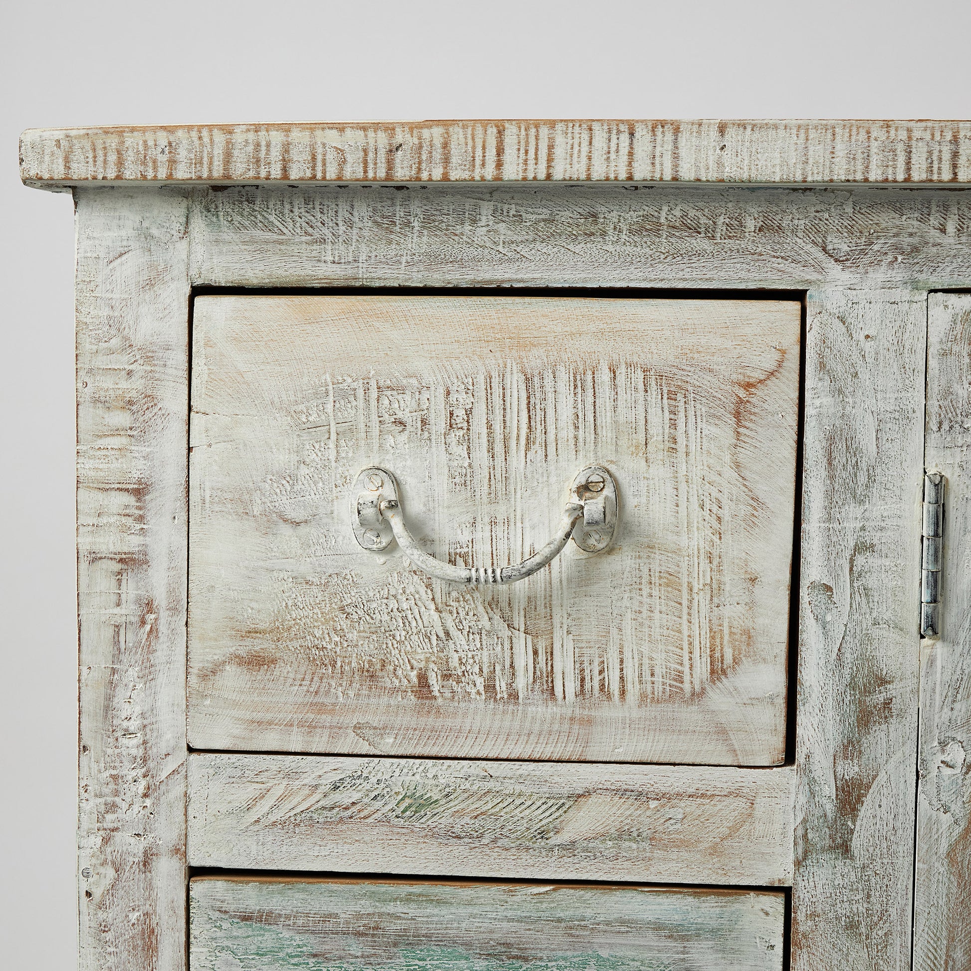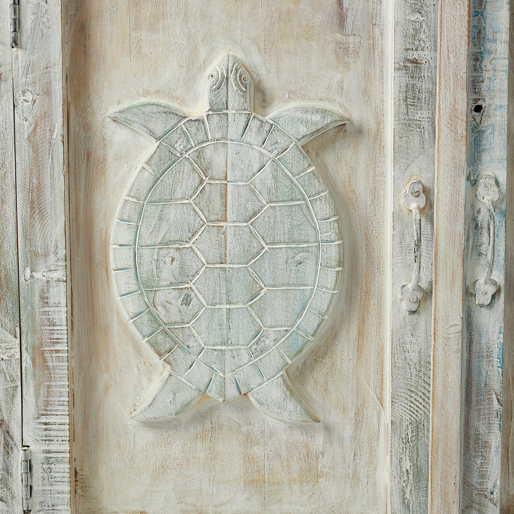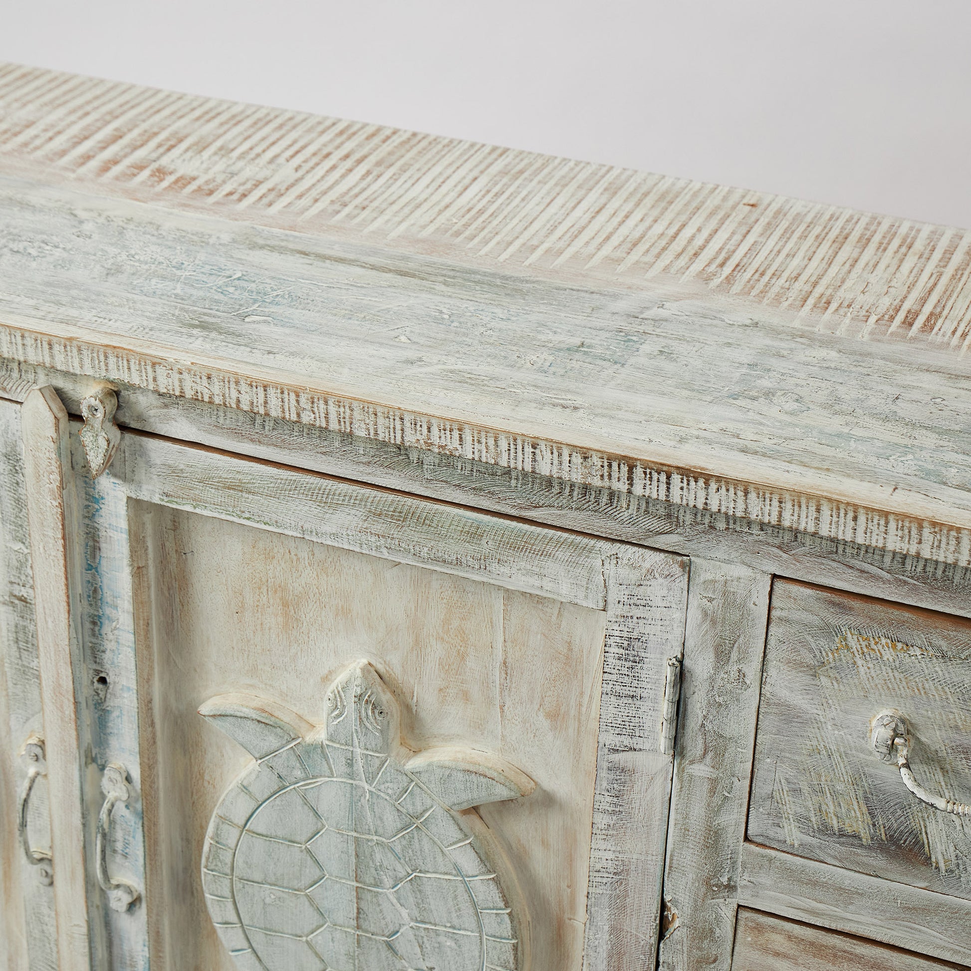 Comodă realizată manual din lemn de mango, decorată cu broaște țestoase sculptate – simbol al înțelepciunii și longevității. Finisajul patinat îi dă un aer autentic și cald. Oferă spațiu generos cu două uși centrale și șase sertare laterale. Practică și decorativă, poate fi integrată în living, dormitor sau chiar în camera unui copil, unde adaugă o notă veselă și originală.