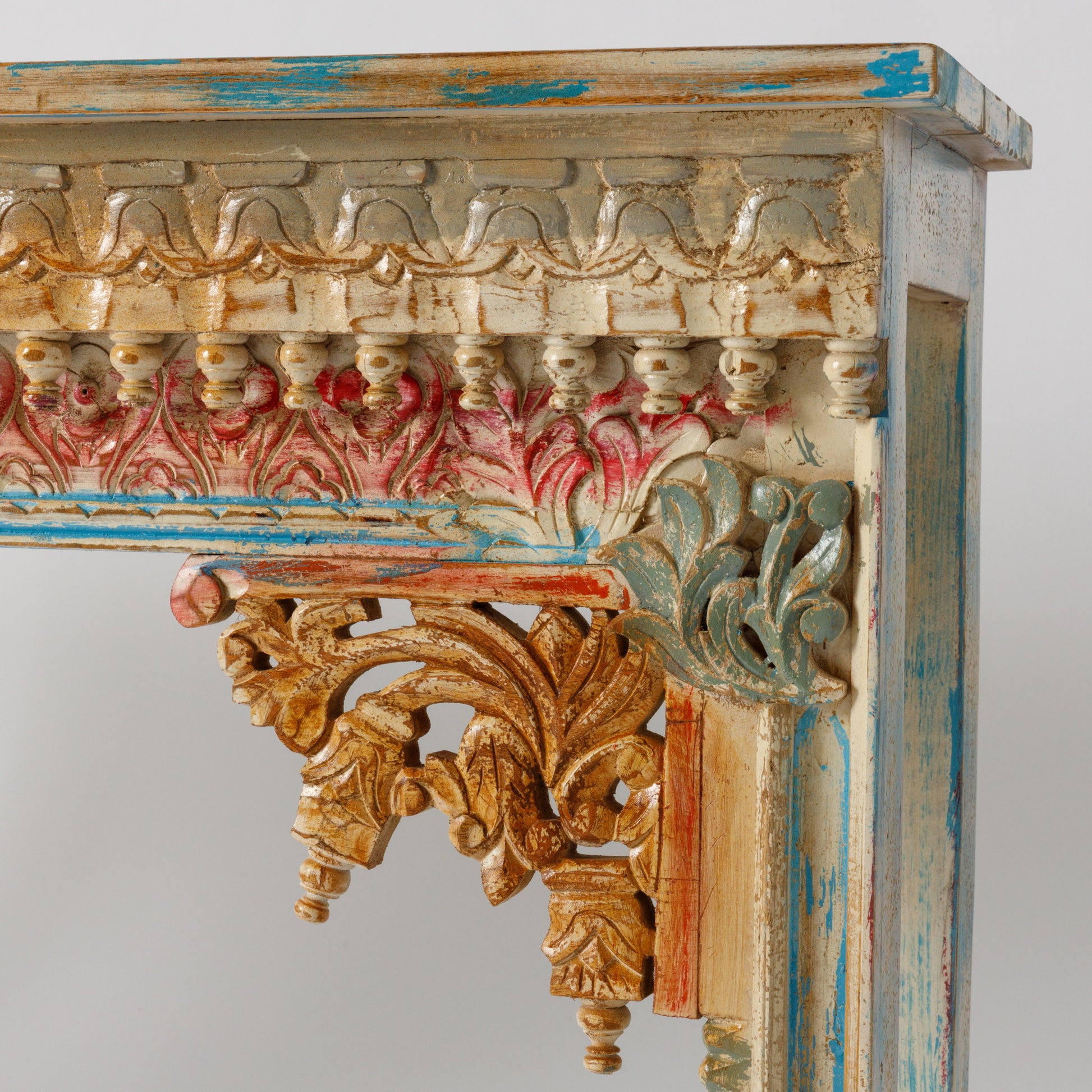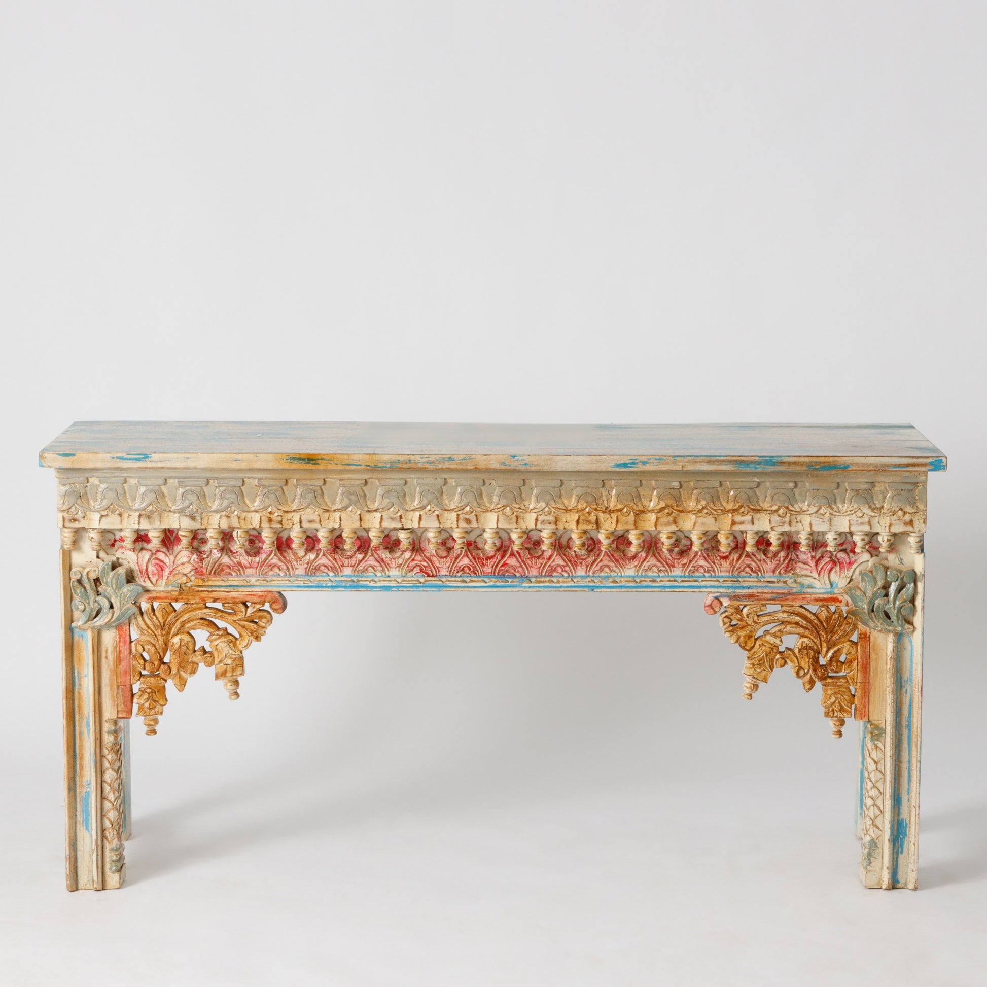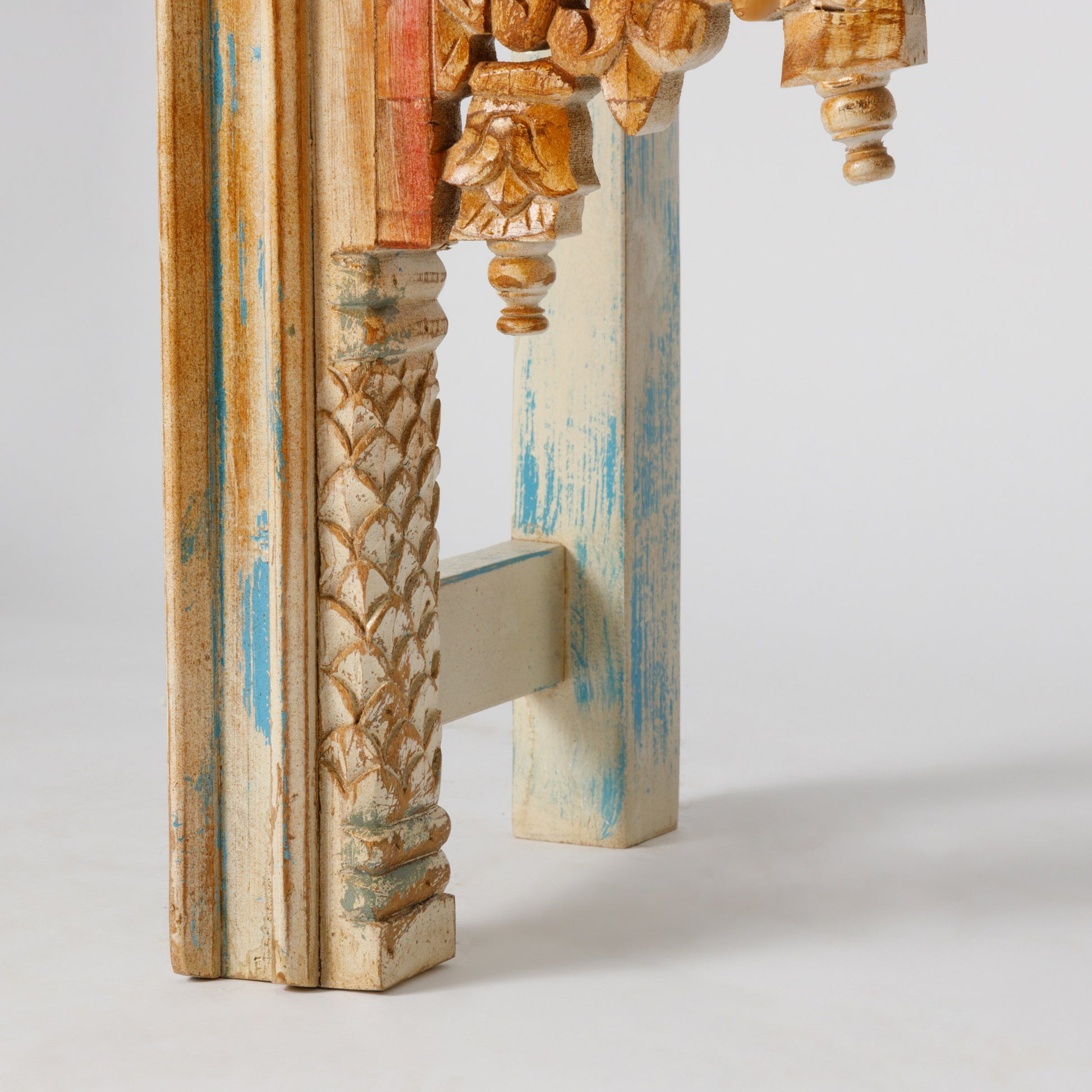 Consolă din lemn de mango, sculptată și pictată manual în nuanțe de roșu, auriu și albastru patinat. Inspirată din meșteșugul tradițional indian, este o piesă statement potrivită pentru un spațiu primitor, un colț de relaxare sau un interior cu accente artistice. Se integrează perfect alături de oglinzi sculptate, decoruri din alamă sau textile orientale. Un mobilier cu poveste, ce aduce culoare și unicitate în decor.