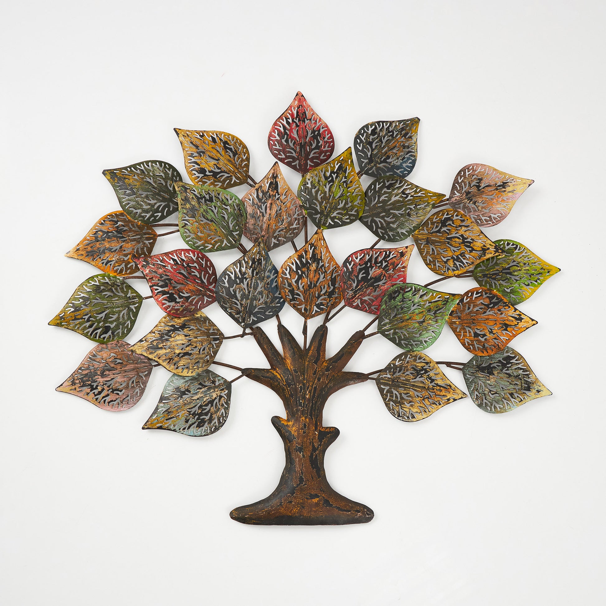 Copac decorativ din metal, realizat cu frunze colorate în nuanțe de roșu, verde, auriu și bronz. Este o piesă de perete care adaugă un efect vizual plăcut și poate fi așezată în living, pe hol sau într-un birou, pentru a înveseli spațiul.