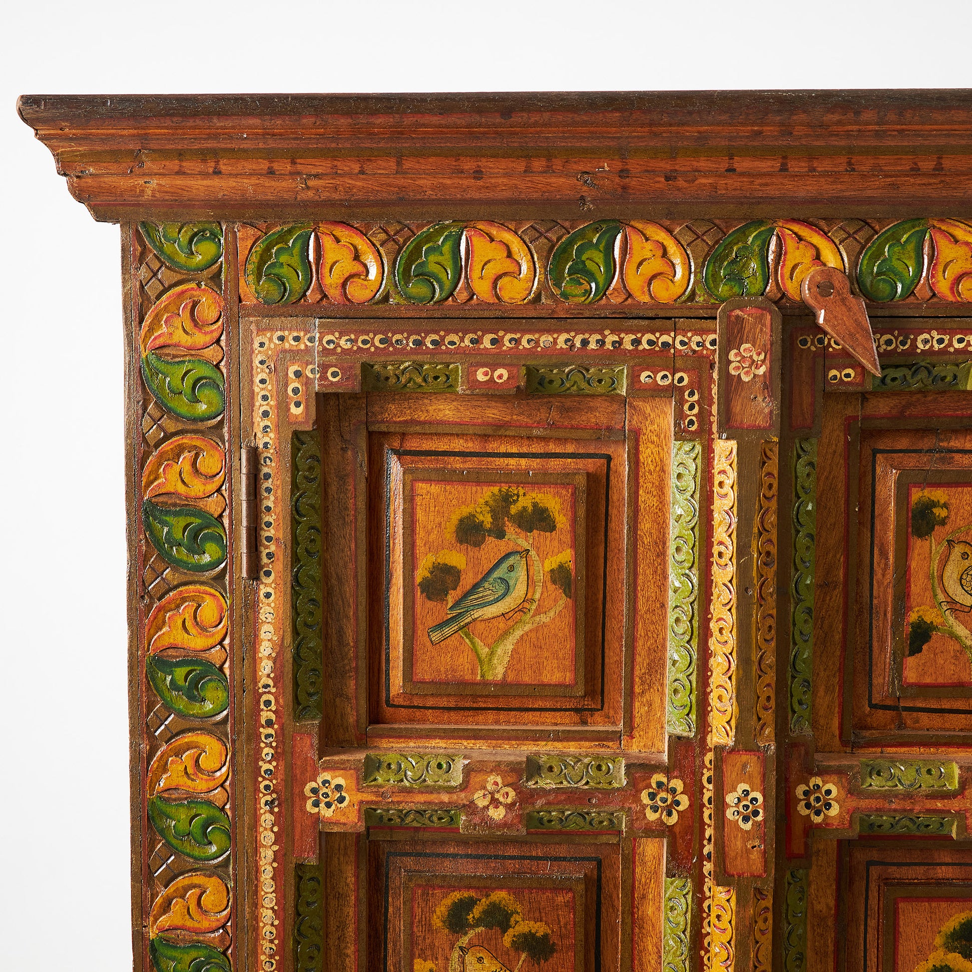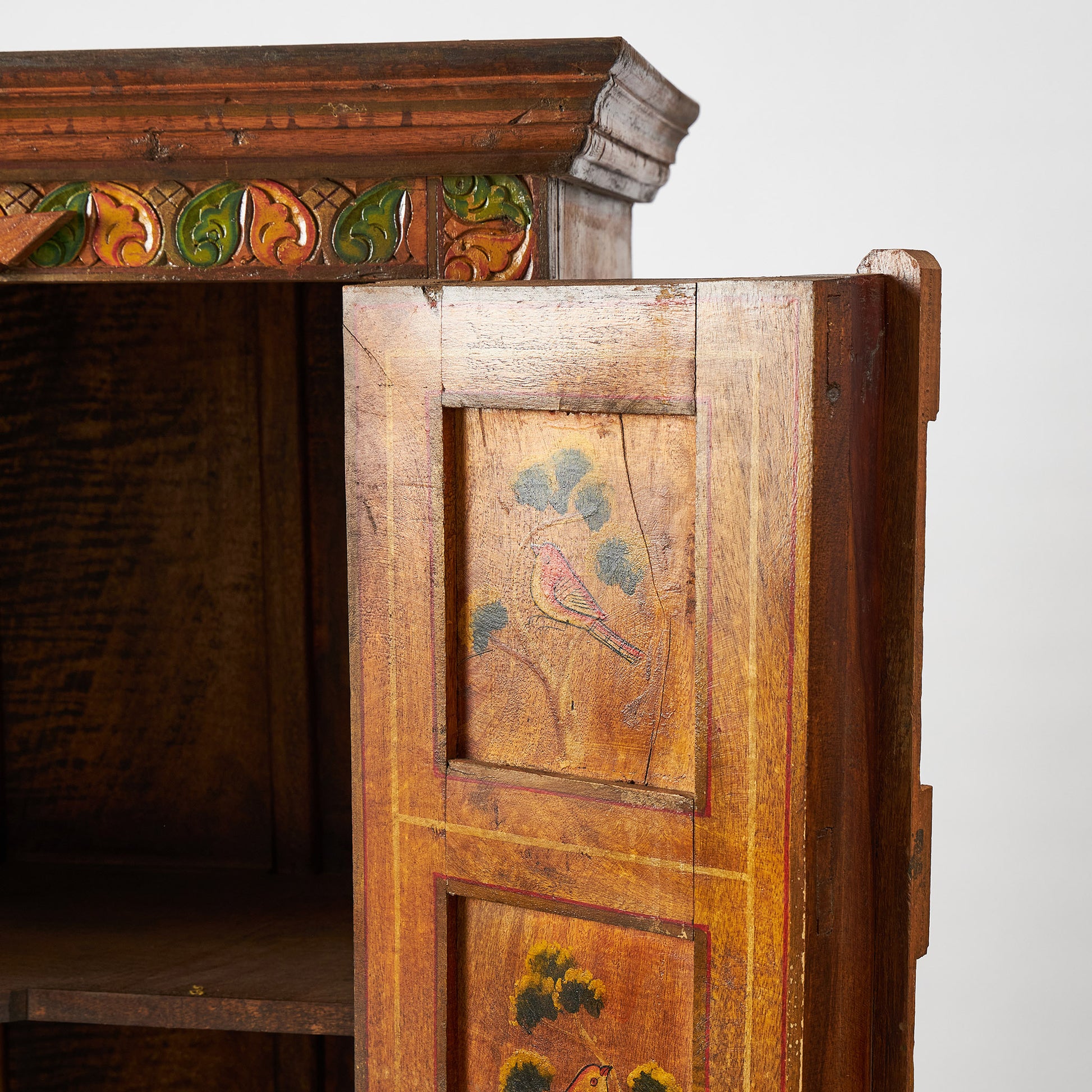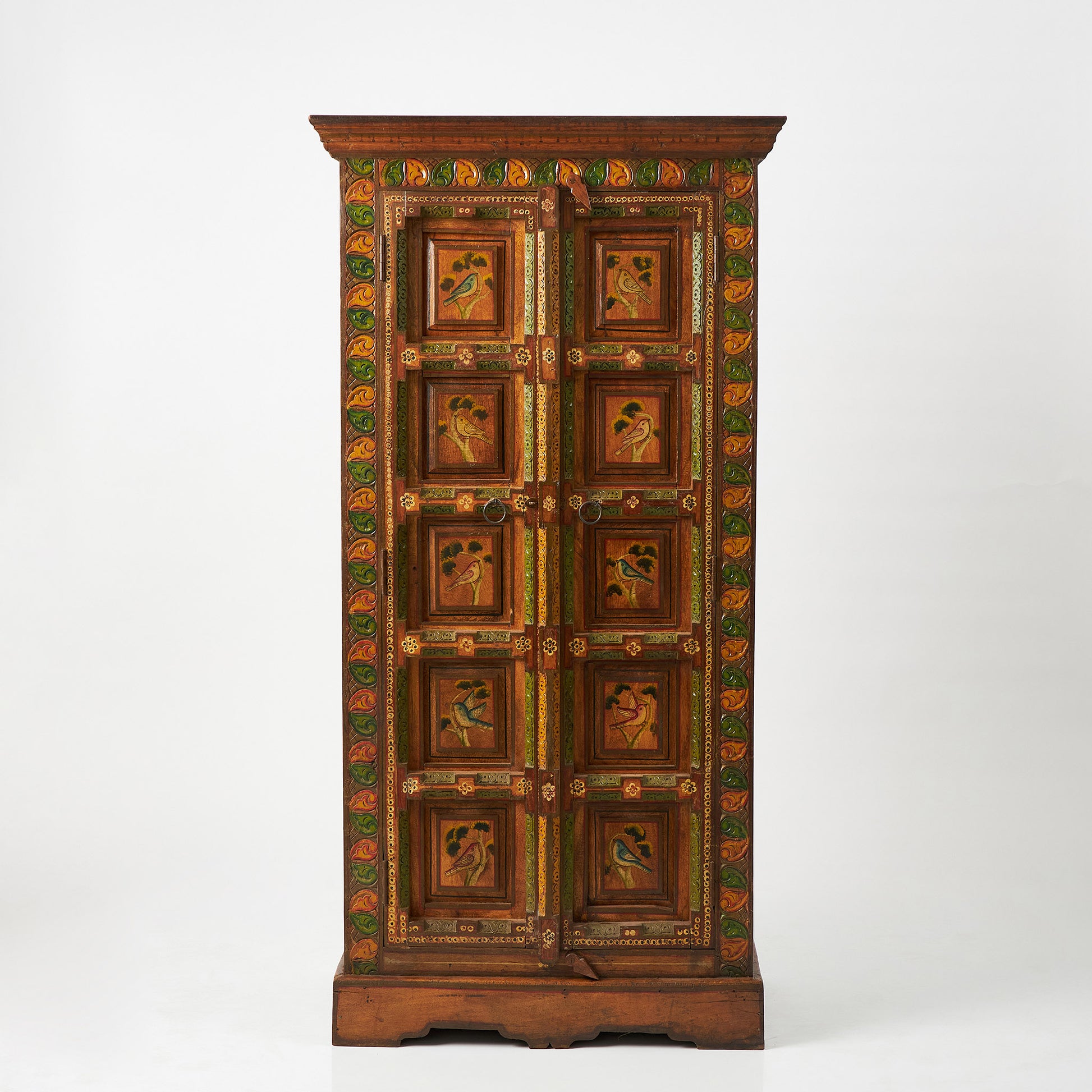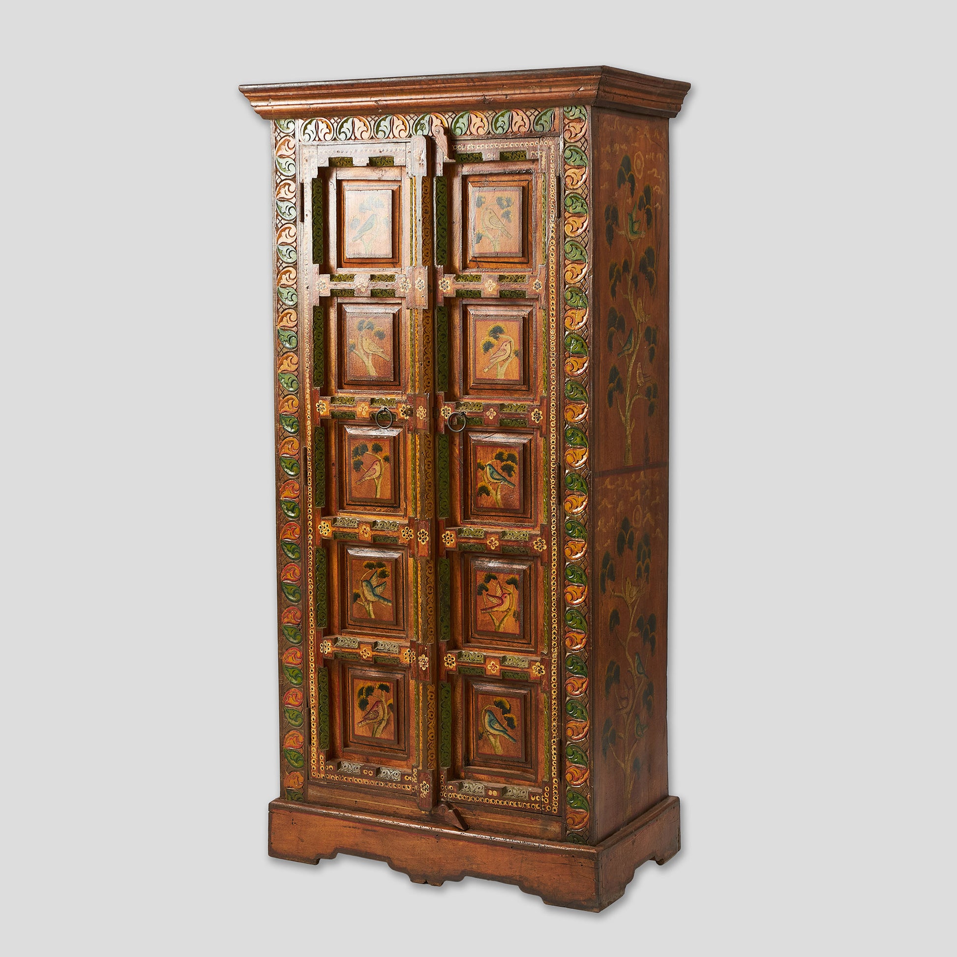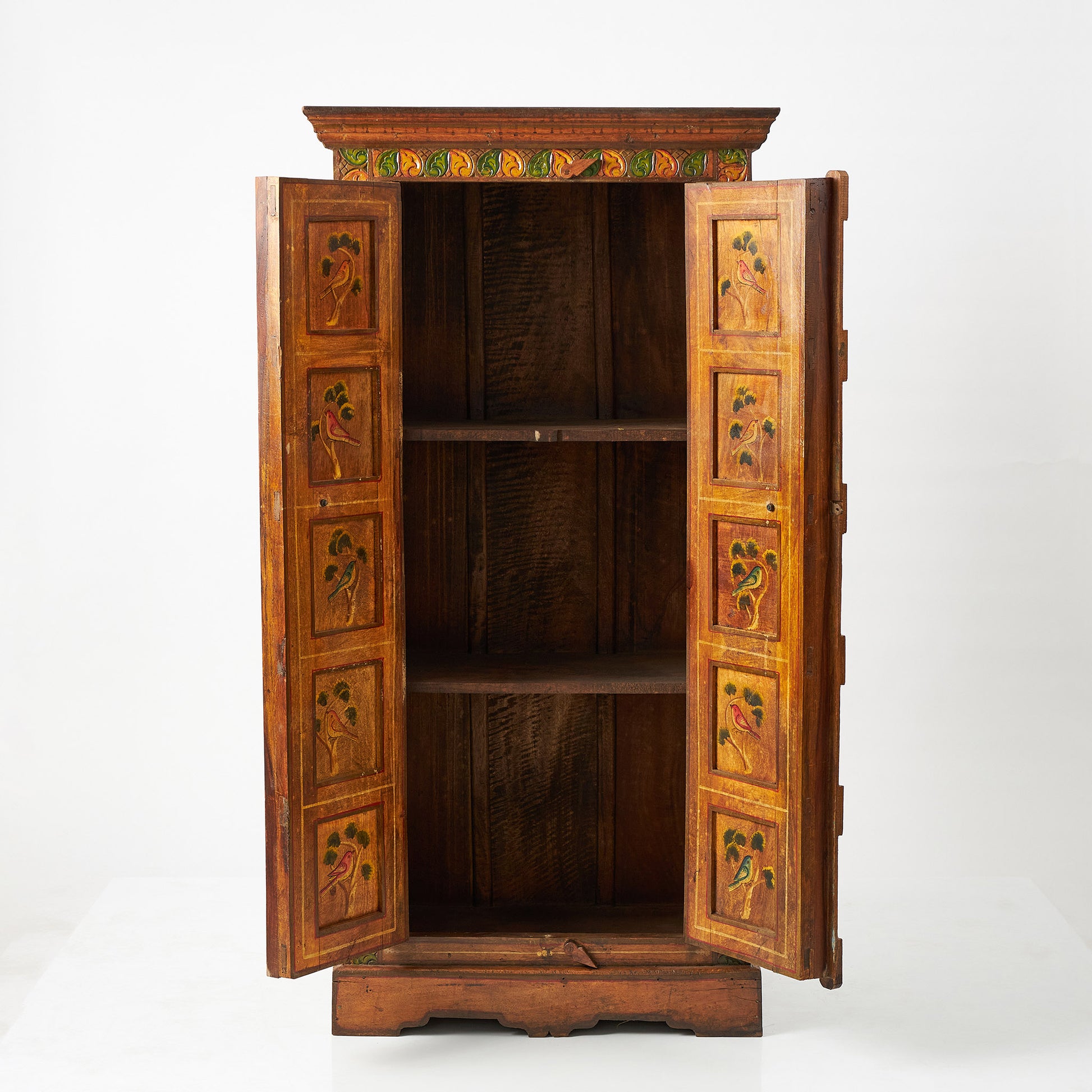Un dulap spectaculos, realizat manual din lemn de mango și decorat cu picturi tradiționale indiene în tonuri calde. Ușile masive cu panouri pictate îi dau un aer autentic și artistic. Interiorul oferă spațiu practic pentru depozitare, iar exteriorul transformă piesa într-un accent decorativ deosebit. Poate fi integrat într-un birou de acasă, într-o bibliotecă personală sau chiar într-un spațiu comercial, unde atrage imediat privirea.