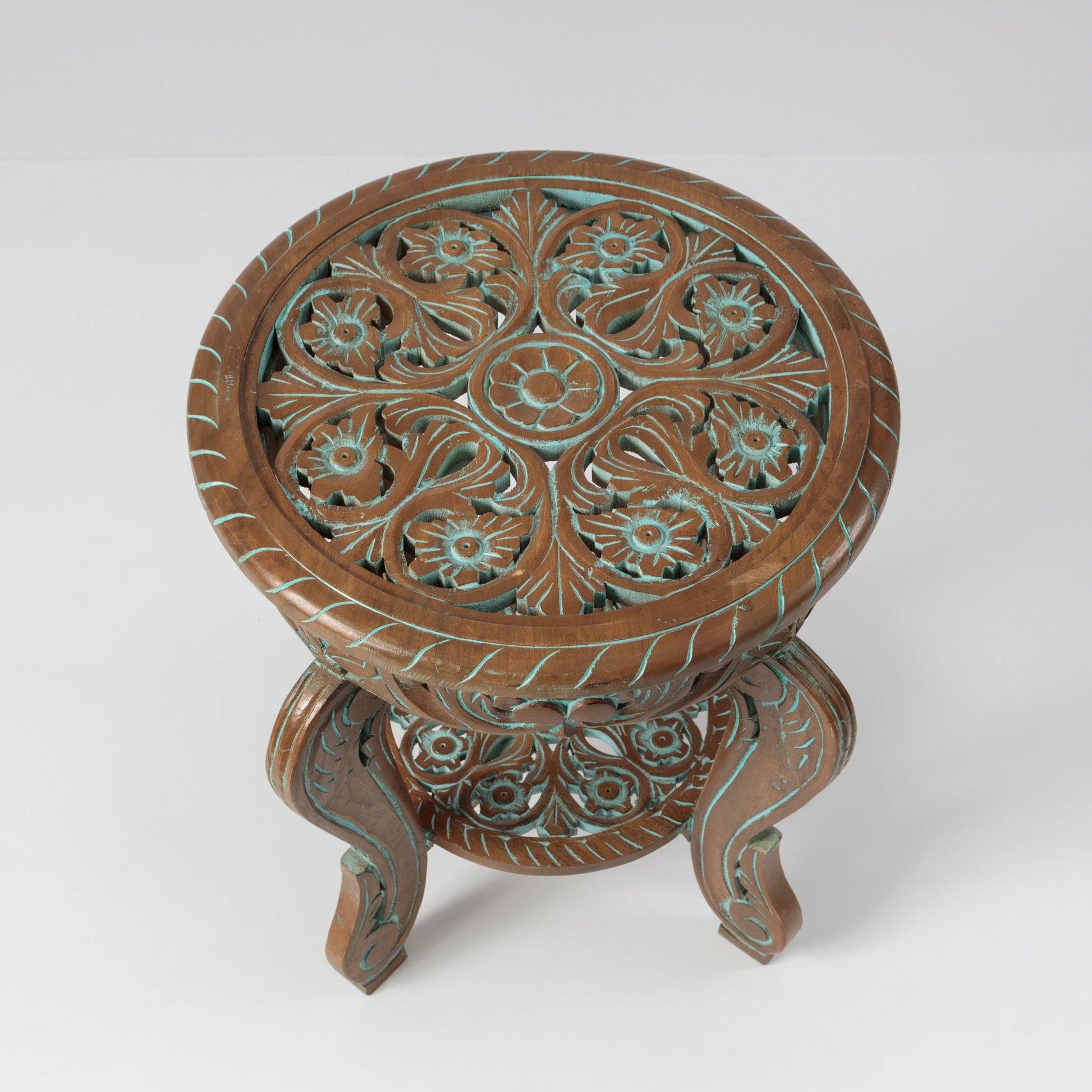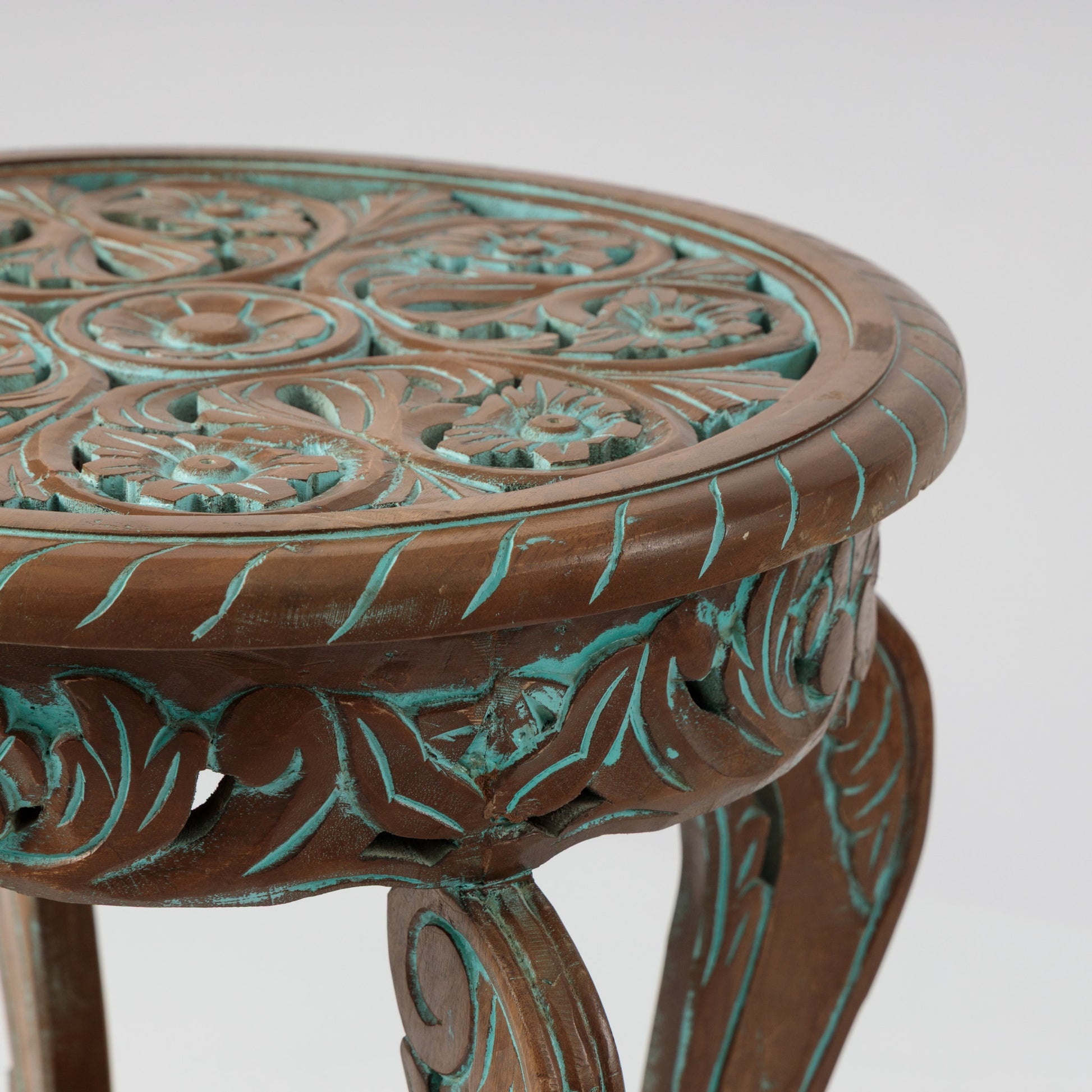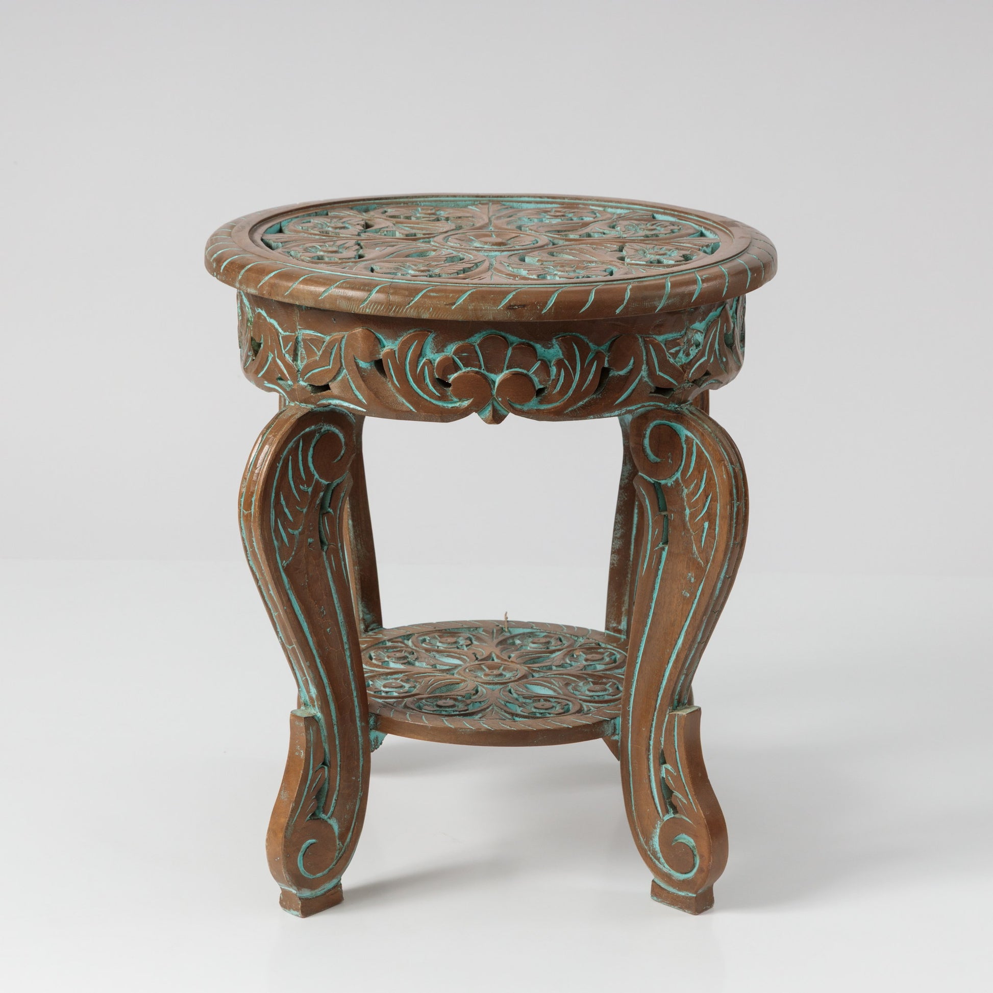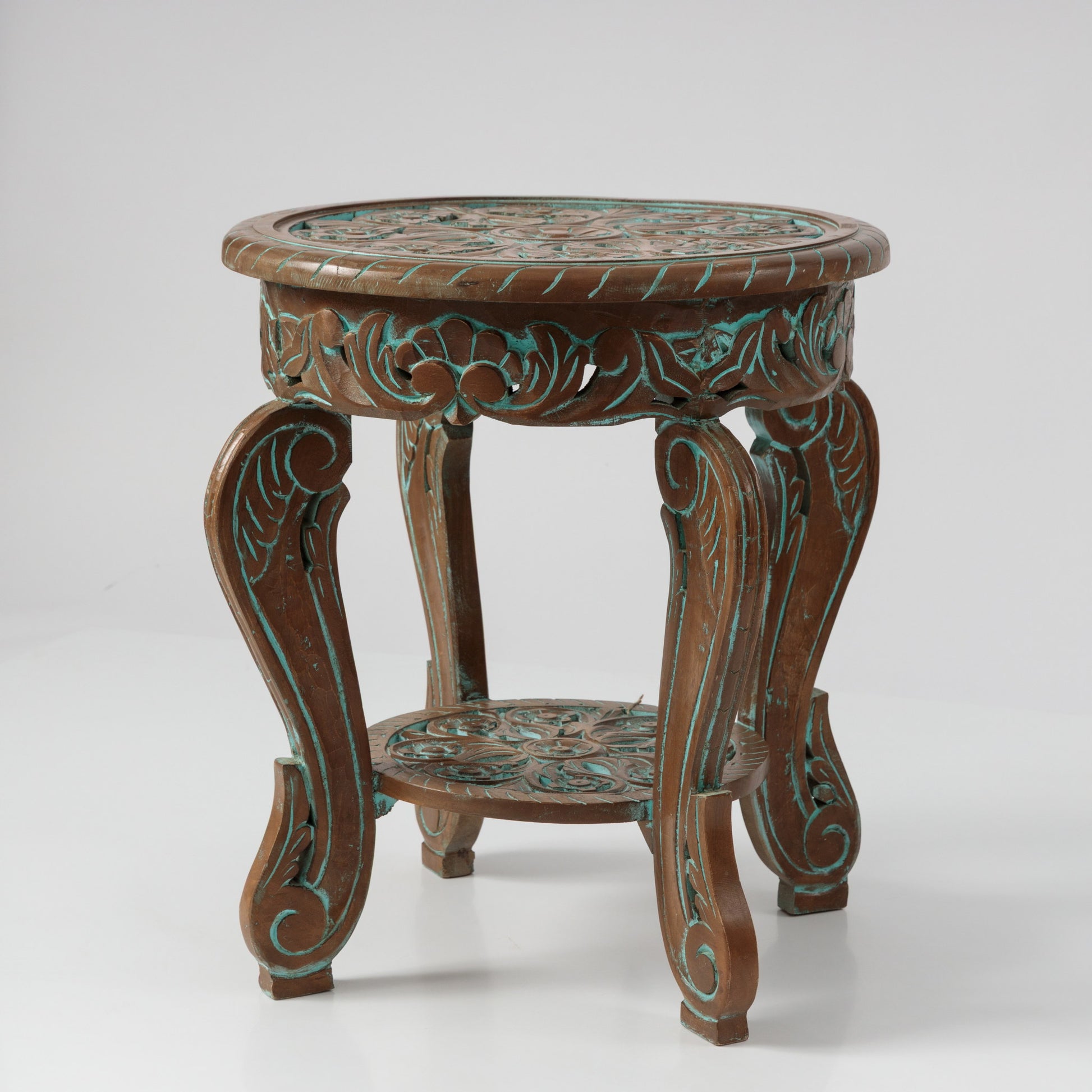 Această masă atrage imediat atenția prin detaliile sculptate cu măiestrie și prin nuanțele discrete de turcoaz care se întrepătrund cu lemnul natural. Designul este echilibrat și fluid, cu picioare arcuite și o poliță suplimentară sculptată. Poți să o așezi într-un colț de relaxare, lângă un fotoliu sau o canapea, în hol, lângă o lampă, sau chiar într-un spațiu comercial, într-o cafenea, un studio sau o recepție.