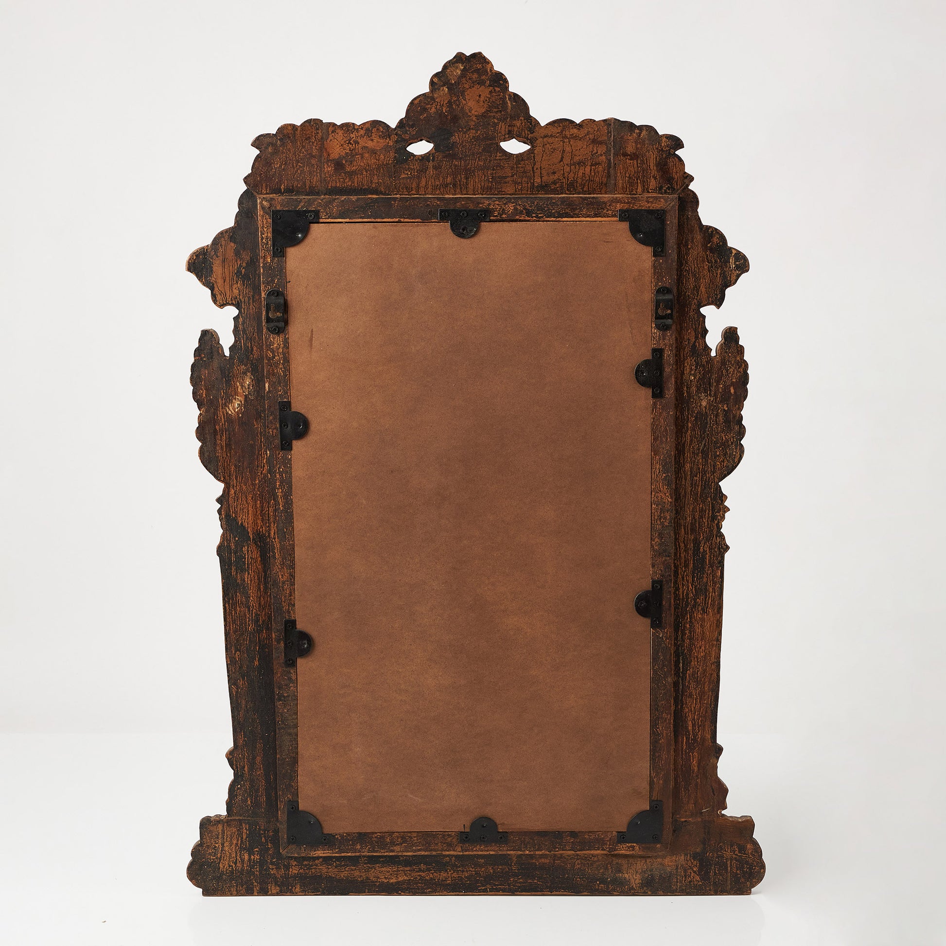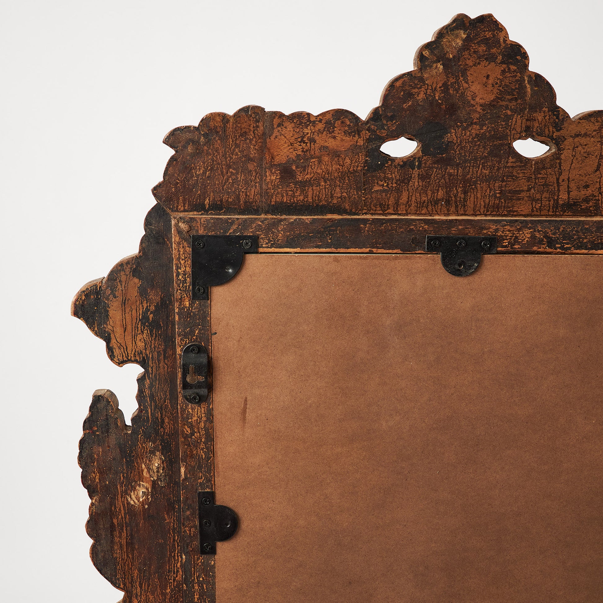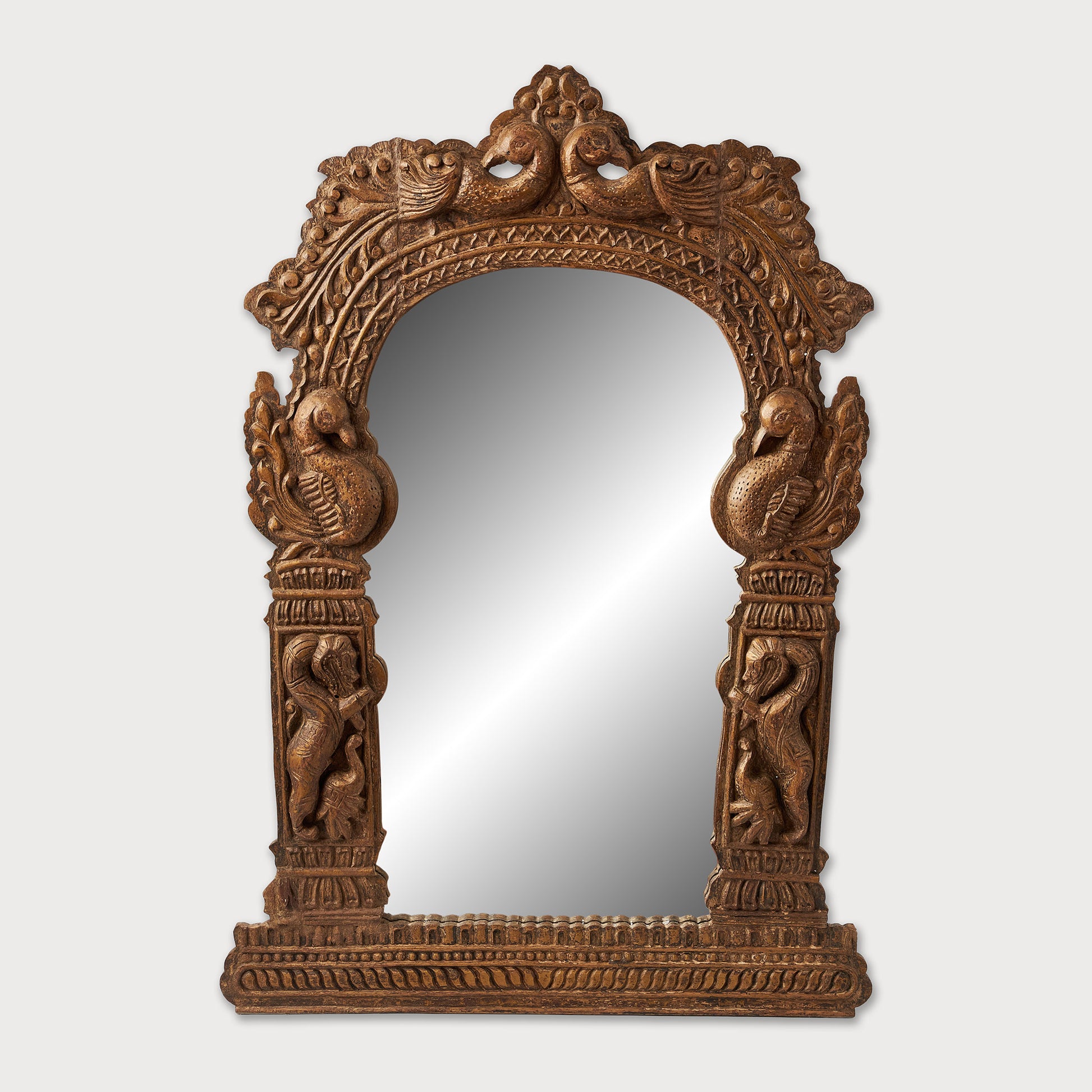 Oglindă cu ramă din lemn, sculptată manual cu detalii de păsări și motive decorative. Este o piesă deosebită care poate fi pusă pe un perete din living, dormitor sau hol, adăugând un accent aparte în decor.
