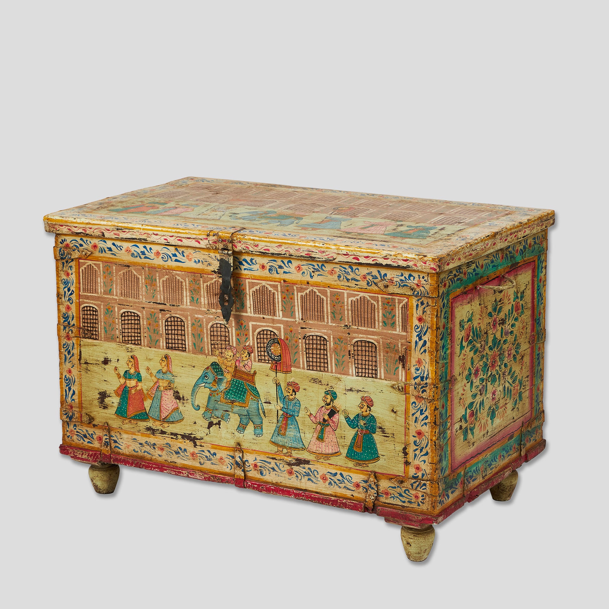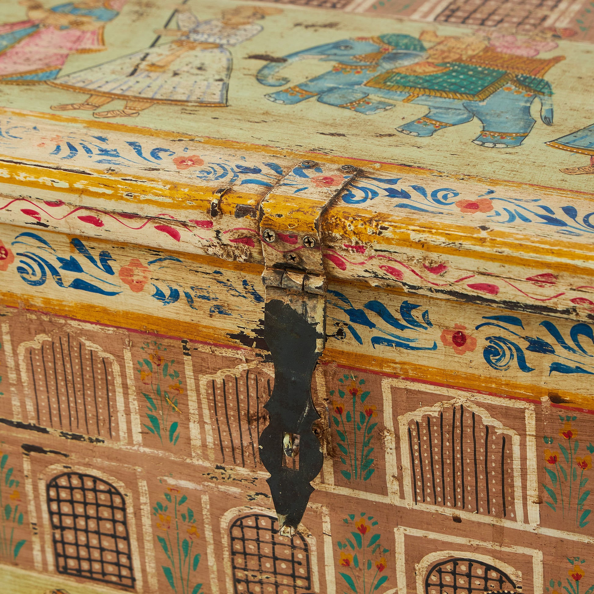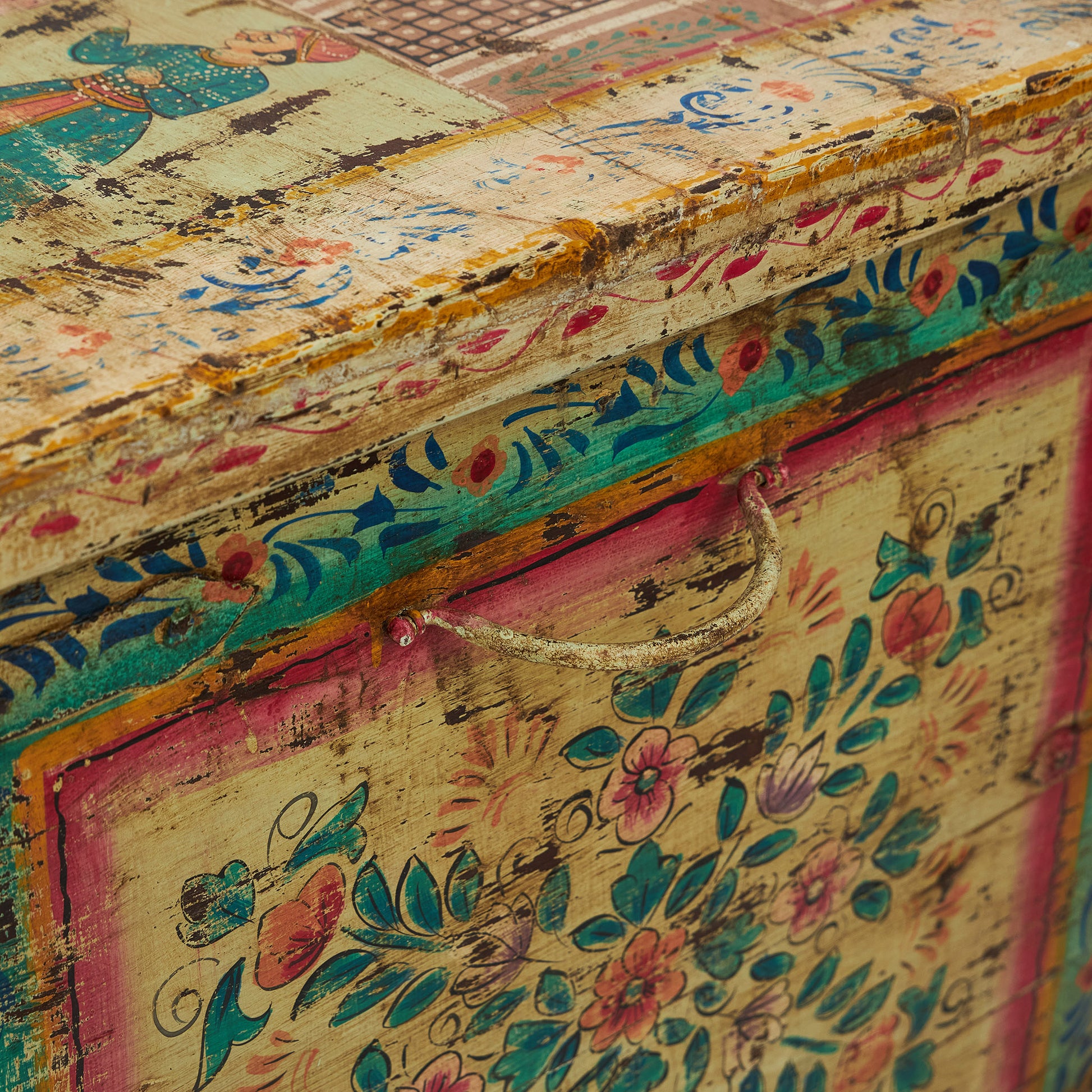 Cufăr realizat manual din lemn, pictat cu scene tradiționale indiene. Oferă spațiu generos pentru depozitare și are un aspect decorativ deosebit. Poate fi folosit pentru a păstra perne, pături sau lenjerii în dormitor, lângă canapea în living sau ca spațiu de depozitare la intrare. De asemenea, poate fi o piesă de accent într-un showroom sau într-un spațiu comercial