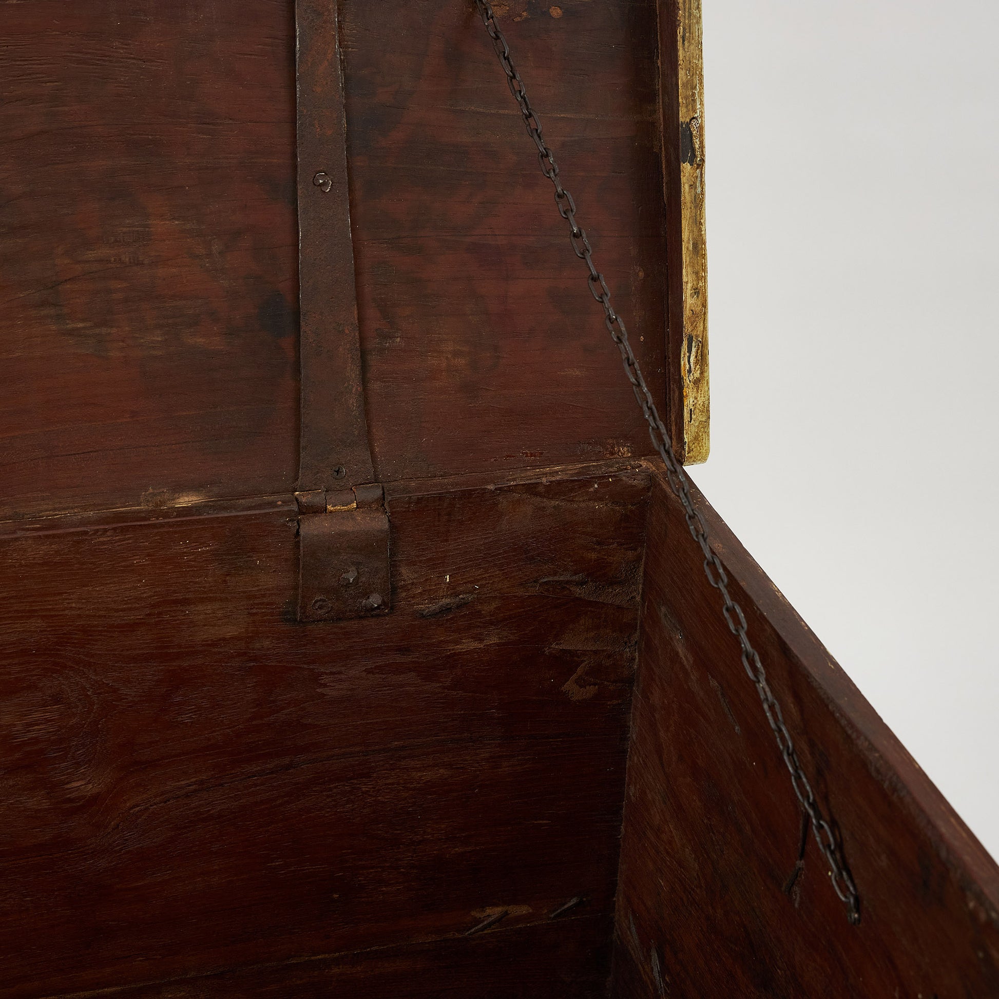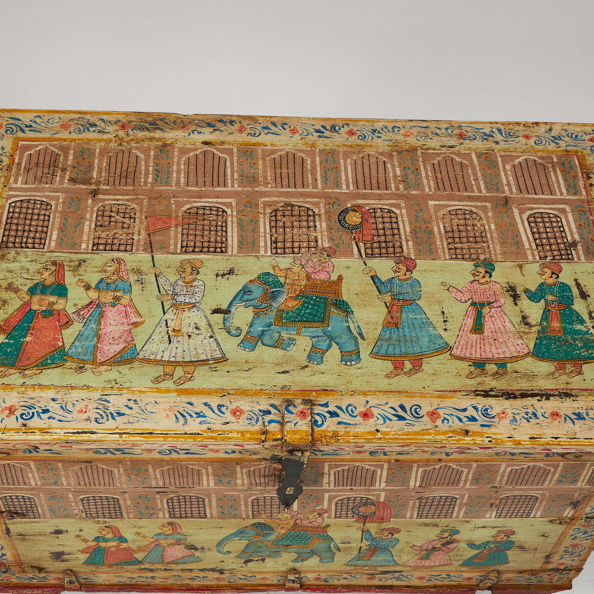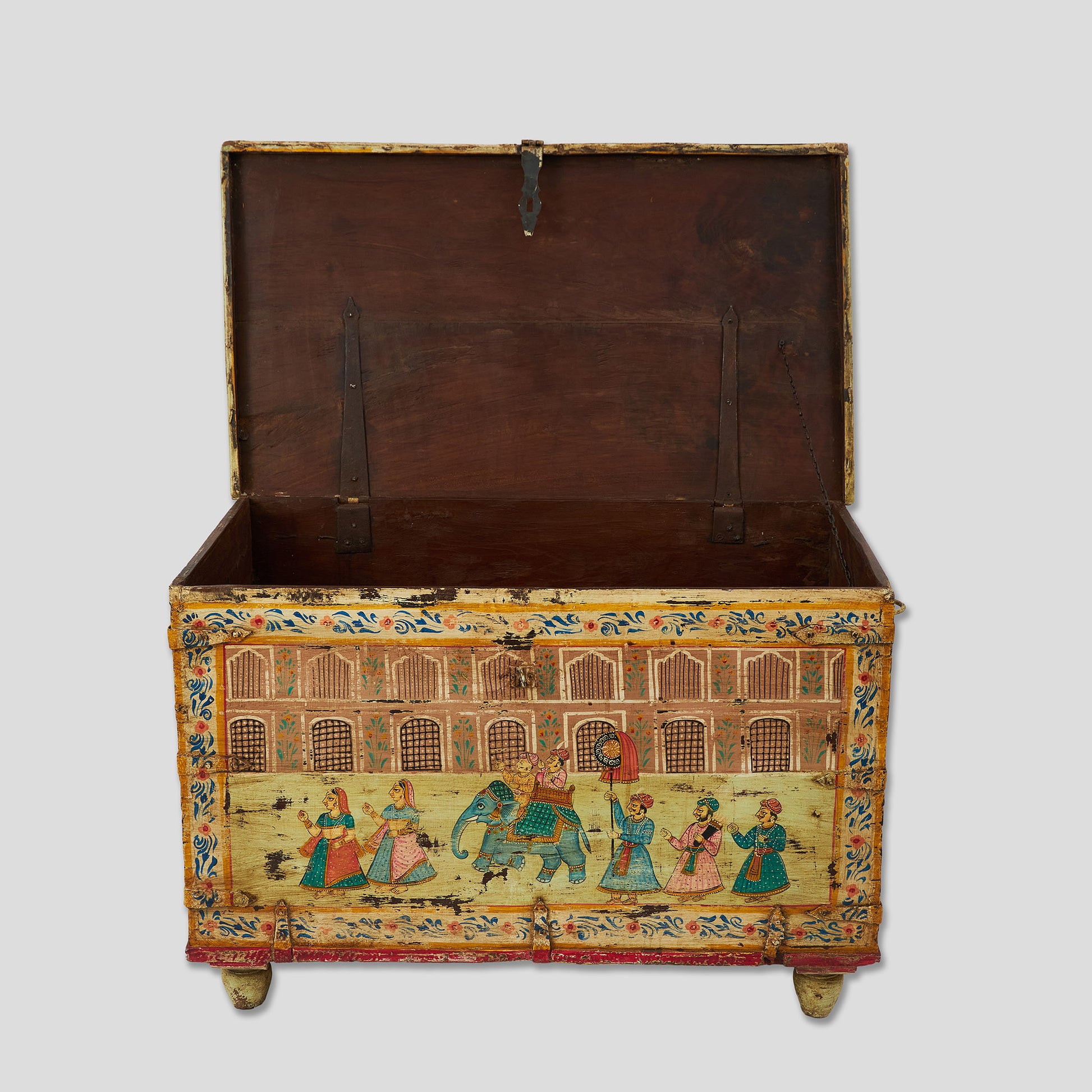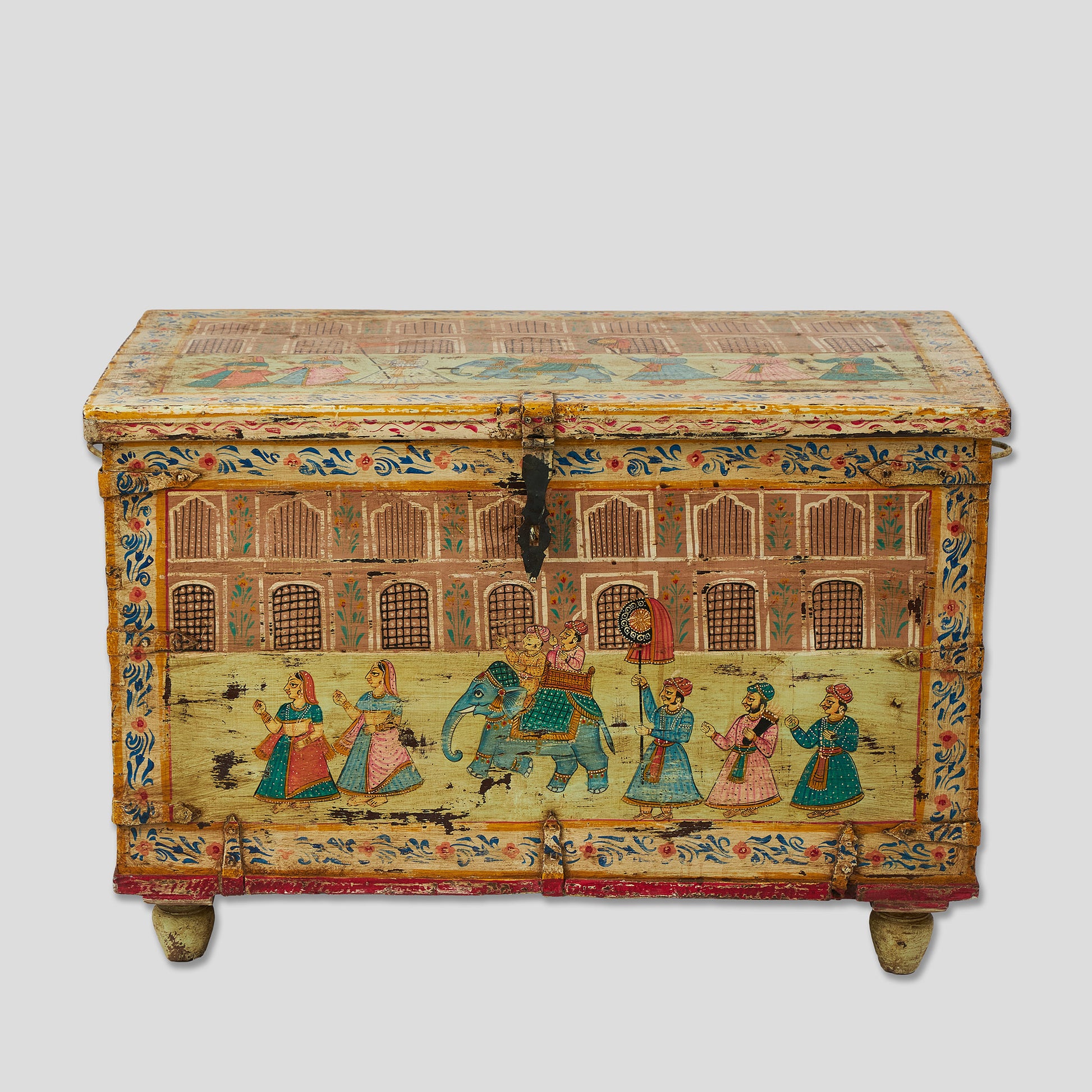 Cufăr realizat manual din lemn, pictat cu scene tradiționale indiene. Oferă spațiu generos pentru depozitare și are un aspect decorativ deosebit. Poate fi folosit pentru a păstra perne, pături sau lenjerii în dormitor, lângă canapea în living sau ca spațiu de depozitare la intrare. De asemenea, poate fi o piesă de accent într-un showroom sau într-un spațiu comercial