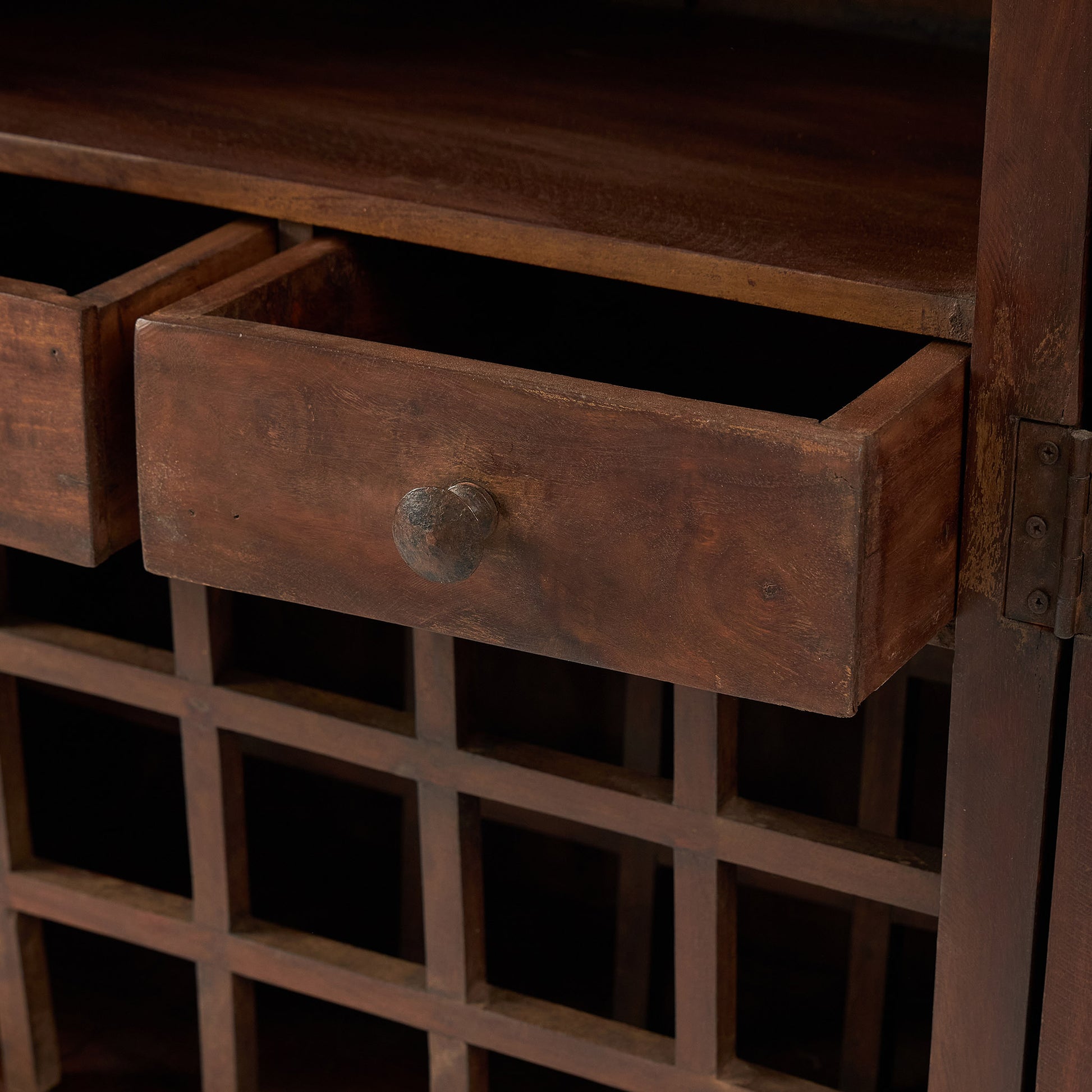 Realizat manual din lemn masiv de tec, acest bar modular îmbină designul autentic cu funcționalitatea. La exterior, păstrează linii simple și elegante, iar la interior dezvăluie spații bine gândite: suport pentru sticle, rafturi și sertare pentru accesorii. Practic și versatil, poate fi folosit atât în living, cât și într-un spațiu de socializare, oferind un mod elegant de a organiza și expune colecția de băuturi.