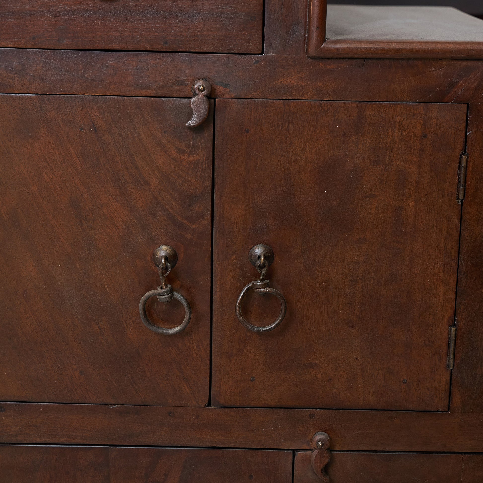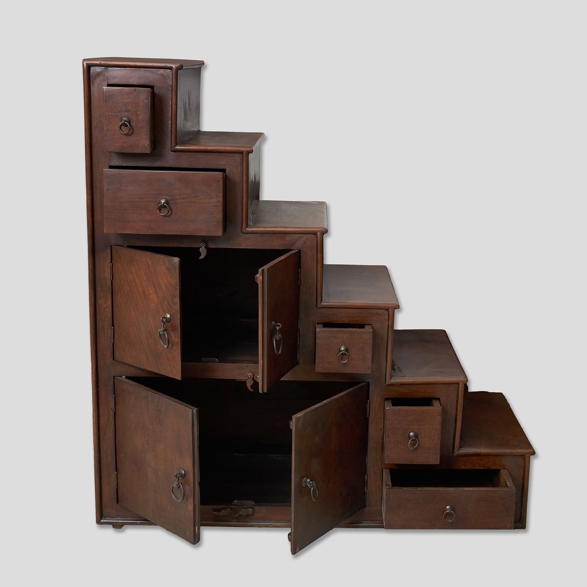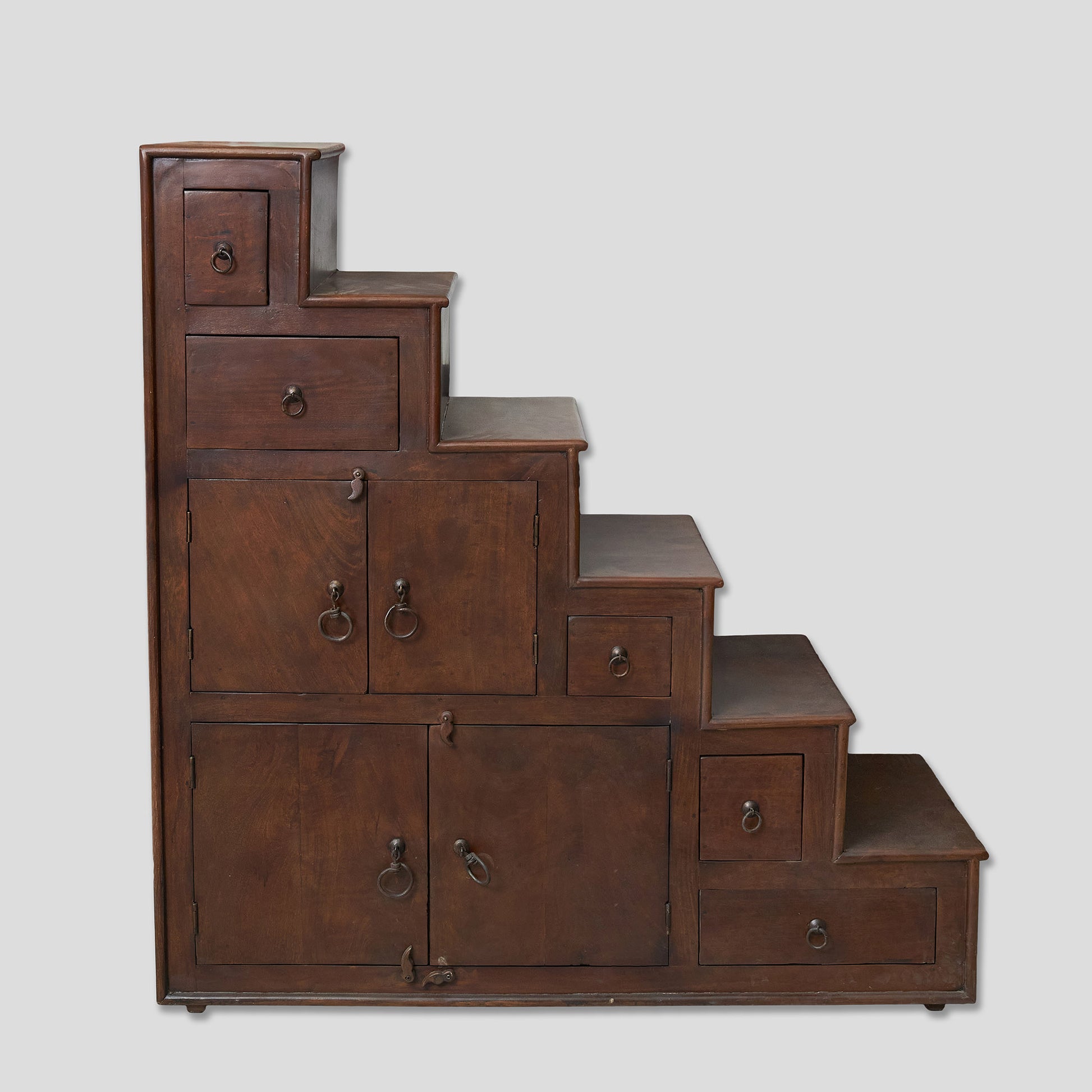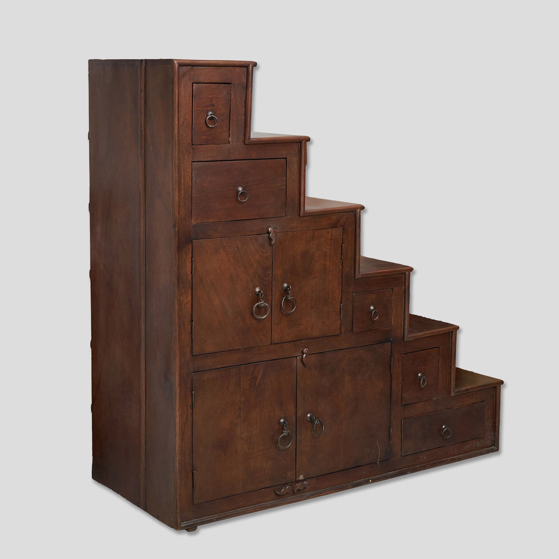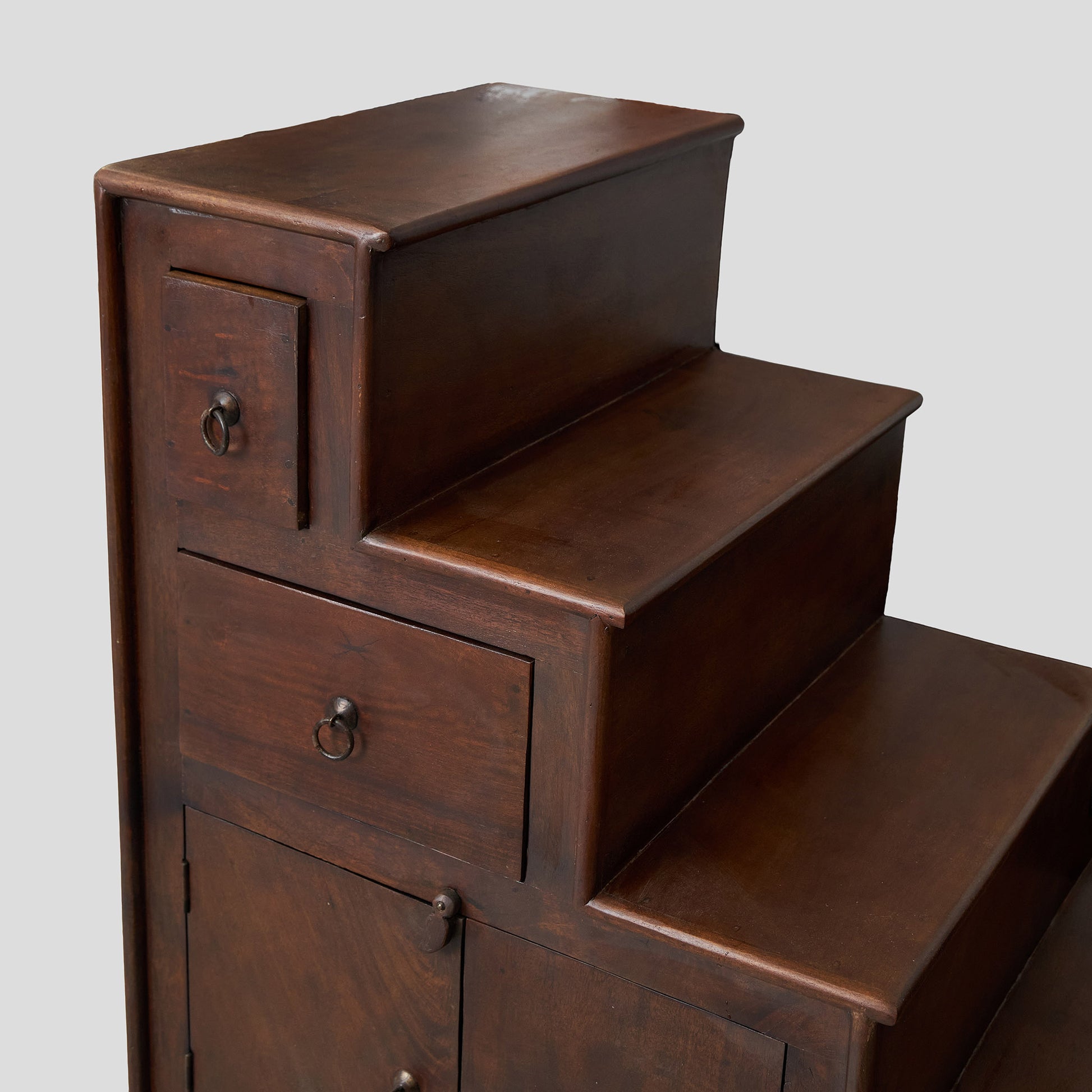 Comodă realizată din lemn masiv de tec, cu un design inspirat din mobilierul tradițional asiatic. Dispune de mai multe sertare și uși, dispuse pe nivele ca niște trepte, oferind atât spațiu de depozitare, cât și un efect decorativ original. Poate fi folosită în living, hol sau dormitor, dar și ca piesă de accent într-un birou sau showroom, unde aduce un plus de personalitate și funcționalitate.
