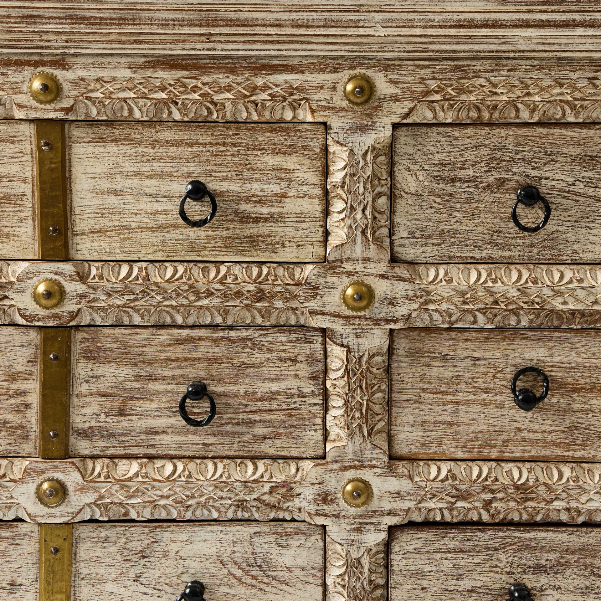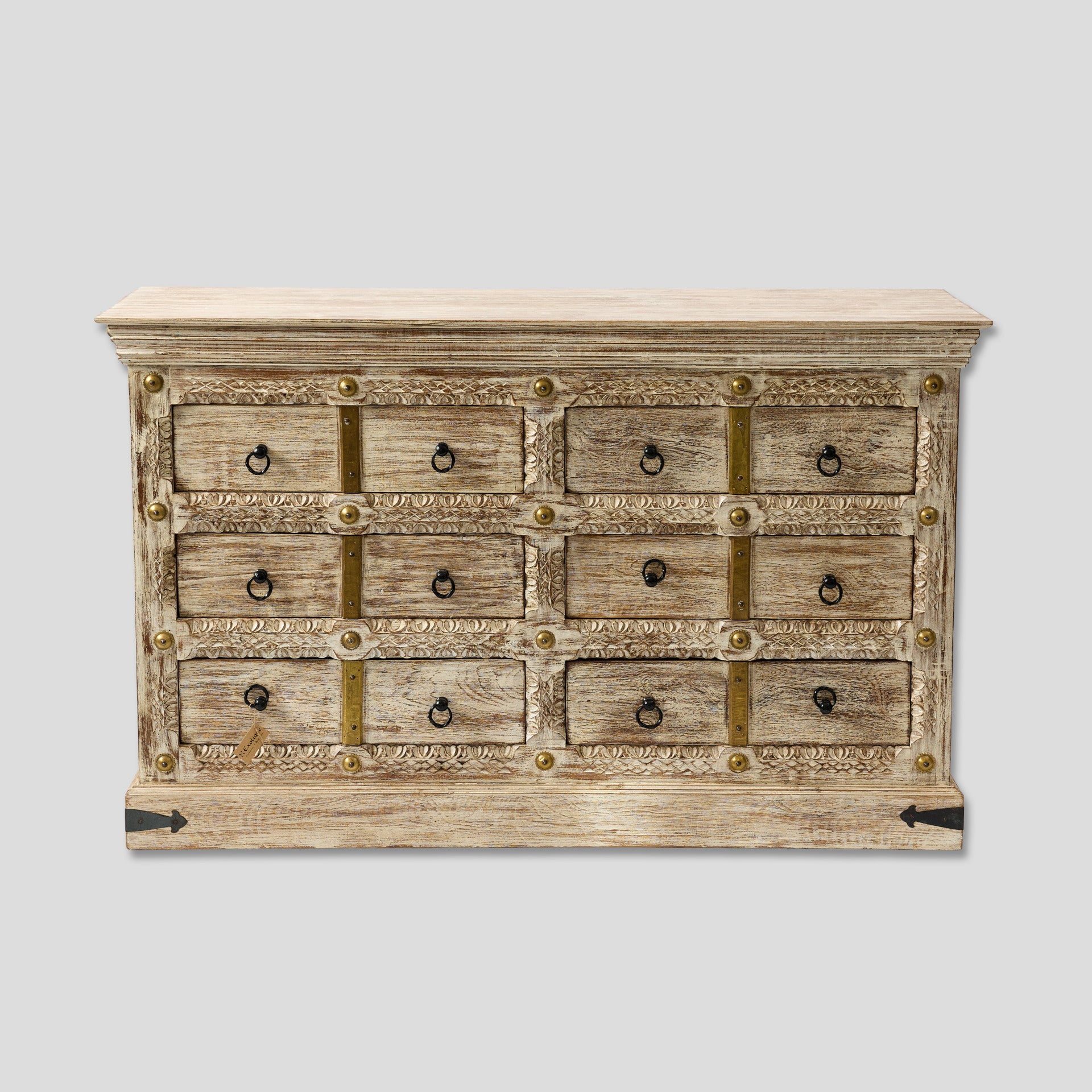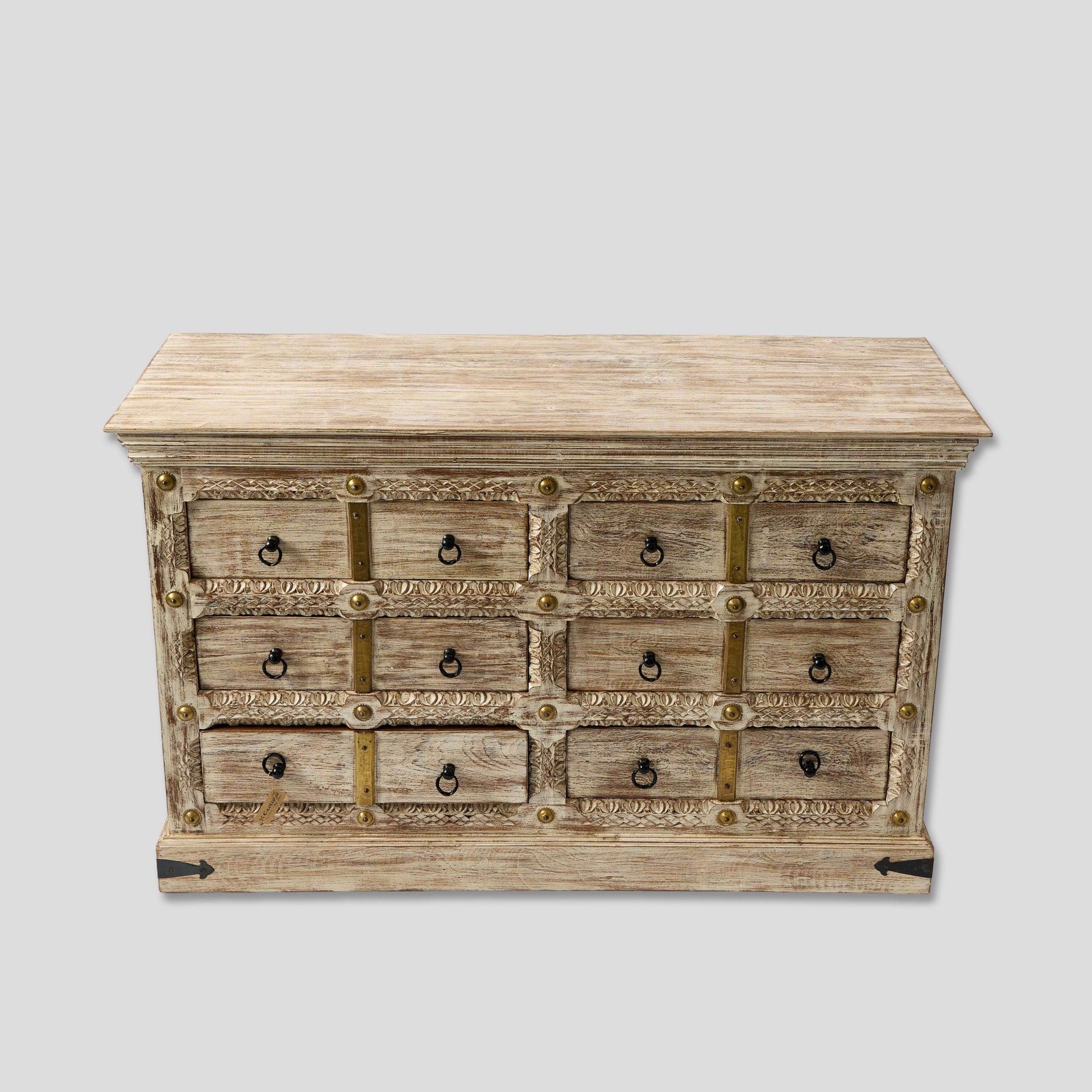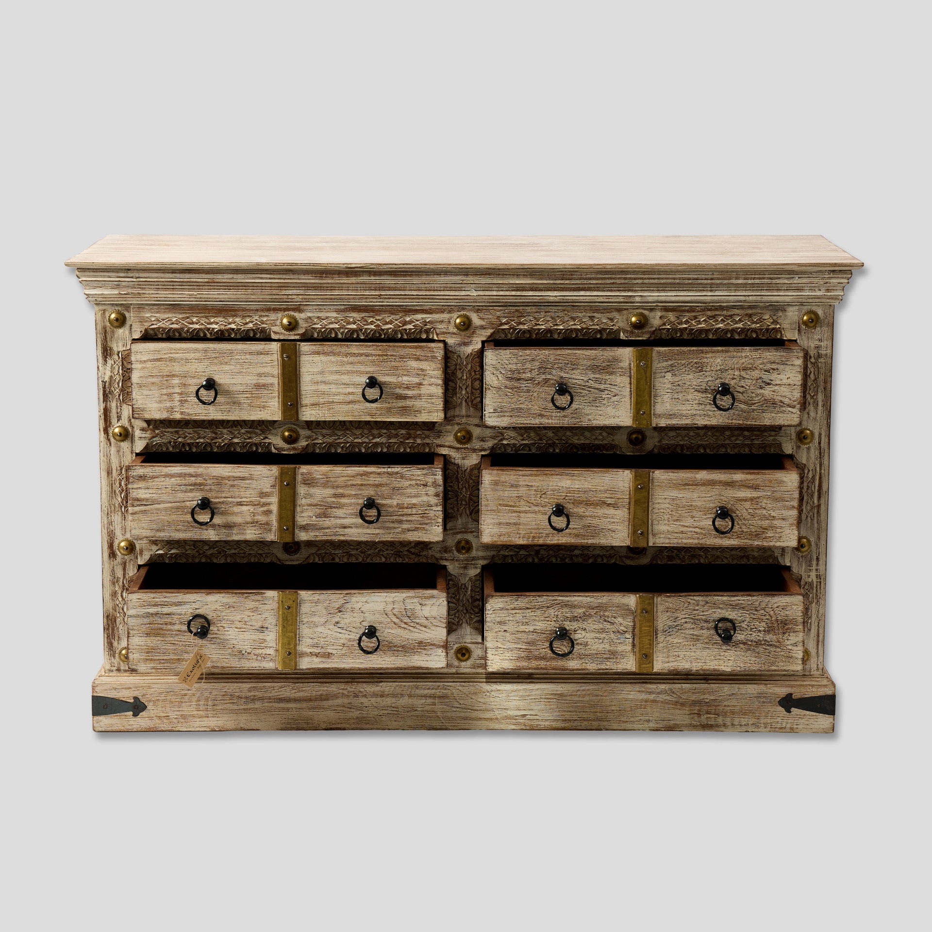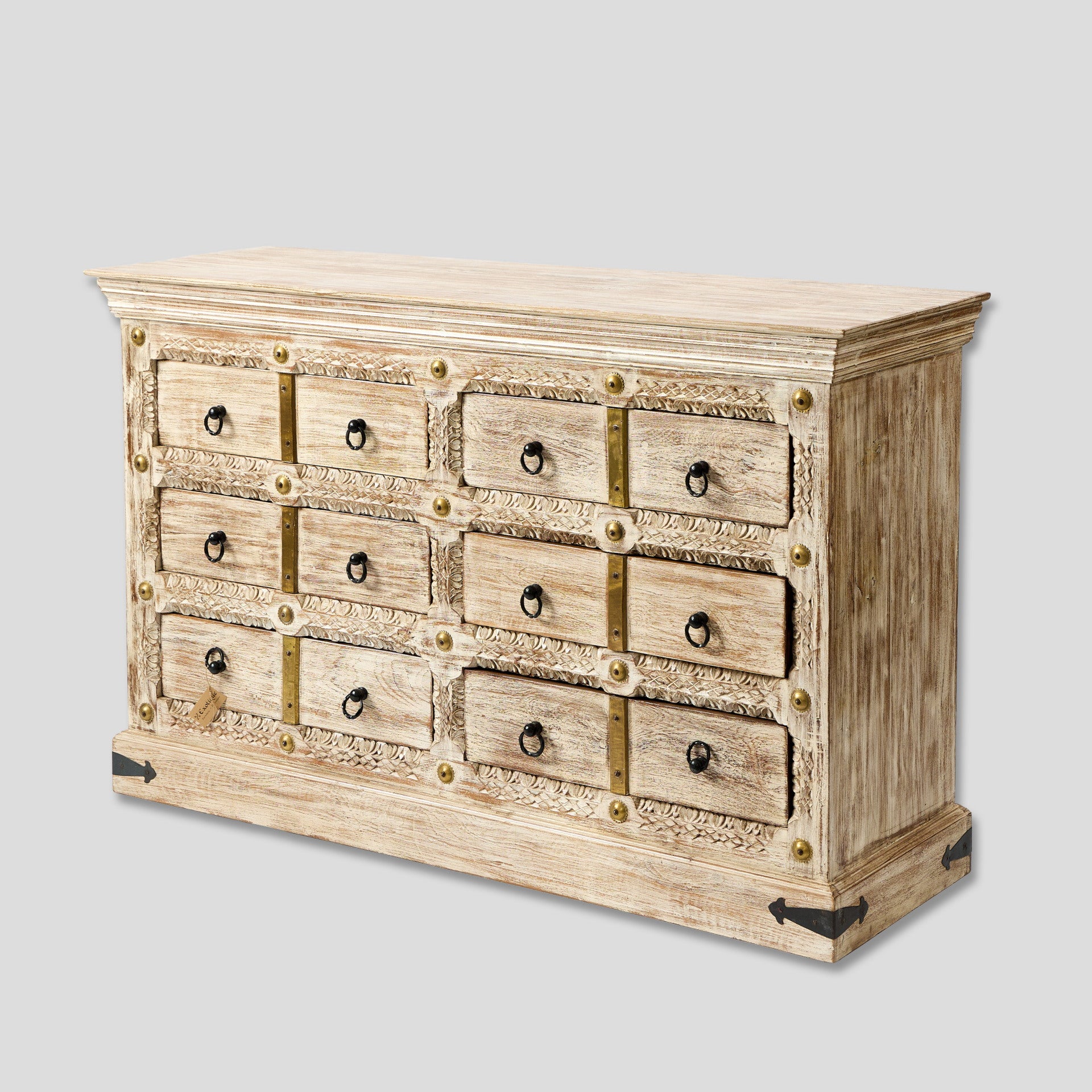 Comodă realizată din lemn de mango, prevăzută cu mai multe sertare pentru depozitare. Fronturile sunt decorate cu detalii sculptate și elemente metalice, care evidențiază aspectul natural al lemnului. Această comodă din lemn de mango poate fi folosită în living, dormitor sau pe hol pentru organizarea diferitelor obiecte. Sertarele oferă spațiu pentru haine, documente sau alte lucruri pe care vrei să le păstrezi la îndemână. Comoda din lemn cu sertare poate fi integrată ușor în locuințe, pensiuni, hoteluri sau alte spații amenajate cu mobilier din lemn. Este potrivită atât pentru depozitare, cât și ca piesă decorativă în cameră.