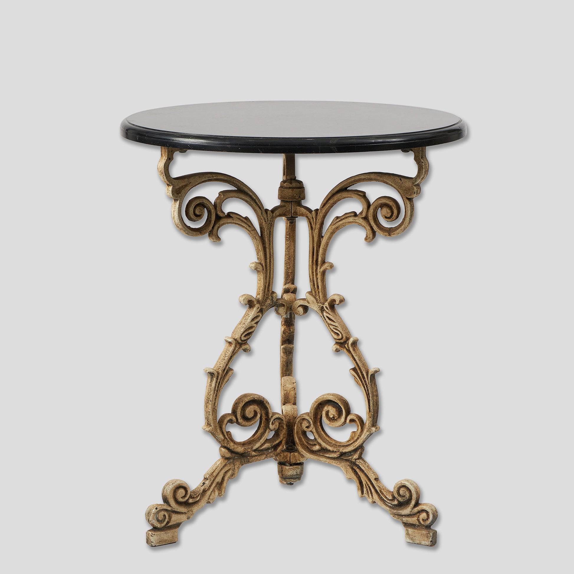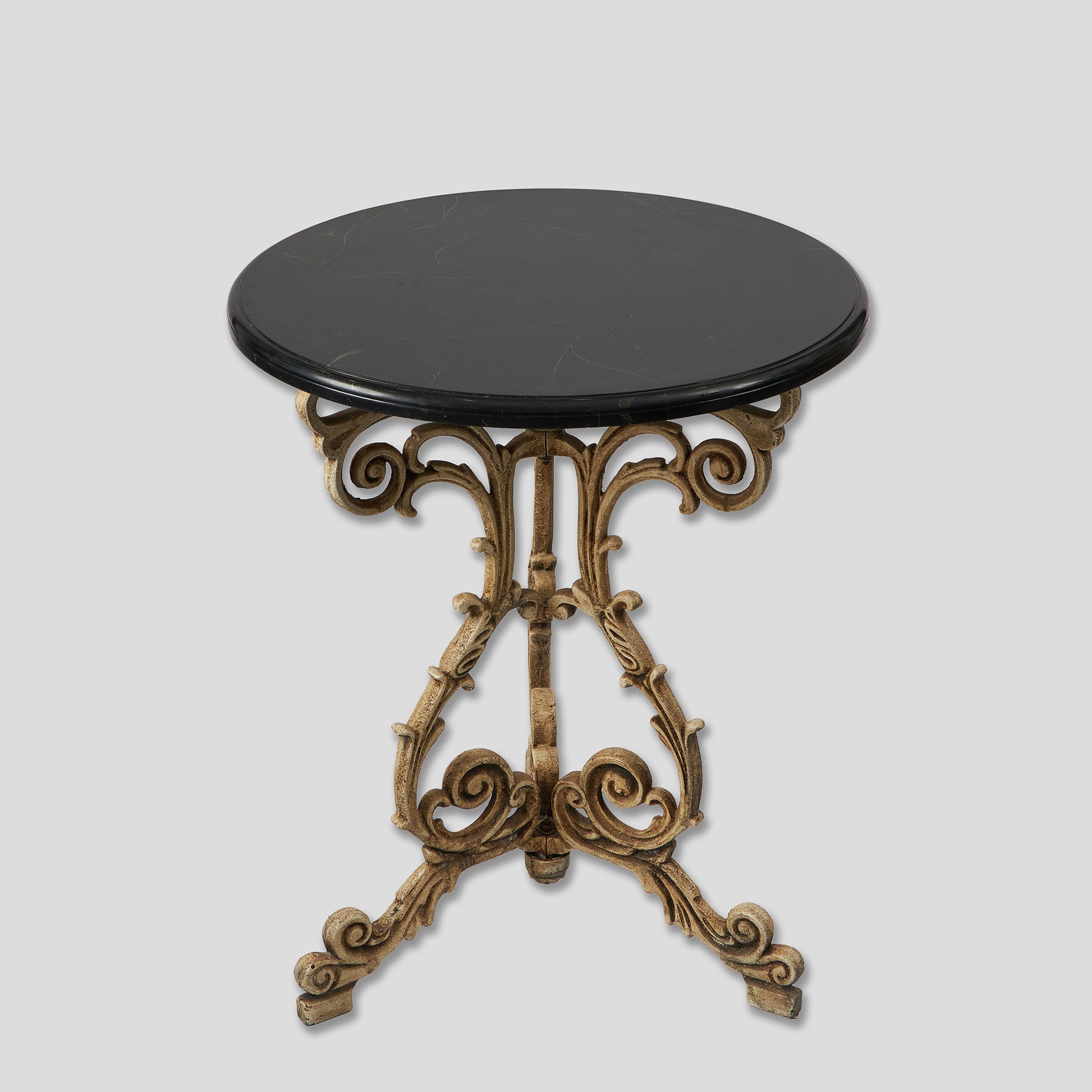 Măsuță cu blat rotund din marmură neagră și structură metalică decorată cu detalii elegante. Marmura adaugă un aspect sofisticat, iar baza metalică oferă stabilitate și un design aparte. Se potrivește în living, lounge sau într-un colț de relaxare, fiind atât practică, cât și decorativă.