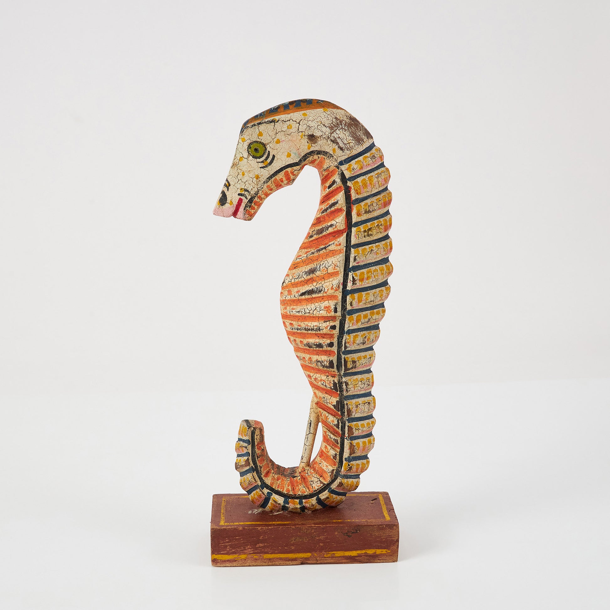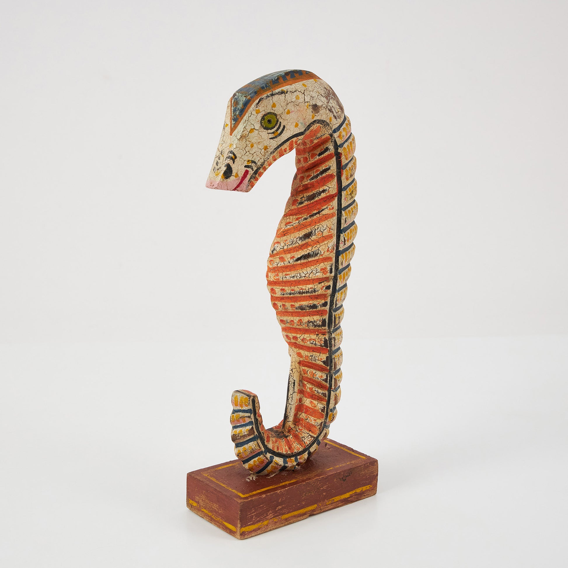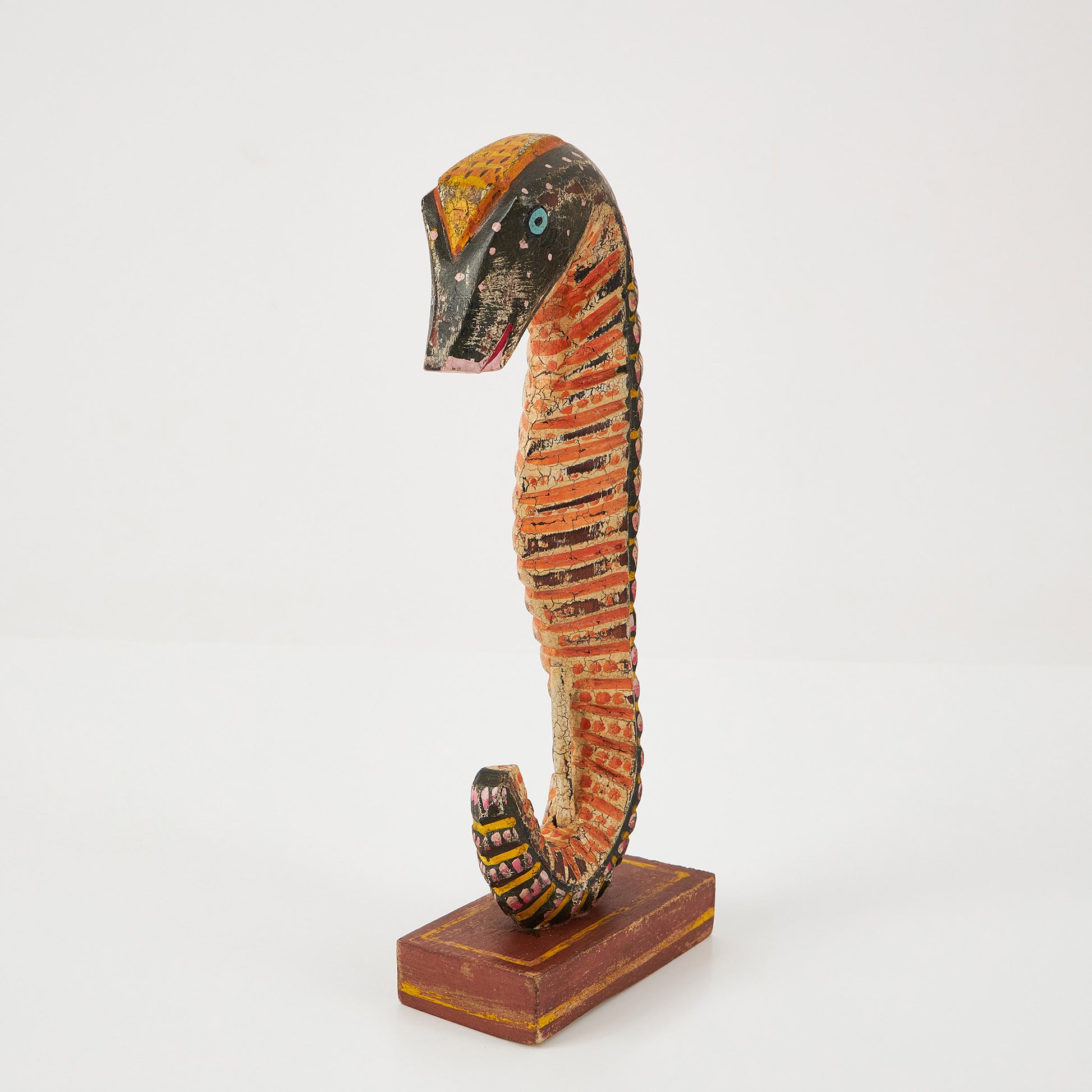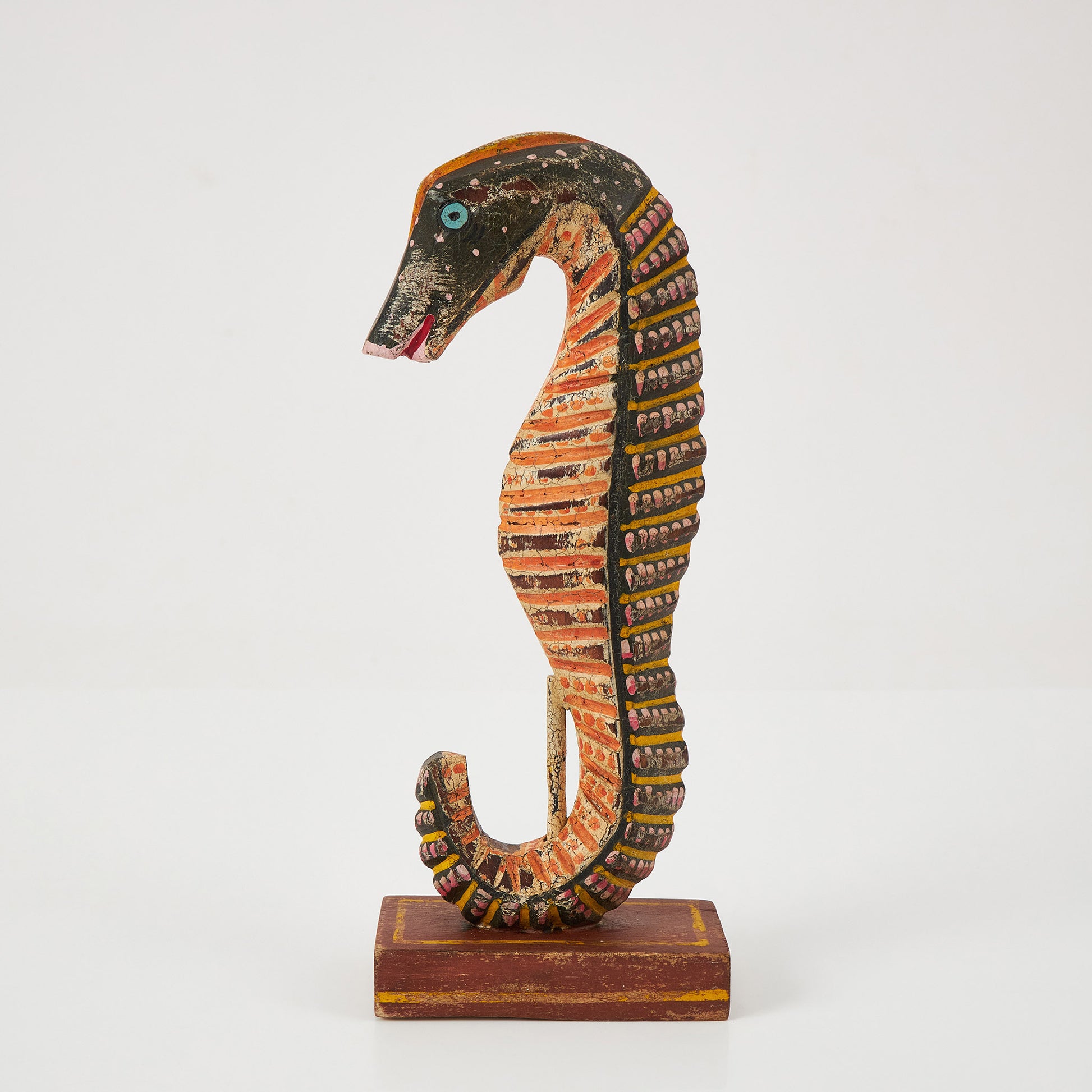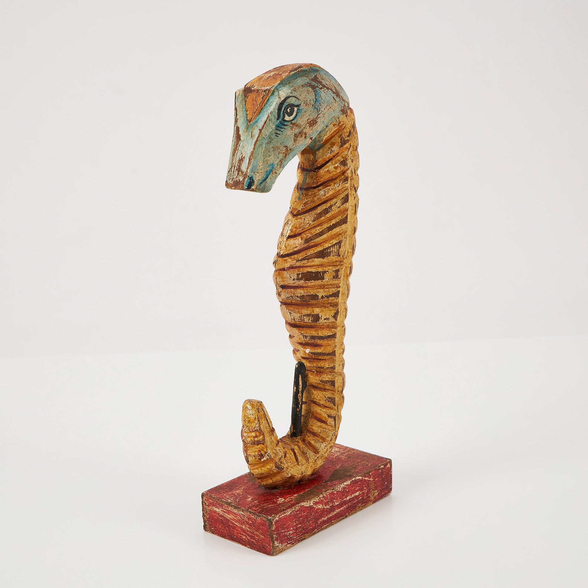 Căluț de mare decorativ din lemn, pictat manual în culori calde și vibrante. Montat pe suport, este o piesă jucăușă, care se integrează perfect în decoruri de inspirație marină sau ca accent deosebit într-un living, birou ori spațiu de vacanță.