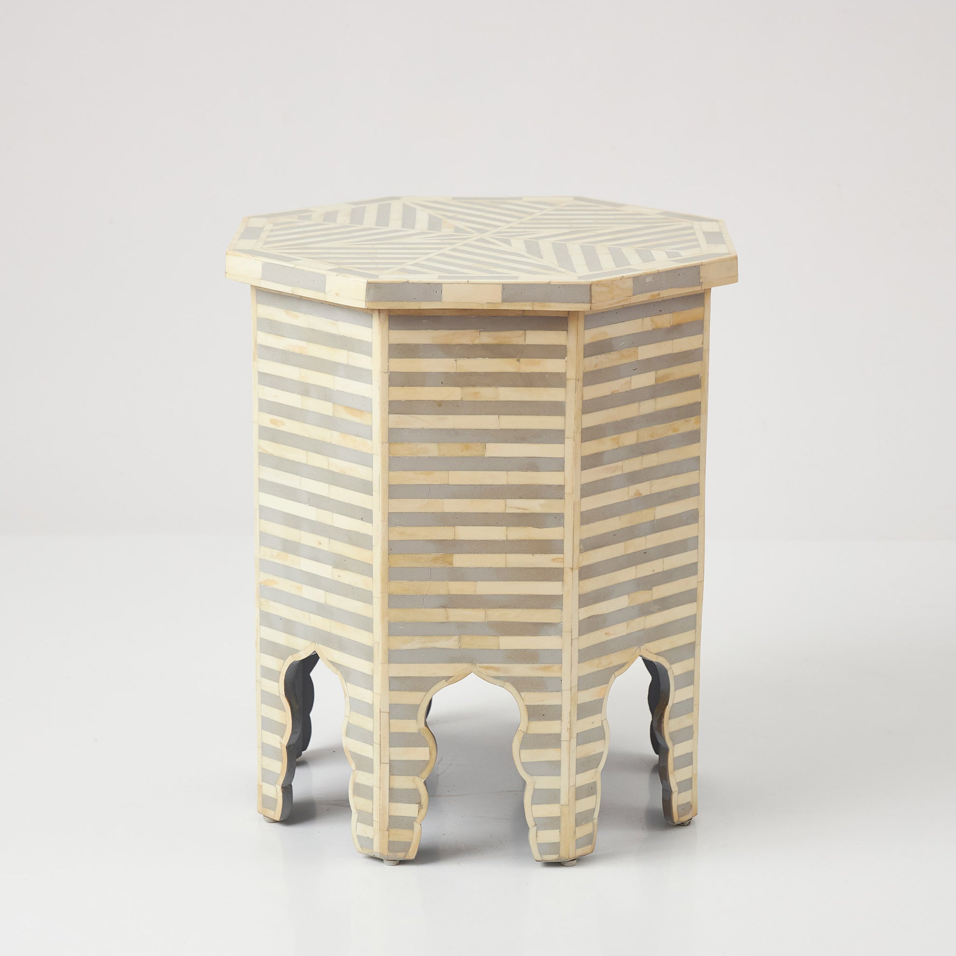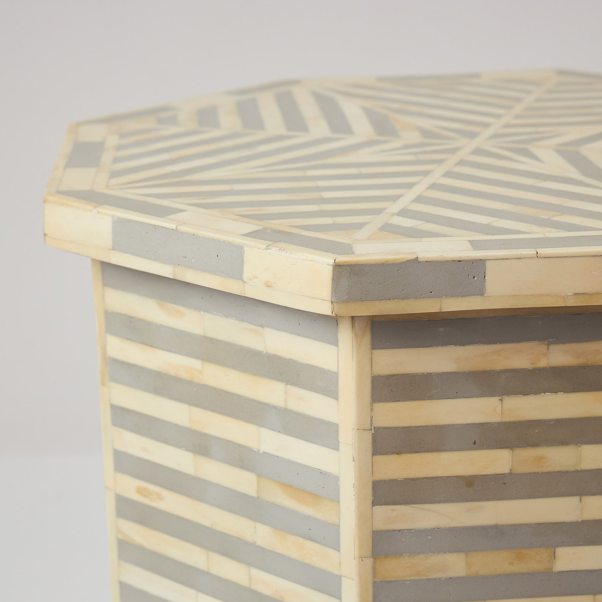 Masă realizată manual din lemn, cu inserții din os ce formează un model geometric pe suprafață. Are formă hexagonală și picioare scurte, stabile. Poate fi folosită ca măsuță de cafea, lângă fotoliu sau canapea, dar și ca piesă decorativă într-un colț al camerei.