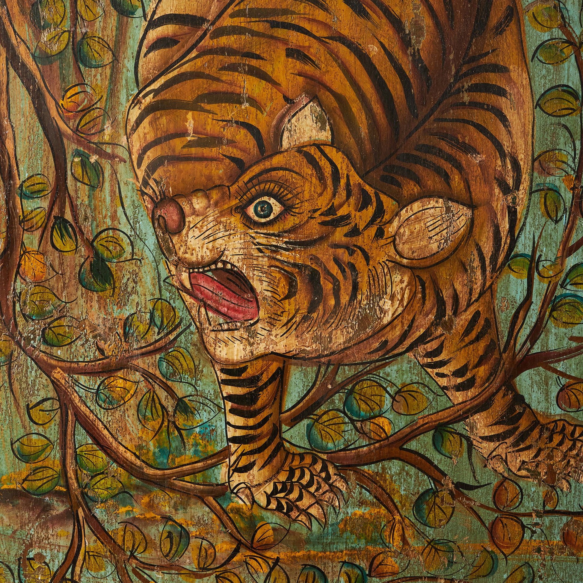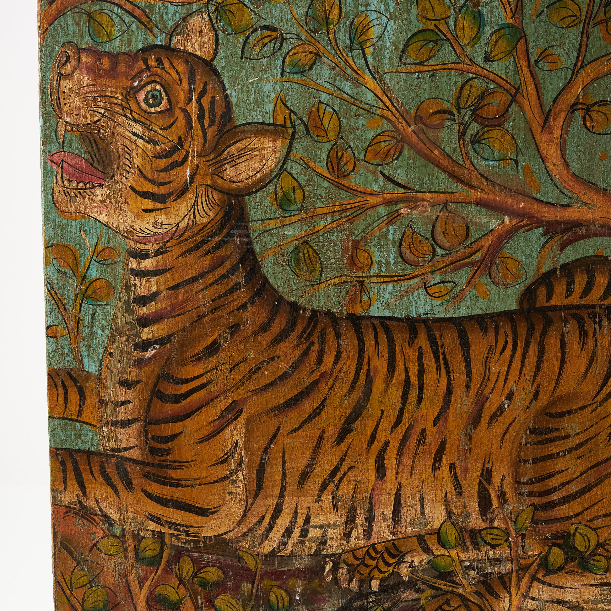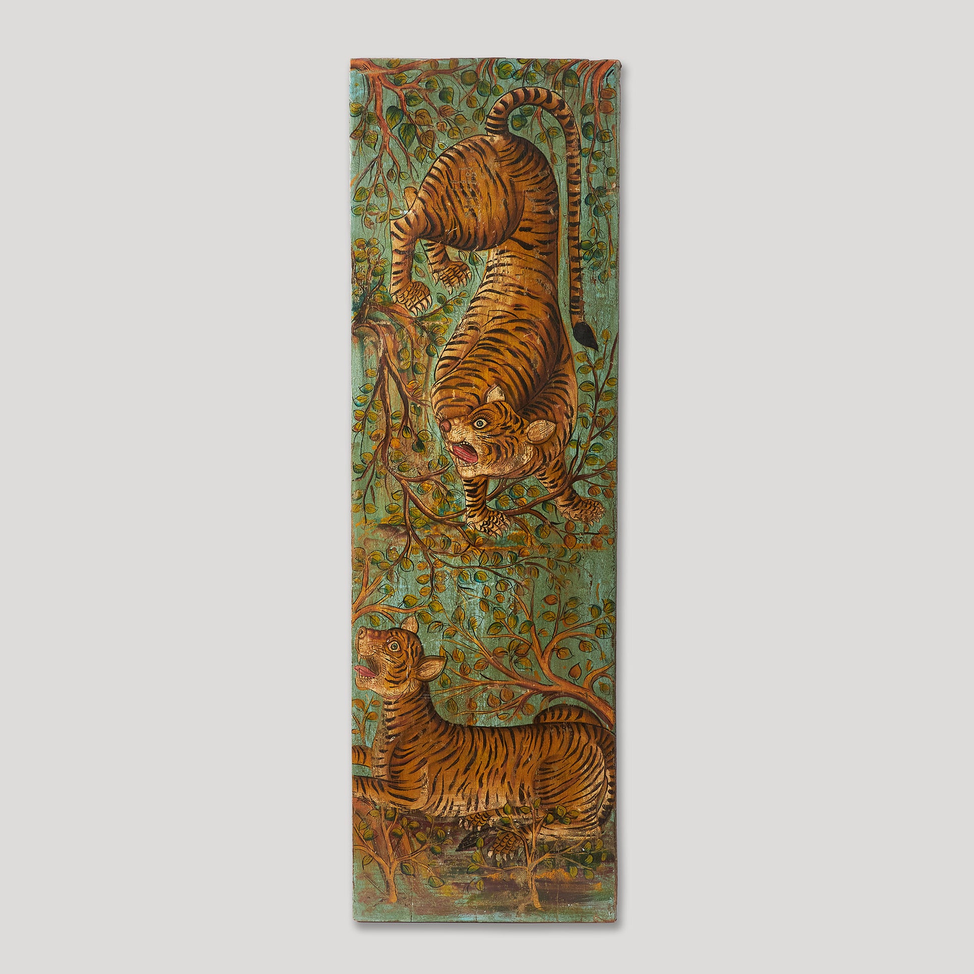 Panou decorativ pictat manual, cu reprezentarea detaliată a tigrilor într-un cadru natural, plin de forță și dinamism. O piesă exotică și expresivă, care aduce personalitate oricărui spațiu, de la living și birou, până la restaurante sau spații de inspirație orientală.