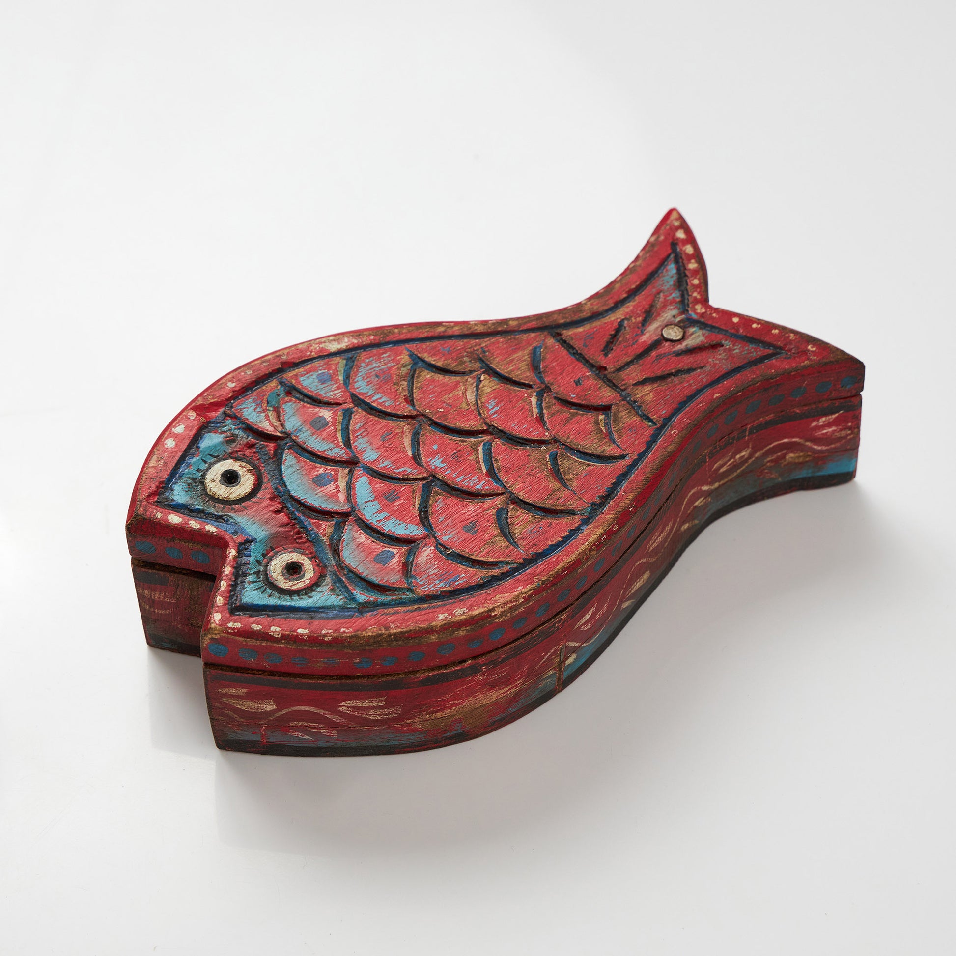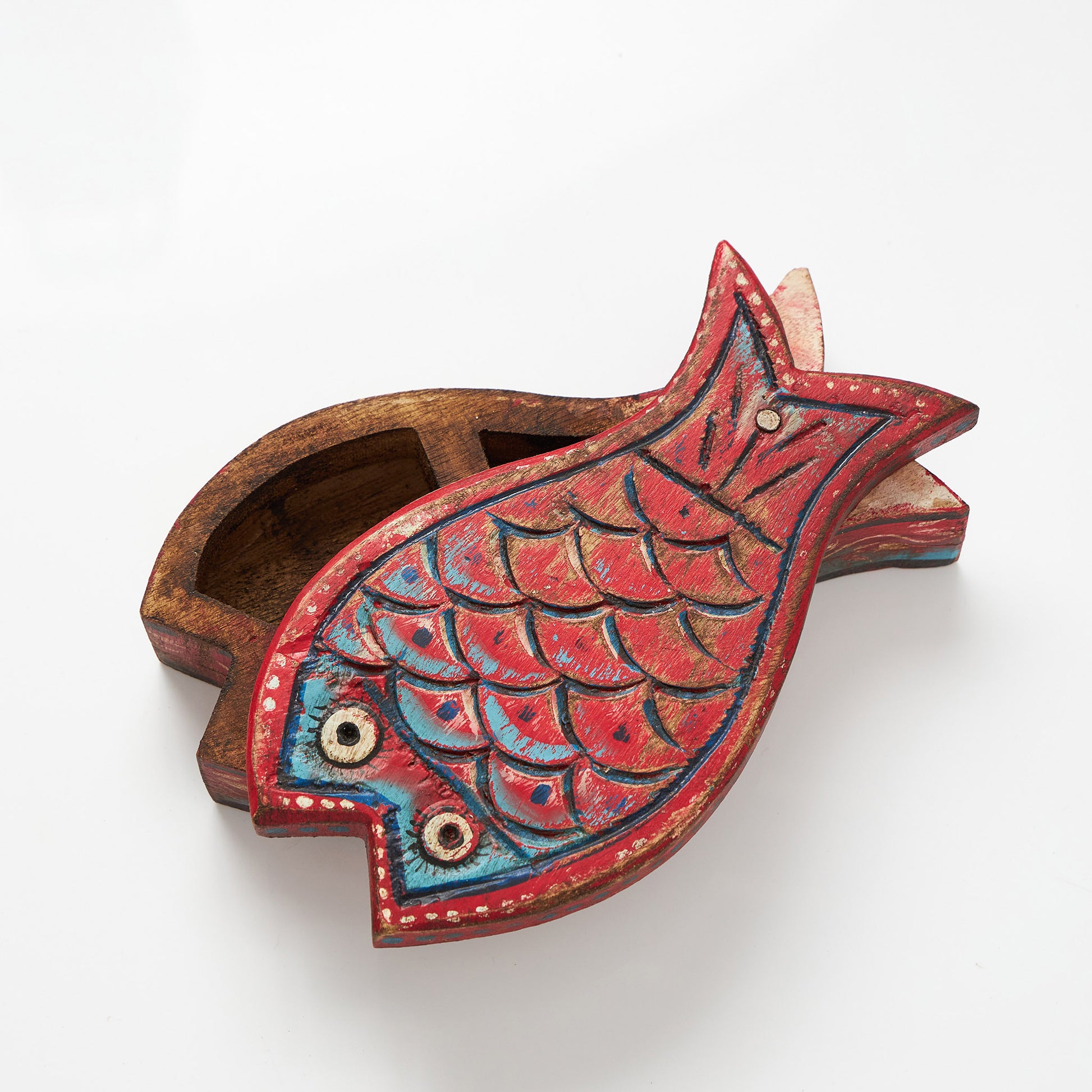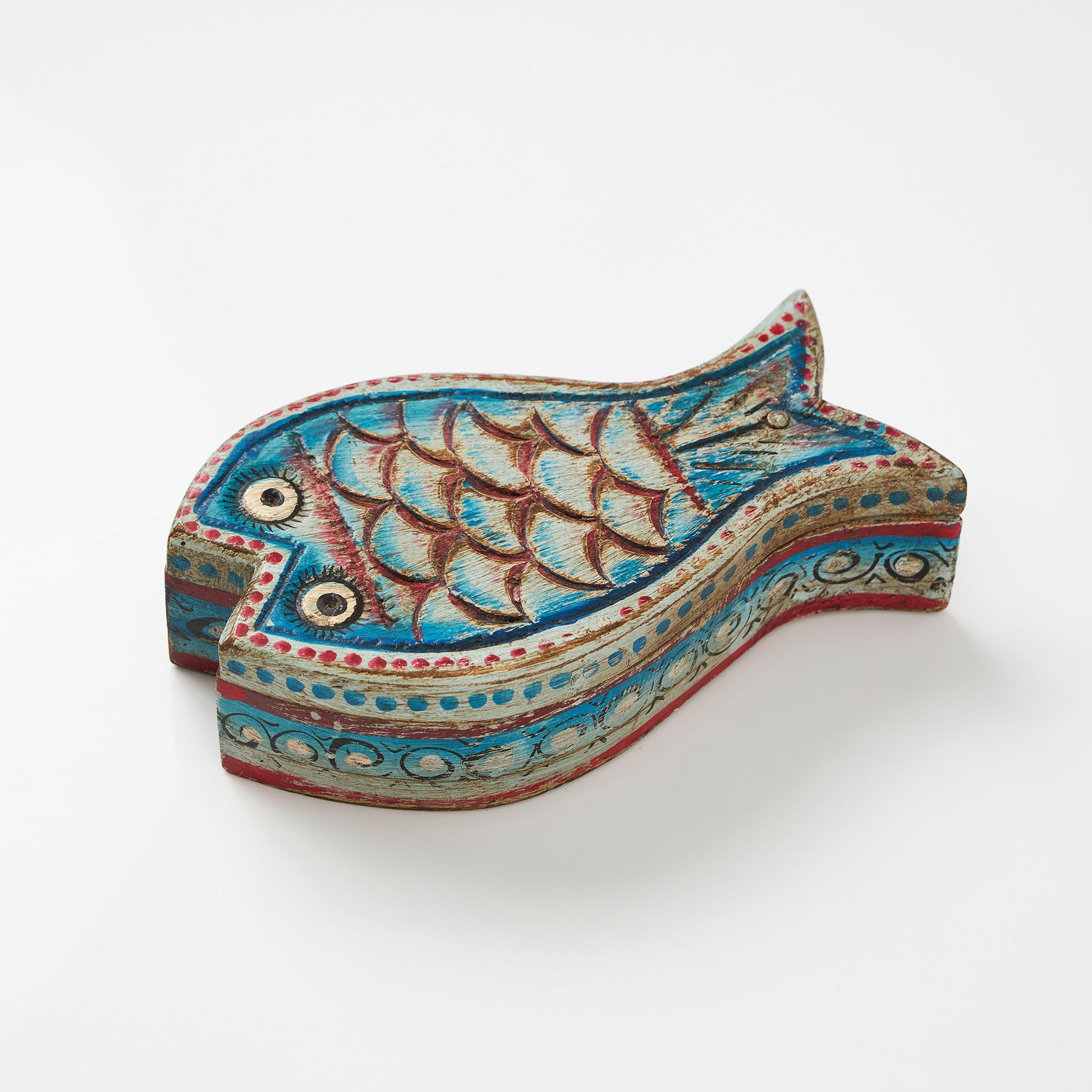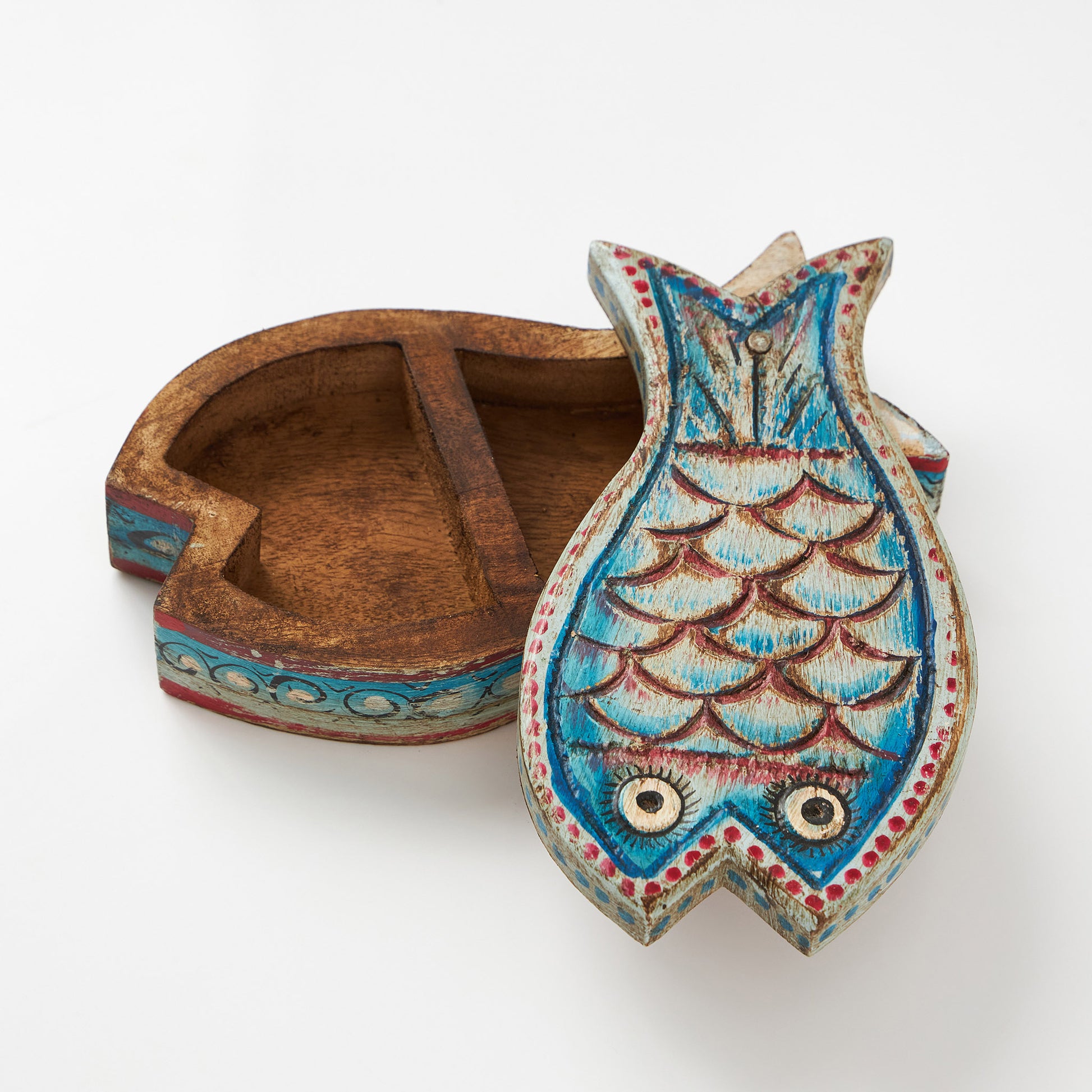 Cutie de bijuterii din lemn, pictată manual în formă de pește. Capacul glisant ascunde un mic spațiu pentru depozitarea bijuteriilor sau a altor obiecte prețioase. Peștele este considerat un simbol al norocului și al abundenței în multe culturi, ceea ce face din această cutiuță nu doar un obiect practic, ci și unul cu semnificație. Perfectă pentru a fi oferită cadou sau pentru a adăuga un detaliu inedit în decor.