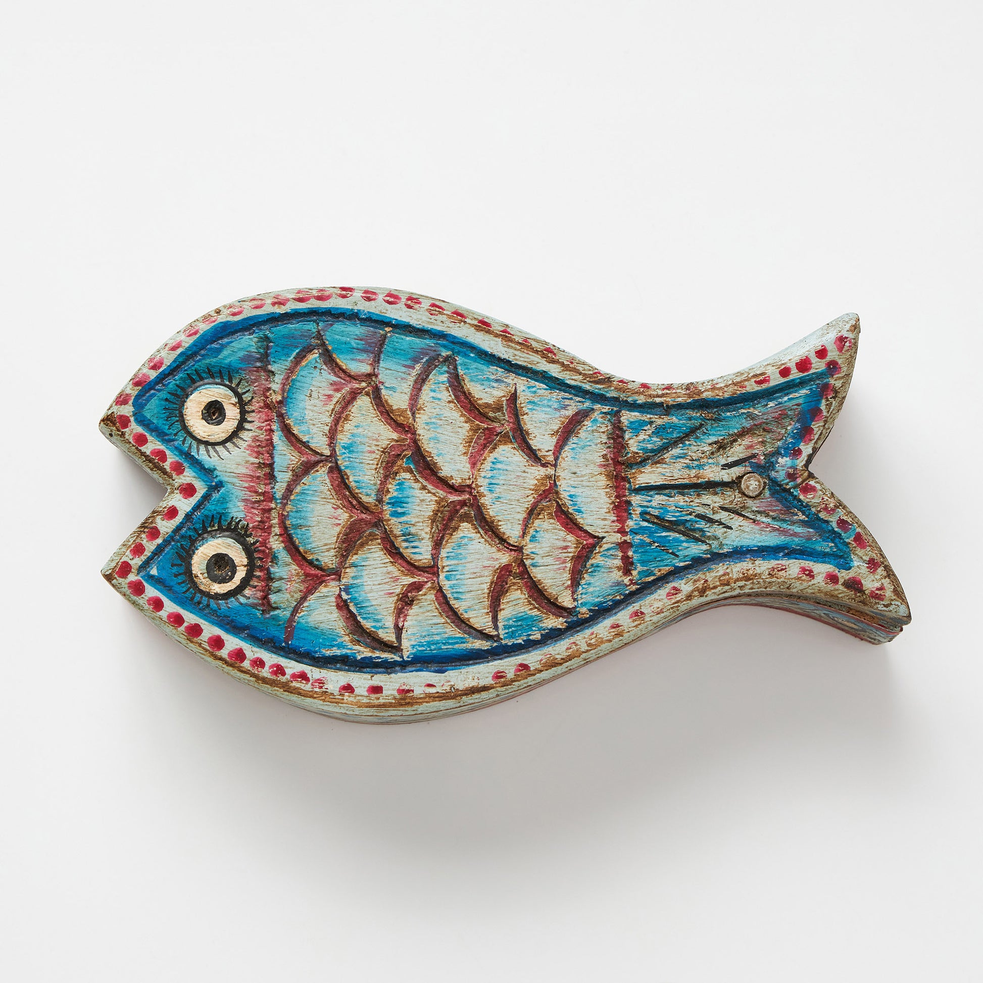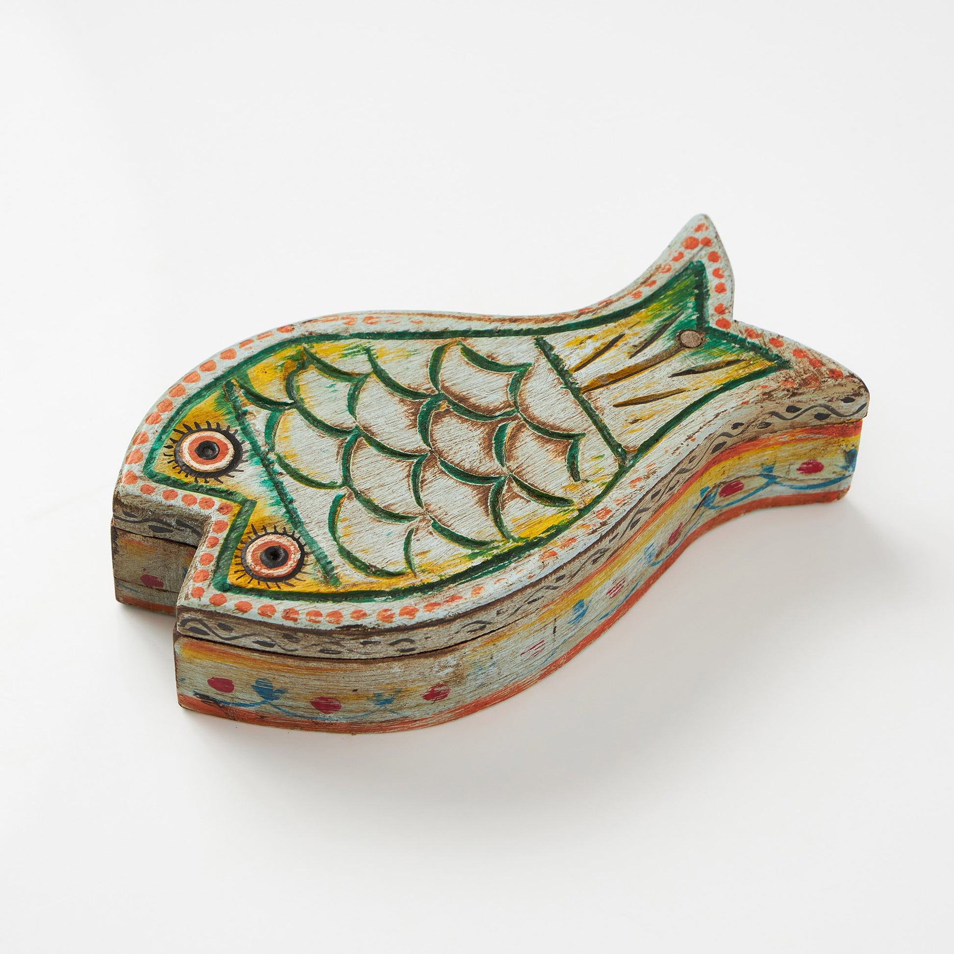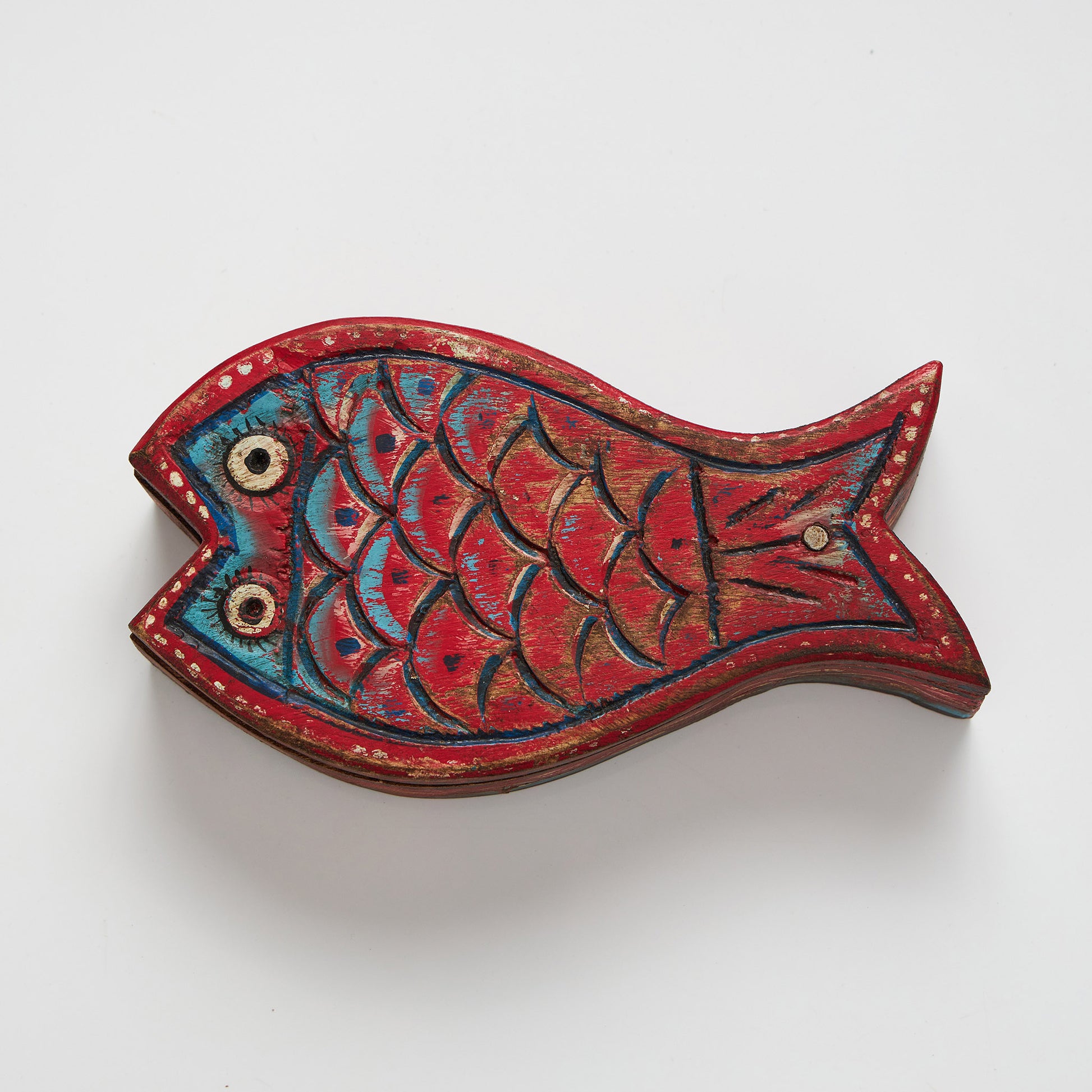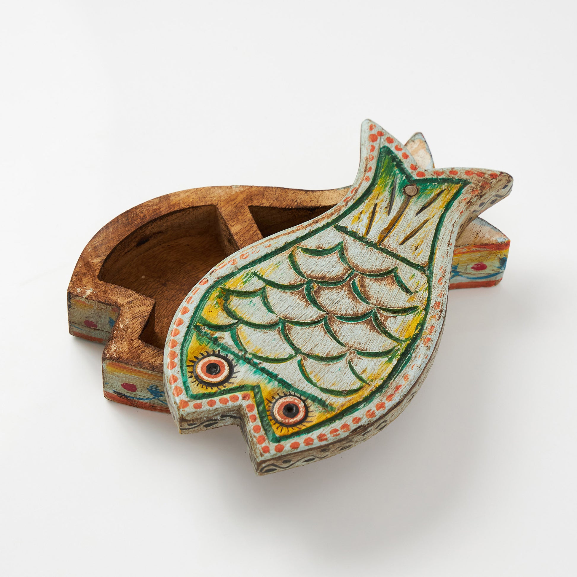 Cutie de bijuterii din lemn, pictată manual în formă de pește. Capacul glisant ascunde un mic spațiu pentru depozitarea bijuteriilor sau a altor obiecte prețioase. Peștele este considerat un simbol al norocului și al abundenței în multe culturi, ceea ce face din această cutiuță nu doar un obiect practic, ci și unul cu semnificație. Perfectă pentru a fi oferită cadou sau pentru a adăuga un detaliu inedit în decor.