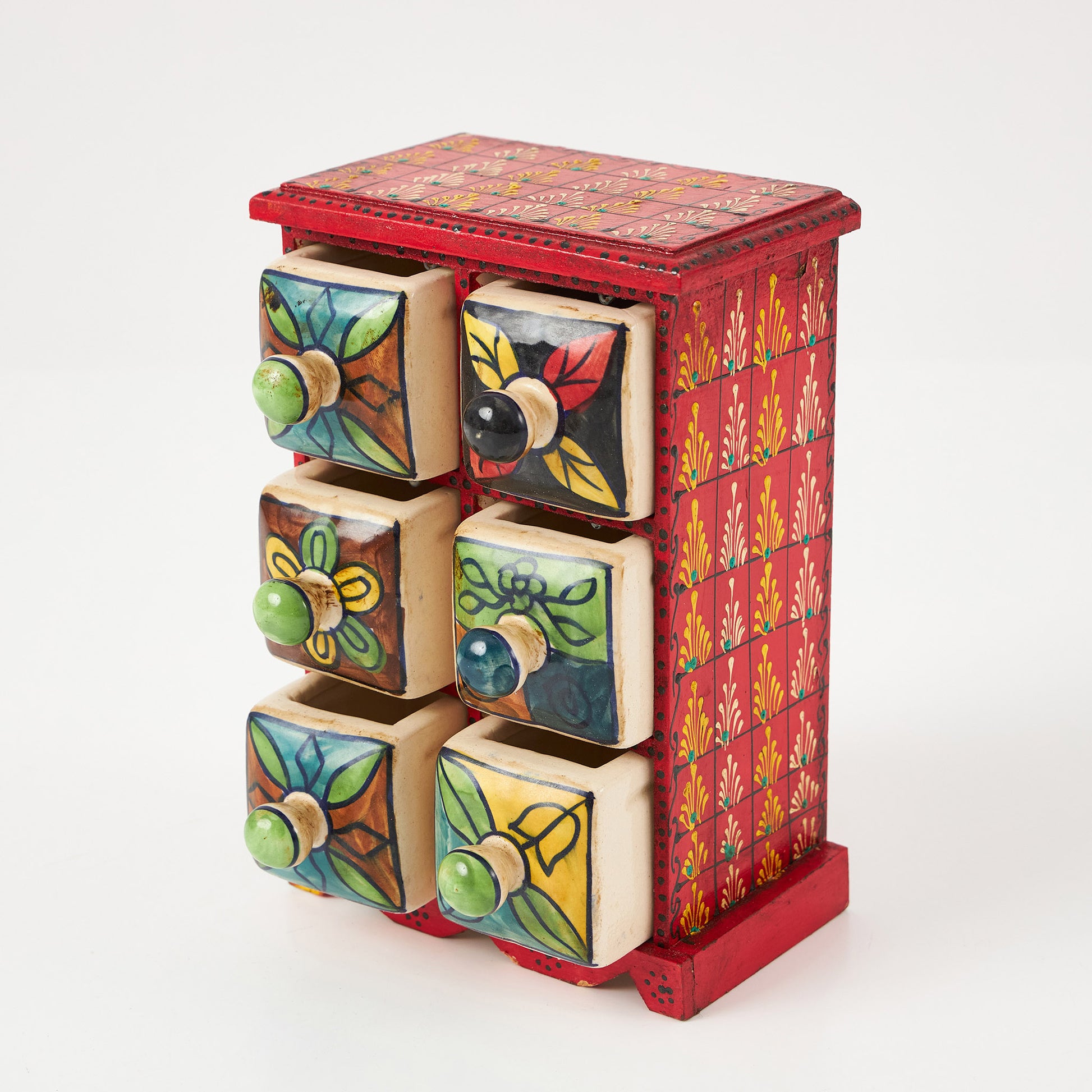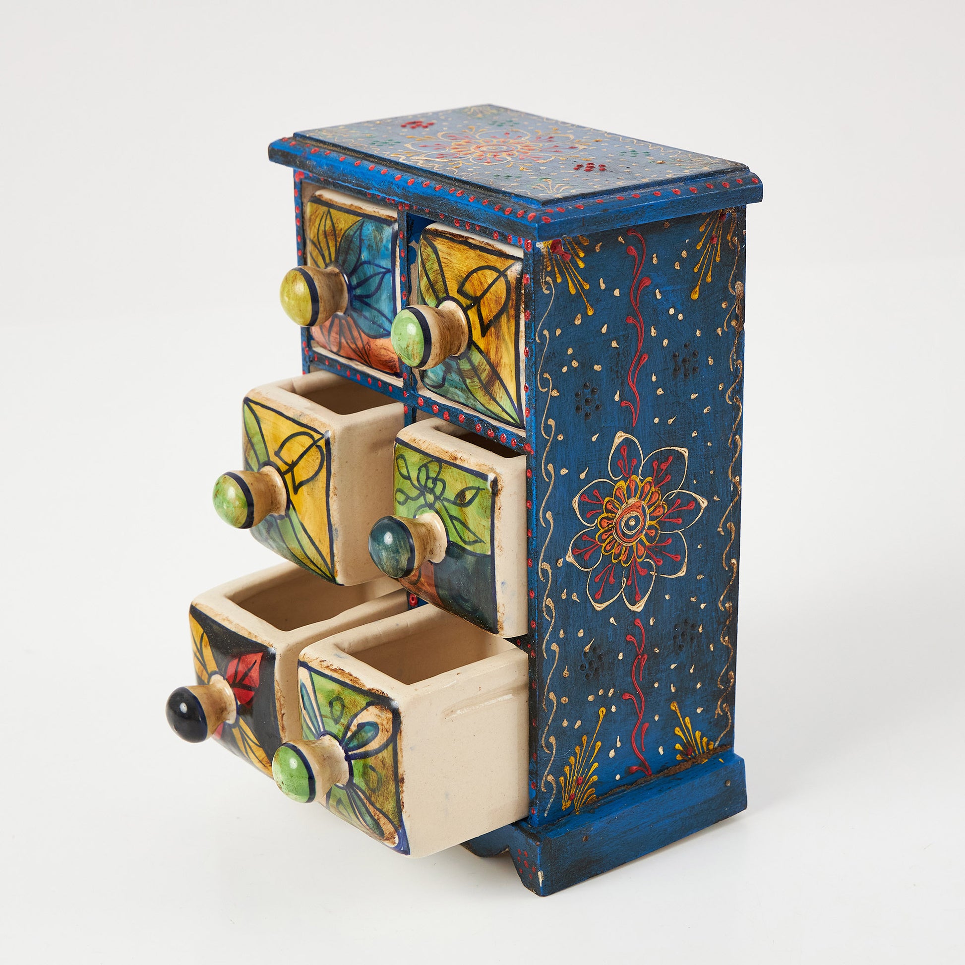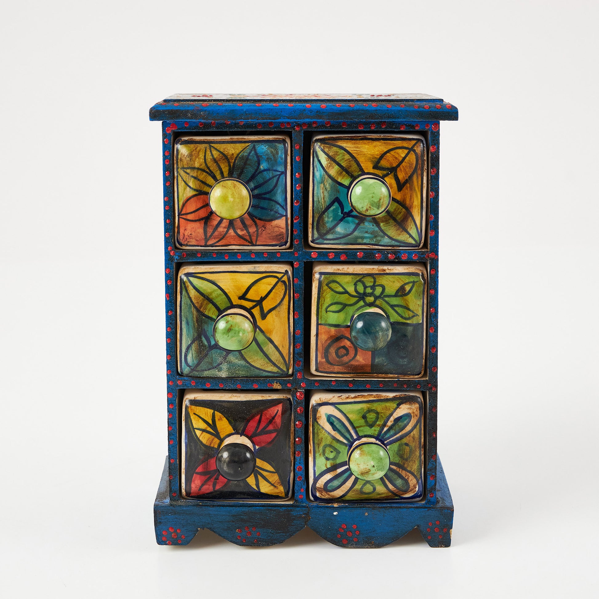 Cutiuță din lemn cu 6 sertare ceramice, fiecare pictat manual în modele diferite. Este ideală pentru a organiza obiecte mici – de la mirodenii în bucătărie, la accesorii și bijuterii în living sau dormitor.