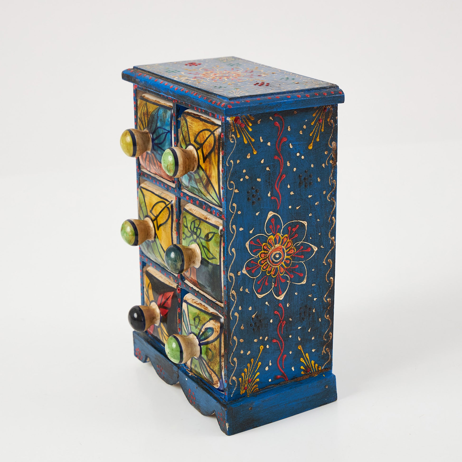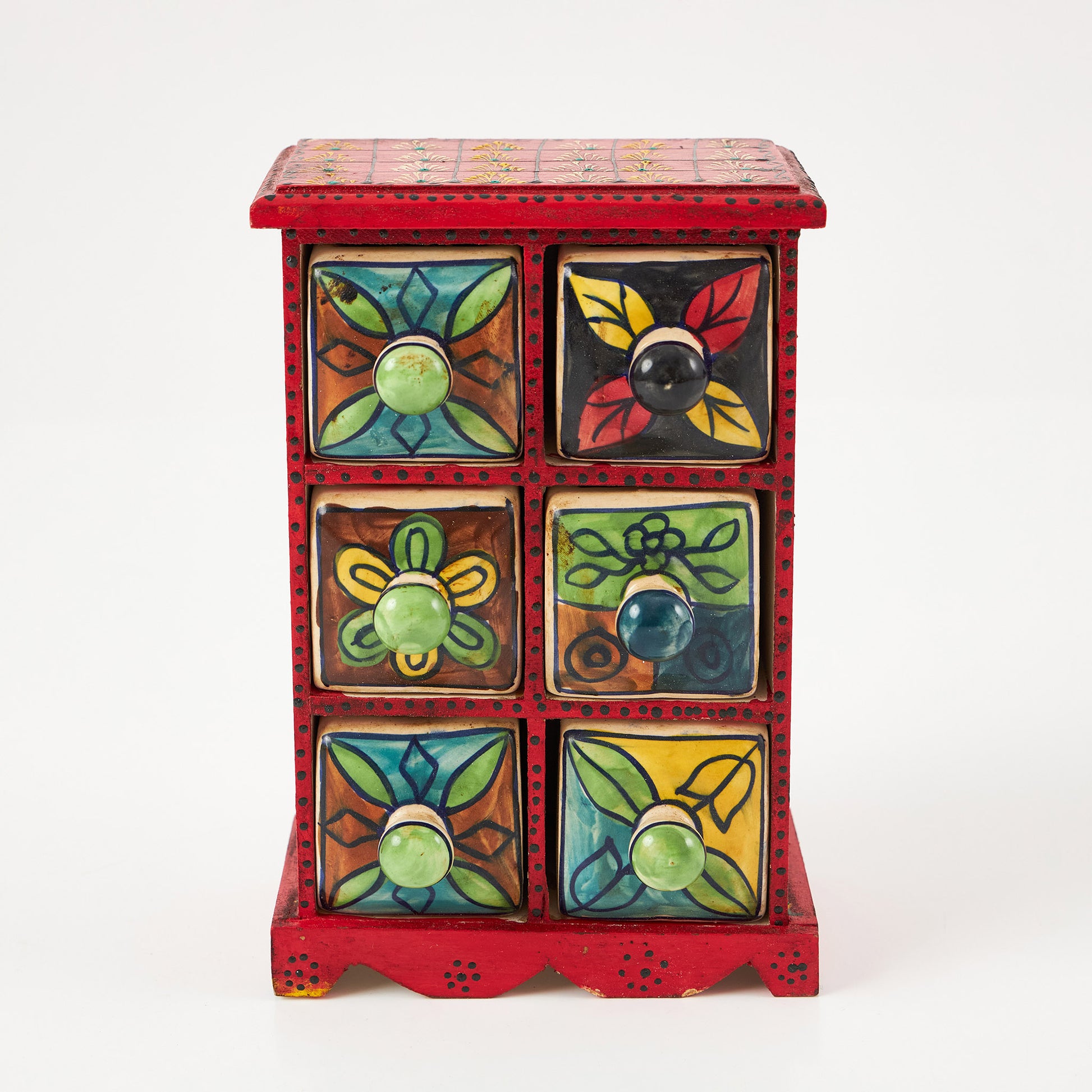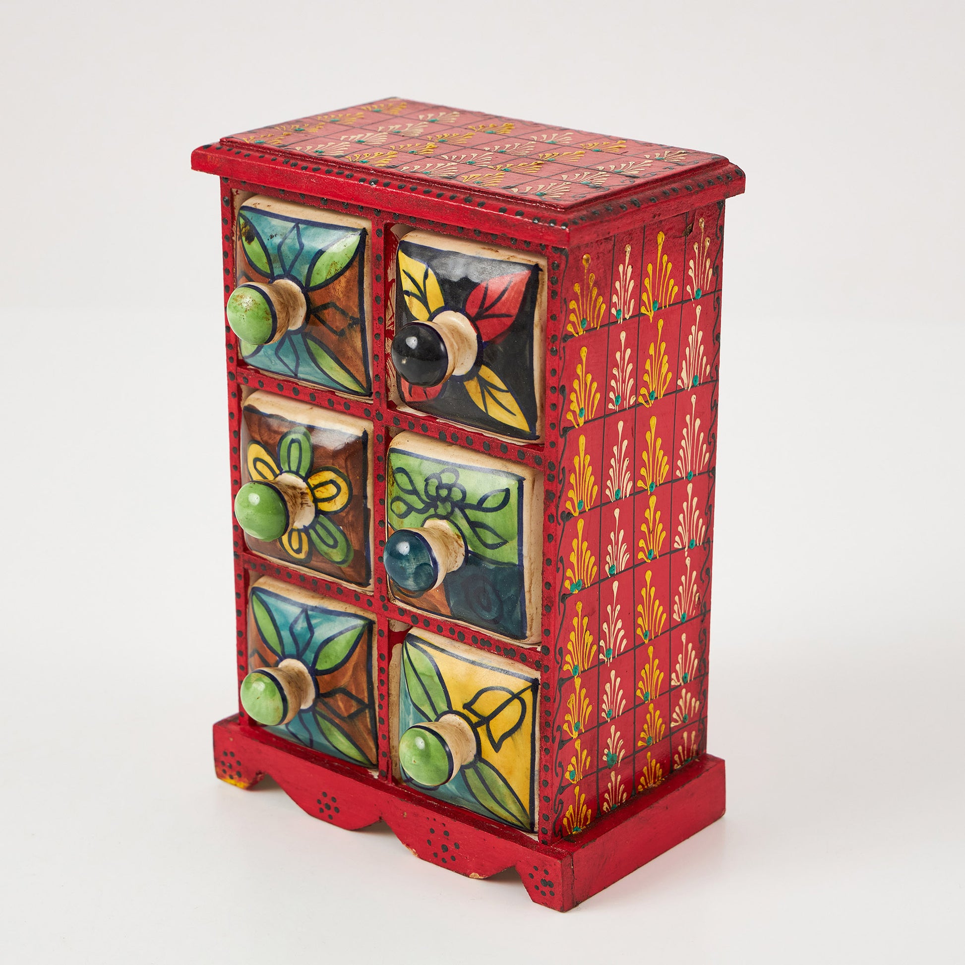 Cutiuță din lemn cu 6 sertare ceramice, fiecare pictat manual în modele diferite. Este ideală pentru a organiza obiecte mici – de la mirodenii în bucătărie, la accesorii și bijuterii în living sau dormitor.