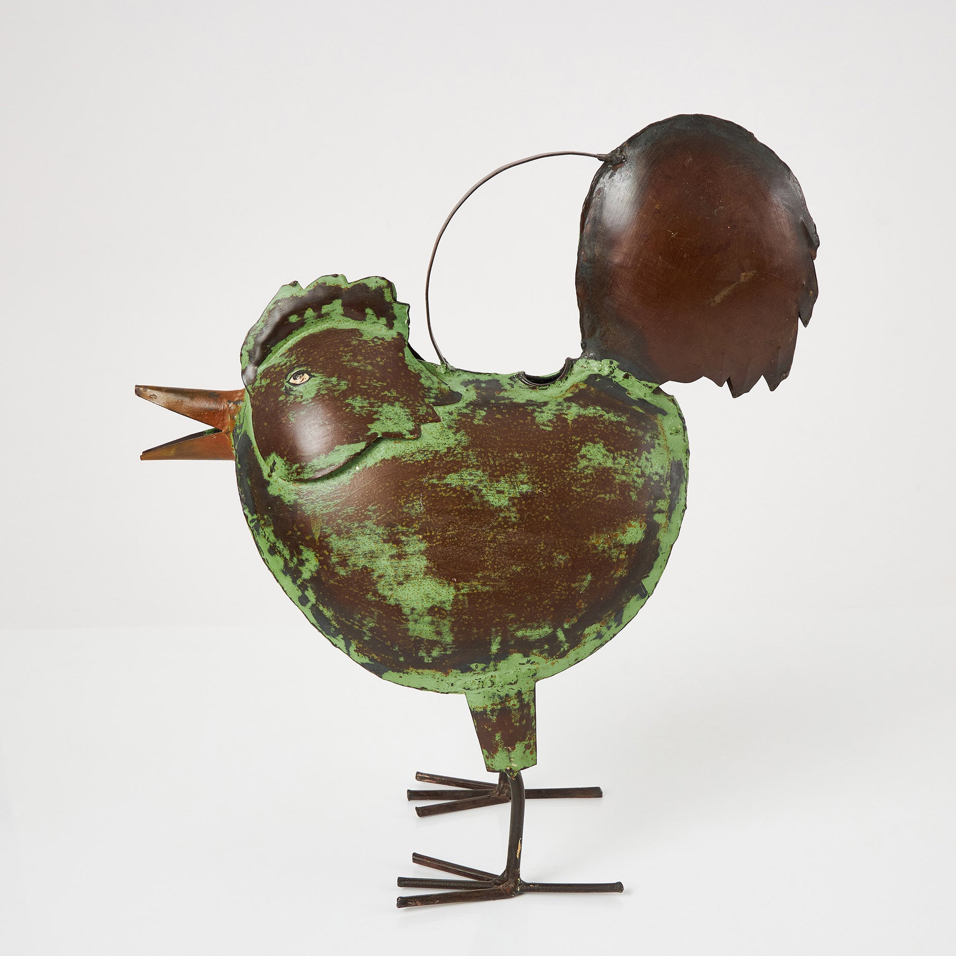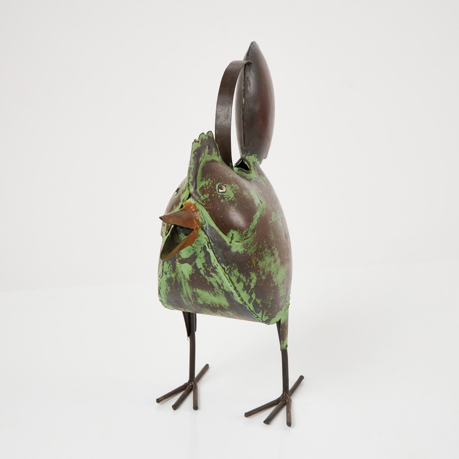 Pasăre decorativă din metal, cu finisaj patinat verde-bronz, realizată manual. Designul ei vesel și expresiv aduce un plus de originalitate în orice spațiu – de la living și bucătărie, până la terasă sau grădină. Este accentul perfect pentru cei care vor să adauge un strop de culoare și creativitate în decor.
