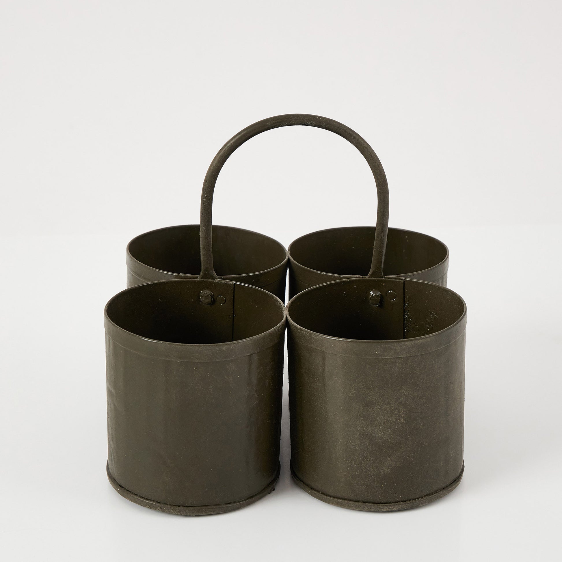 Organizator metalic cu 4 compartimente și mâner, ideal pentru a păstra la îndemână tacâmuri, condimente, ustensile de bucătărie sau chiar accesorii de birou. Poate fi folosit și ca suport pentru plante mici sau flori uscate, aducând un aer industrial-rustic în decor. O piesă practică și decorativă deopotrivă.