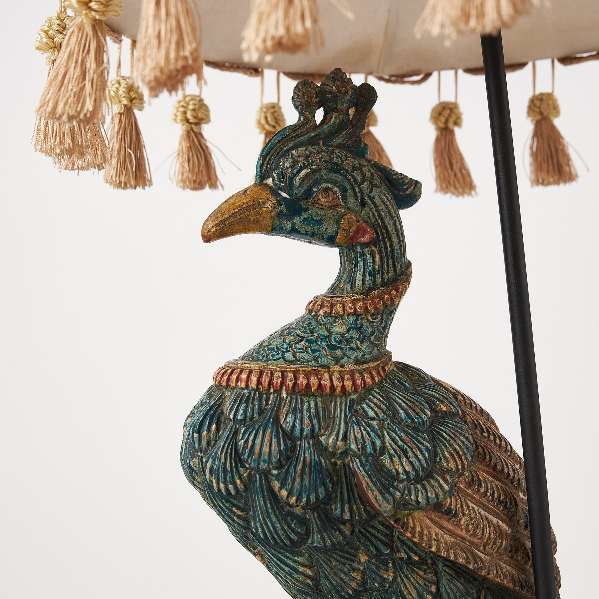 Lampă electrică cu abajur textil decorat cu franjuri și bază sculptată în formă de păun. Este o piesă elegantă și originală, perfectă pentru a aduce un accent distinct într-un living, dormitor sau birou. Oferă lumină ambientală plăcută și un detaliu decorativ care atrage privirea.