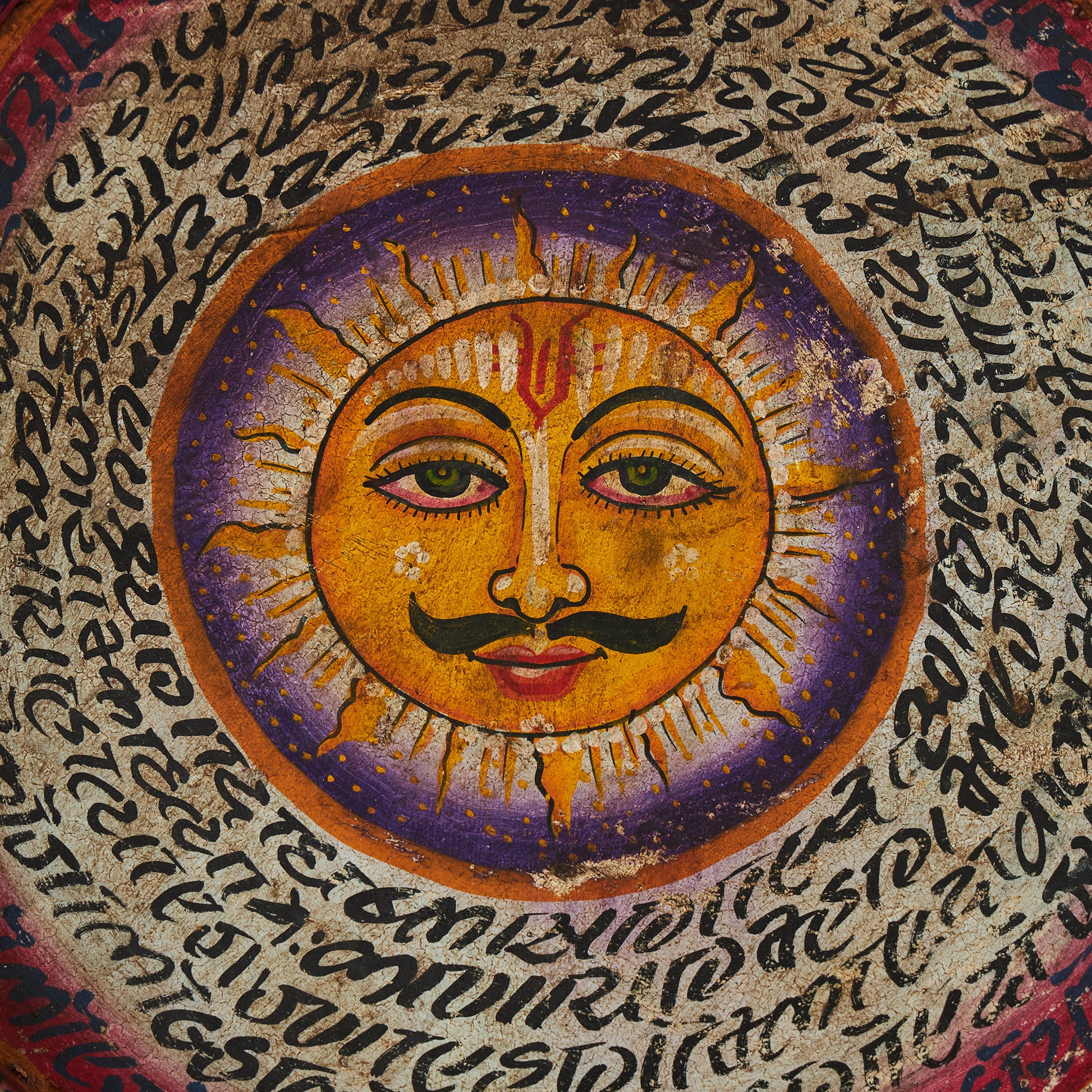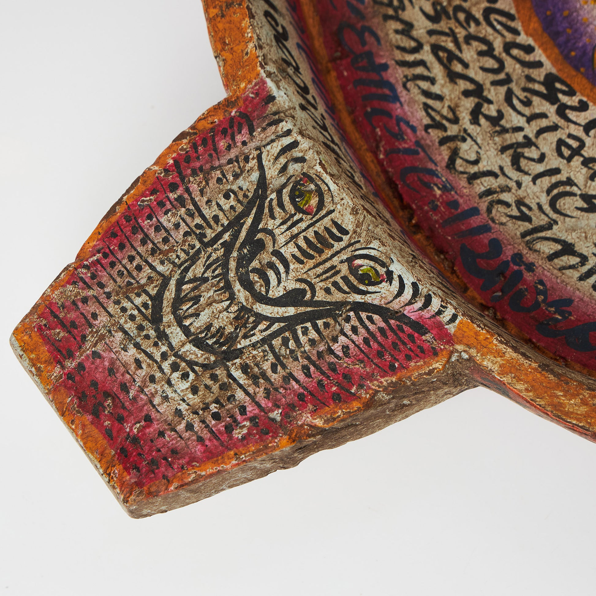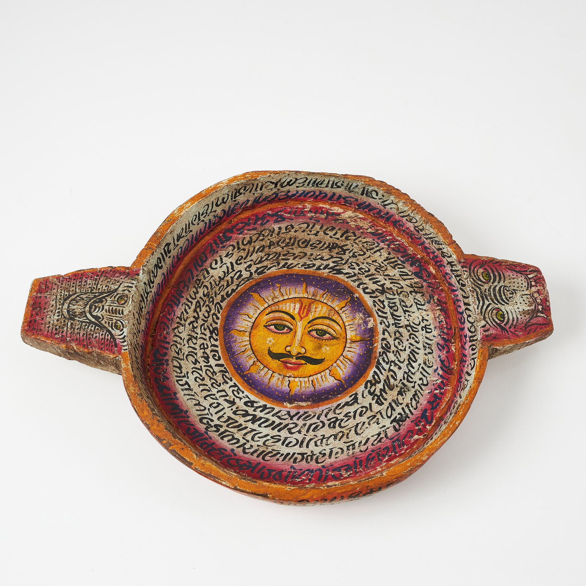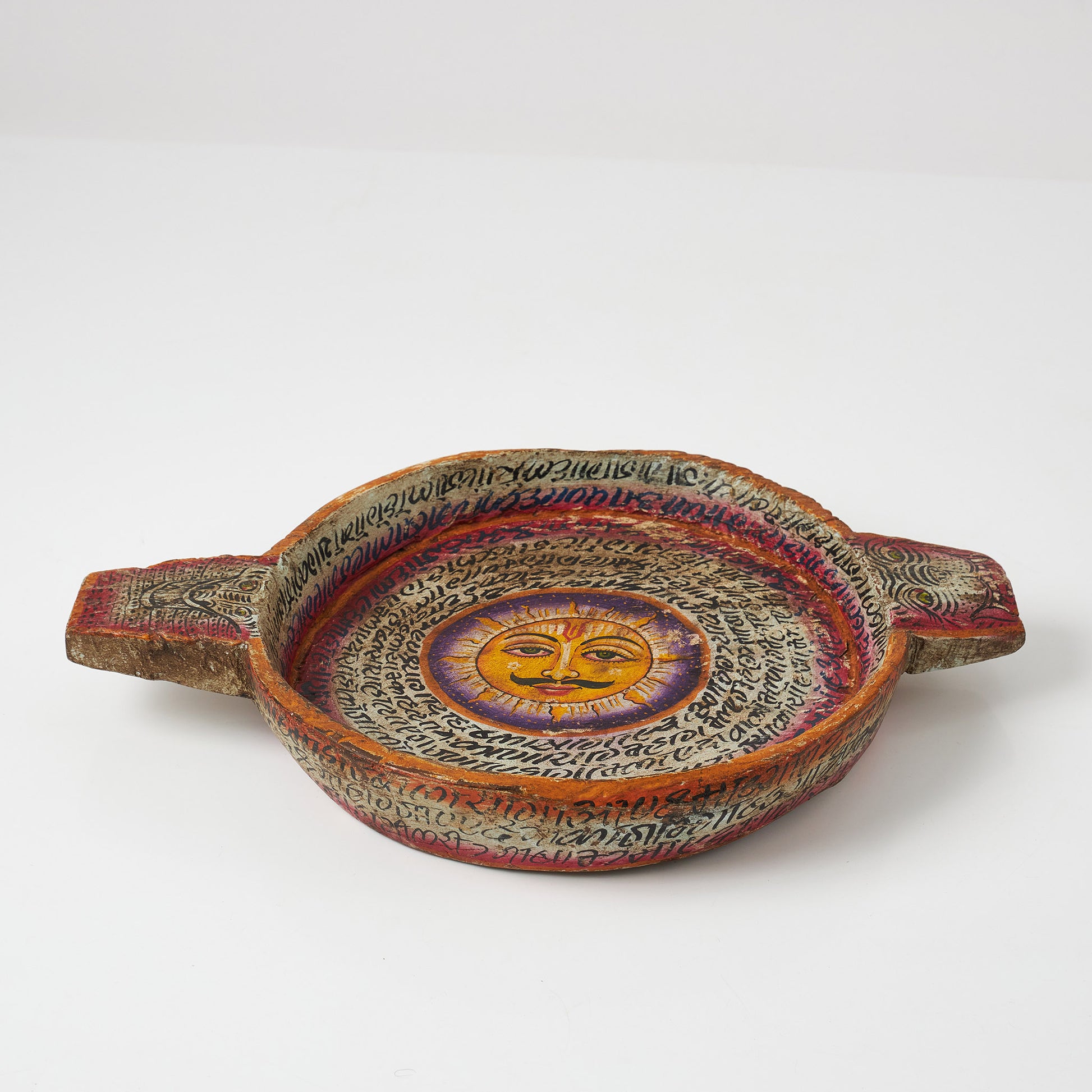 Platou realizat din lemn de mango, pictat manual cu detalii fine și simbolul soarelui în centru. Poate fi folosit ca obiect decorativ pe masă sau comodă, dar și ca suport pentru fructe, lumânări ori mici obiecte.