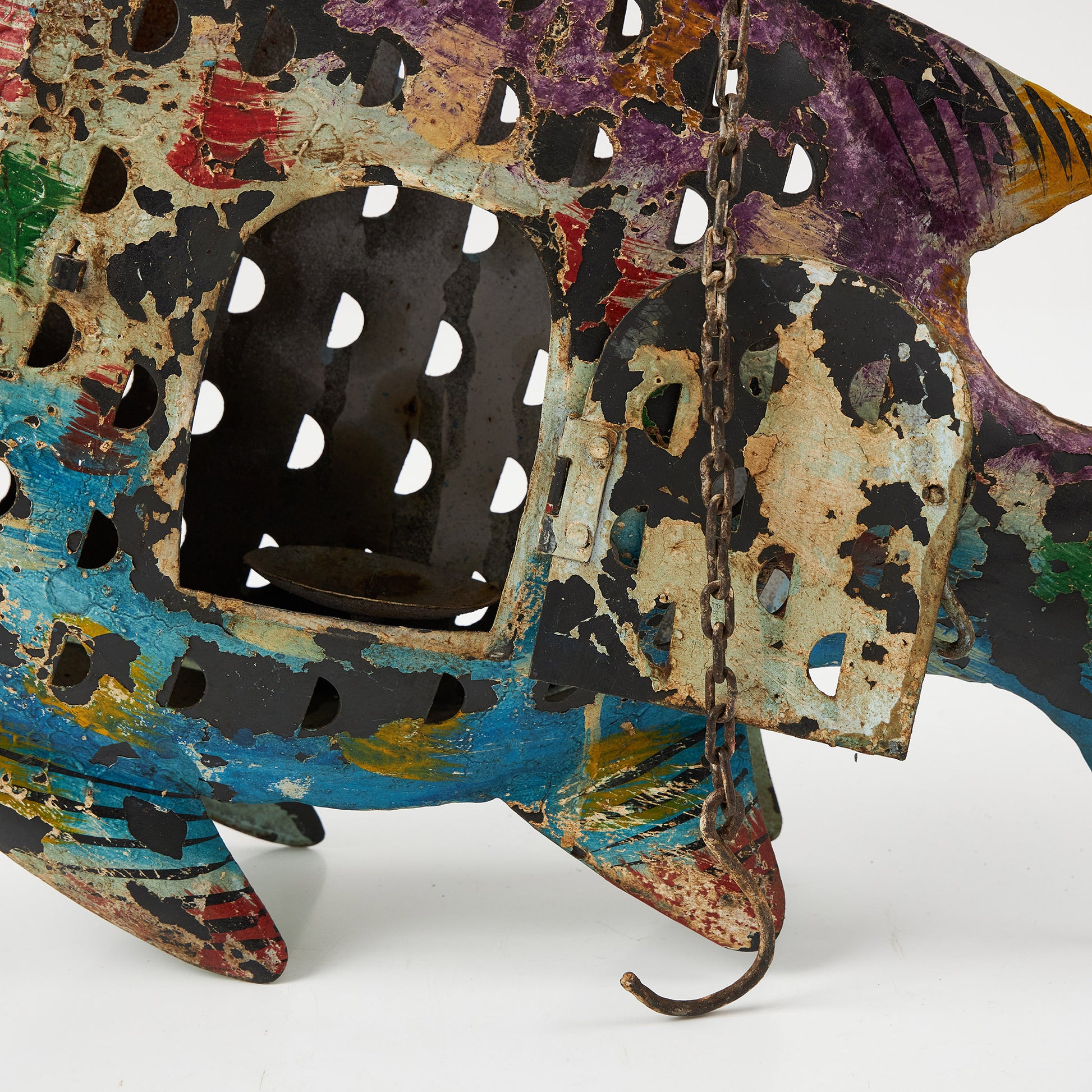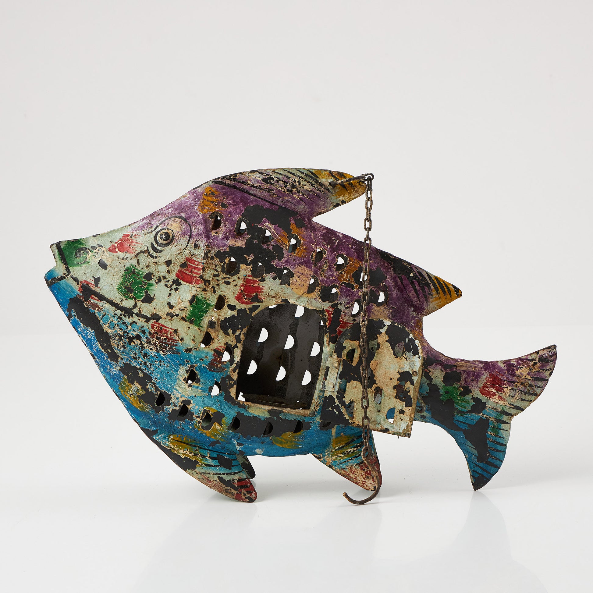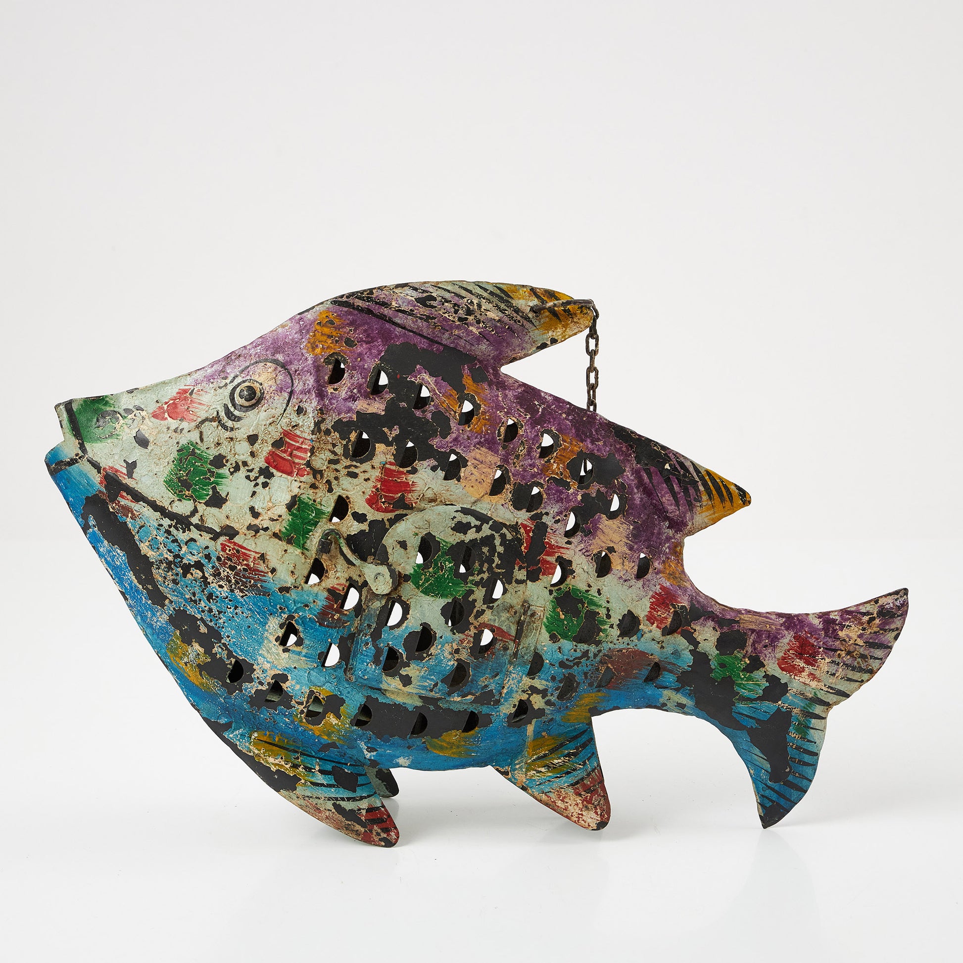 Figurină decorativă în formă de pește, realizată din metal și colorată în nuanțe vii, cu aspect patinat. Piesa are un mic compartiment interior, accesibil printr-o ușiță laterală, unde poate fi așezată o lumânare tip pastilă sau LED, transformându-l astfel într-un suport de lumânare decorativ. Se poate agăța datorită lanțului metalic inclus sau așeza pe o suprafață plană.