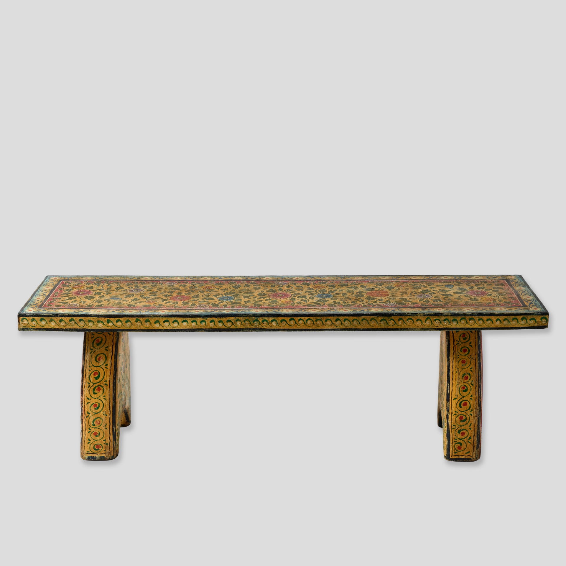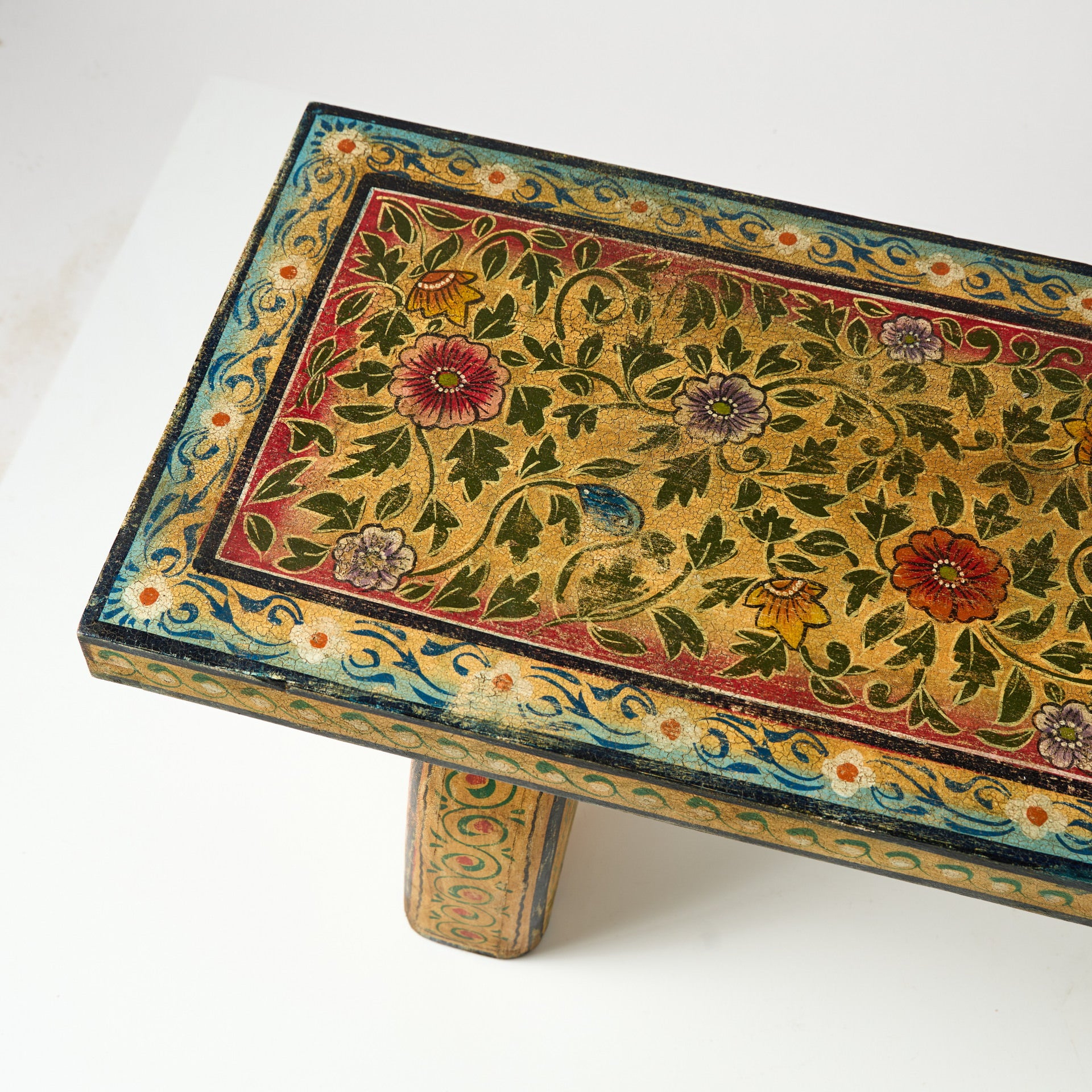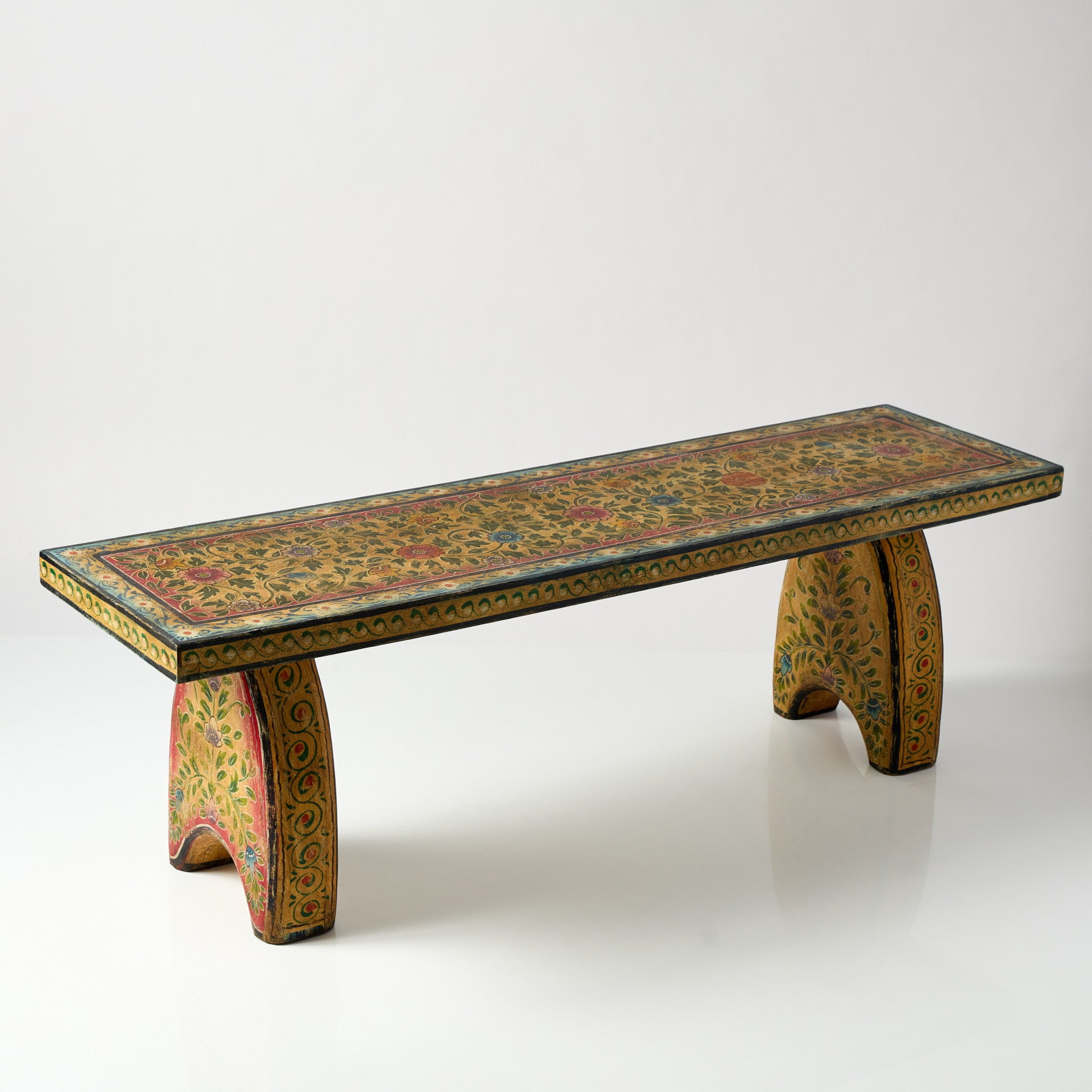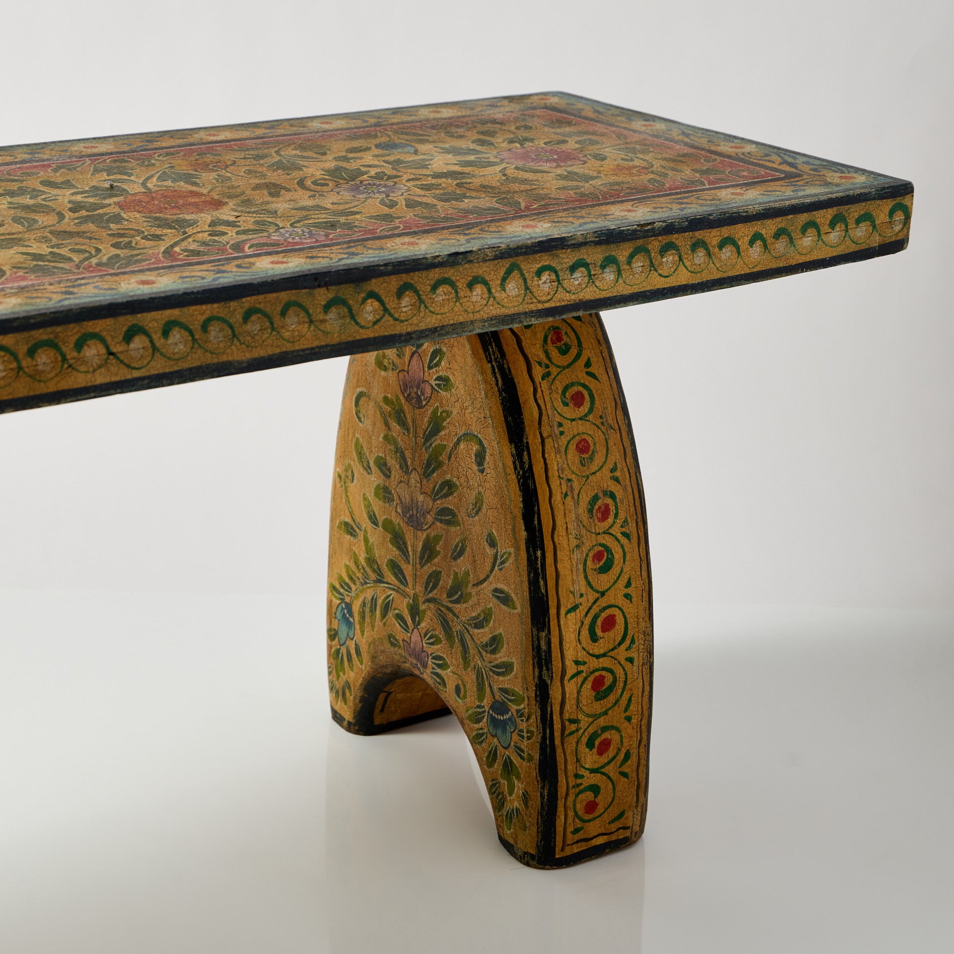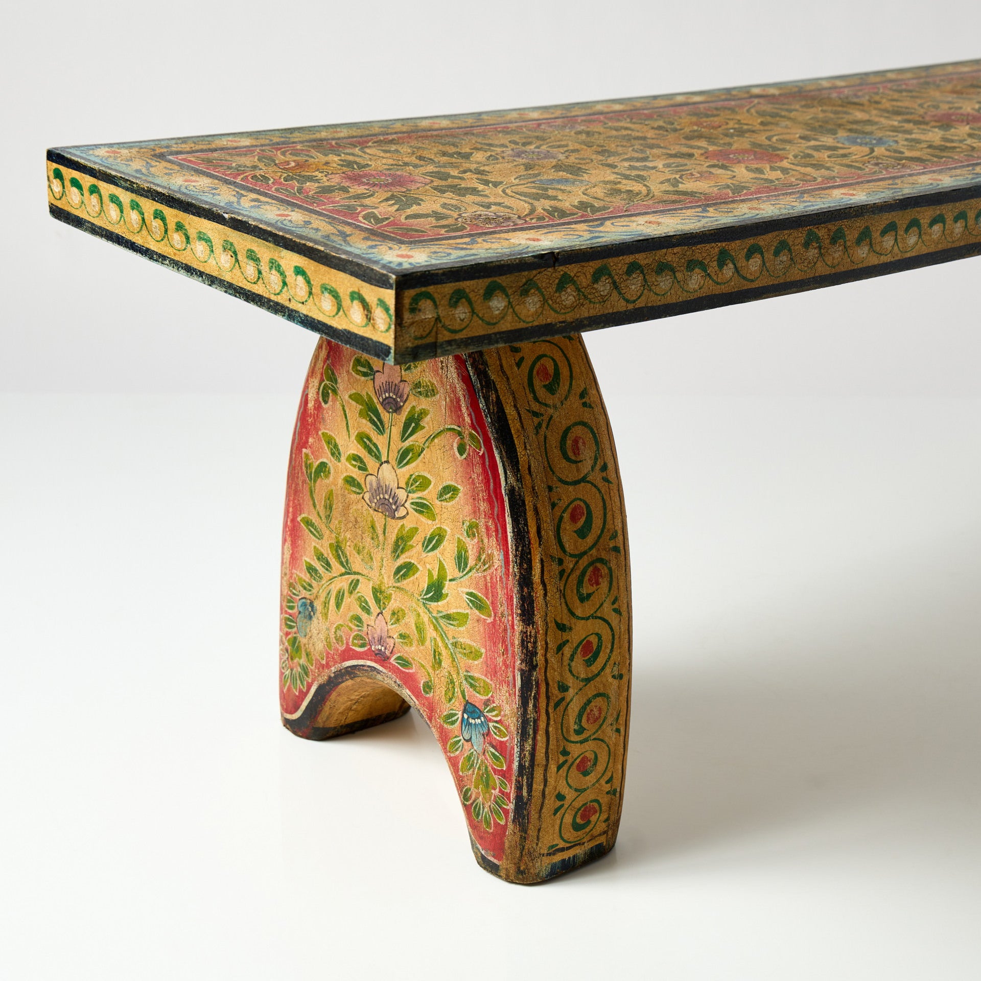 Băncuță din lemn masiv, decorată manual cu motive pictate, cu un aspect ușor patinat care îi pune în valoare detaliile și textura naturală a lemnului. Poate fi folosită atât ca piesă practică, pentru ședere, cât și ca element decorativ într-un hol, la capătul patului, într-un living sau într-un spațiu comercial precum un showroom, boutique sau cafenea.