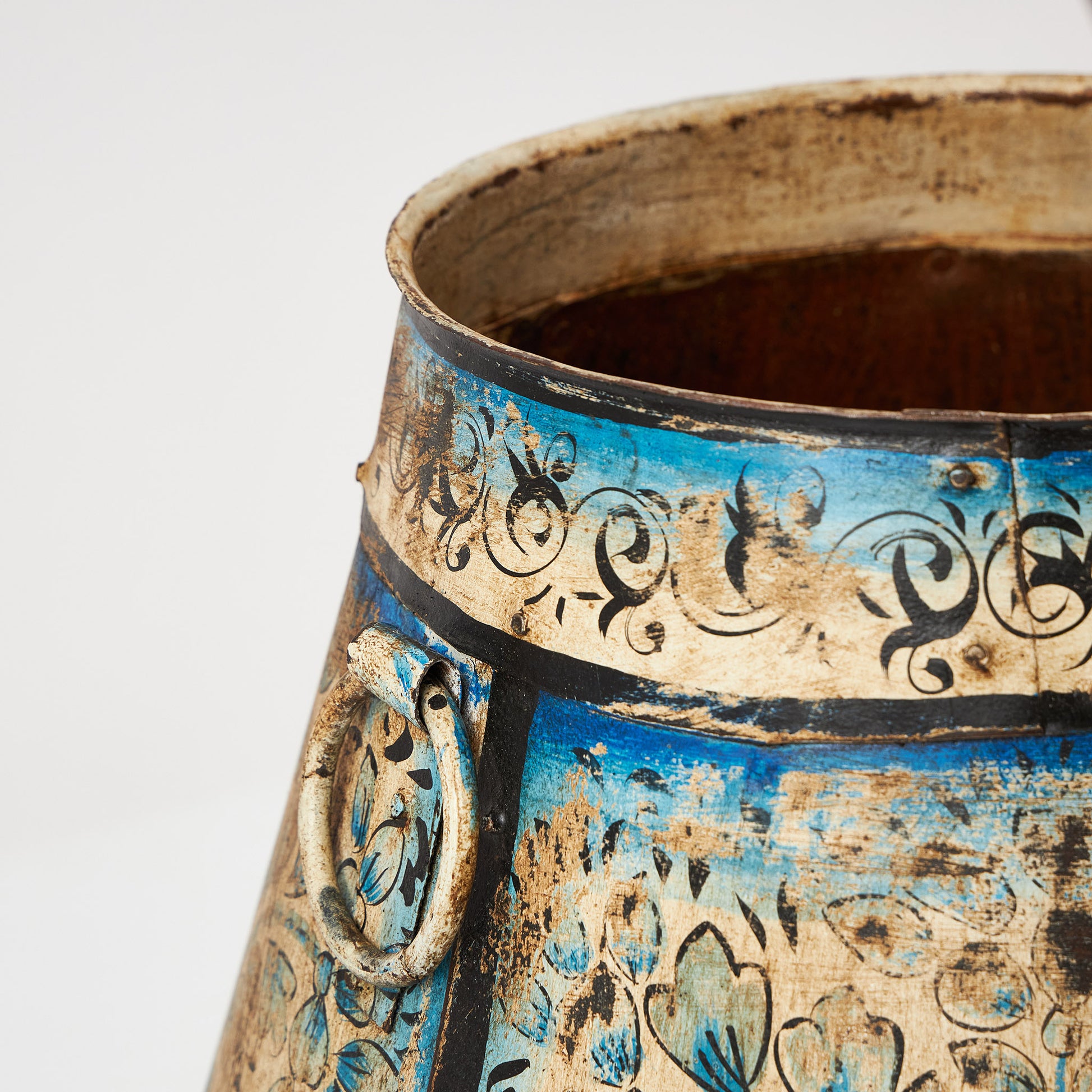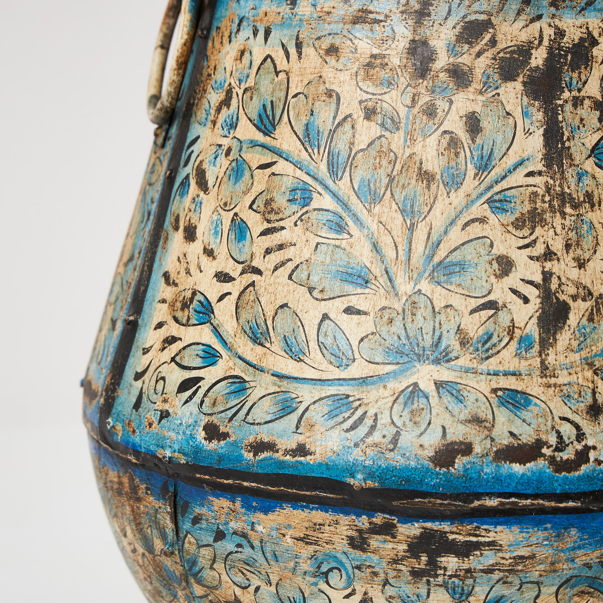 Vas metalic de dimensiune mare, decorat manual cu motive florale albastre pe fundal deschis. Este o piesă care atrage privirea și poate fi integrată atât într-un living sau hol, cât și pe o terasă acoperită. Poate fi folosit ca decor de sine stătător sau ca suport pentru plante uscate ori ramuri decorative.