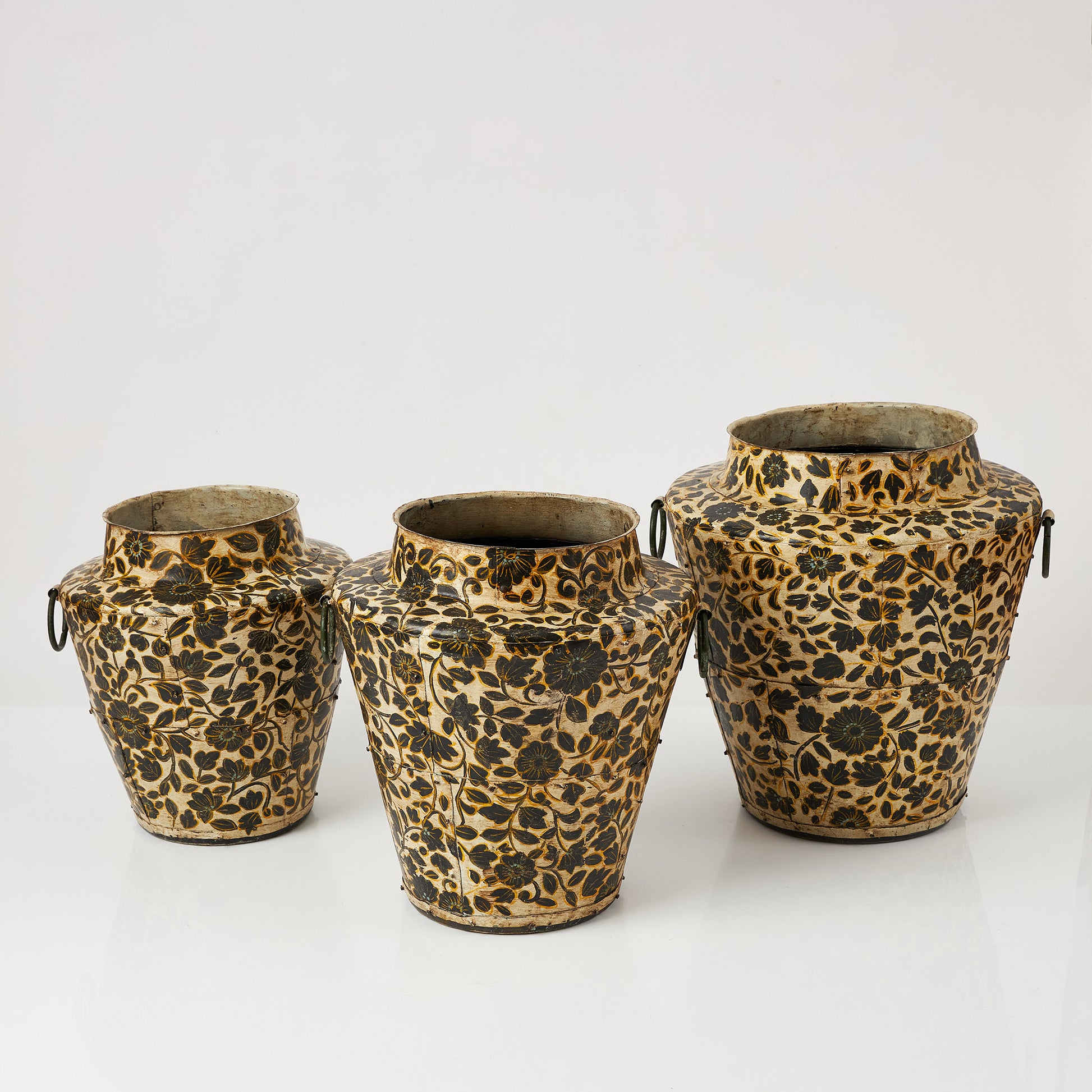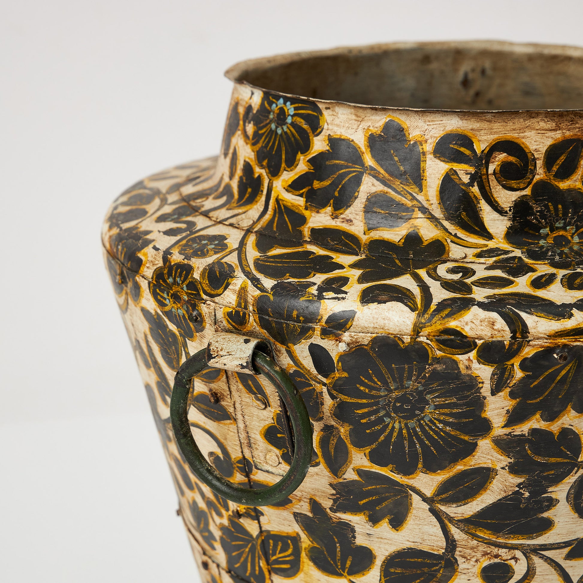 Vas decorativ din metal, pictat manual cu motive florale negre pe fond deschis. Datorită dimensiunii, poate fi folosit ca obiect de accent în living, hol sau pe terasă. Îl poți așeza gol sau îl poți folosi ca suport pentru crengi decorative sau flori uscate.