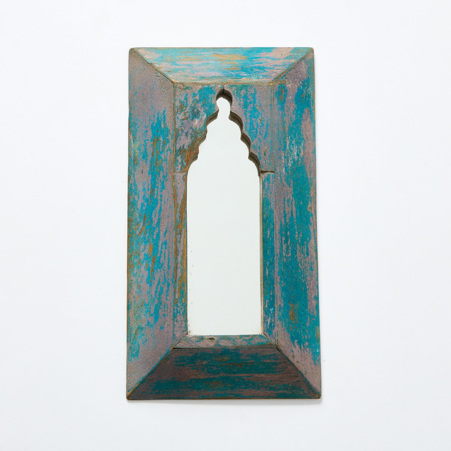 Oglindă de perete cu ramă din lemn de mango, în nuanță albastru deschis cu efect ușor patinat. Rama are o formă inspirată din arcadele orientale și este realizată manual, evidențiind textura naturală a lemnului. Poate fi montată pe perete deasupra unei console, lângă un cuier sau integrată într-o compoziție de rame și obiecte decorative. Este potrivită pentru amenajări boho, exotice sau spații decorate cu mobilier din lemn.