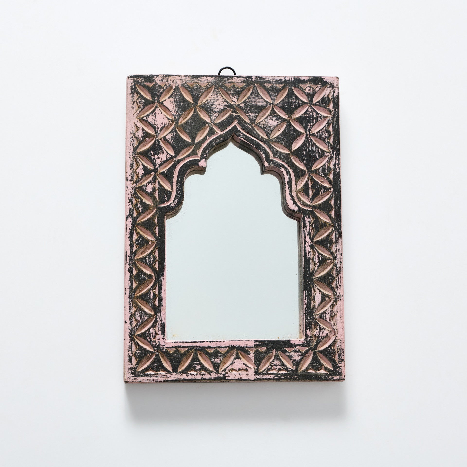 Oglindă cu ramă din lemn de mango sculptată manual, decorată cu motive geometrice inspirate din stilul oriental. Rama are un finisaj ușor patinat care evidențiază detaliile sculptate și textura naturală a lemnului. Oglinda poate fi montată pe perete în hol, living, dormitor sau într-un spațiu de tip dressing. Este potrivită pentru amenajări boho, exotice sau rustice.