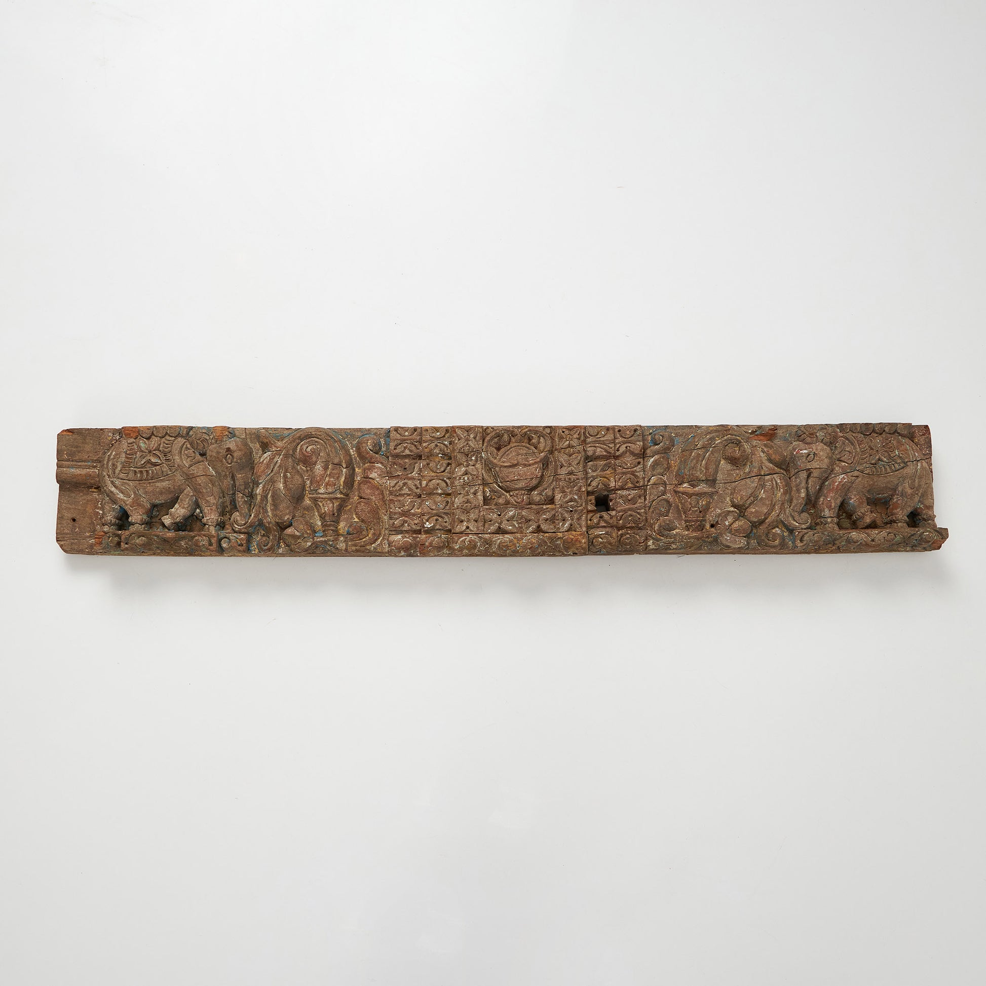 Această bară din lemn masiv este sculptată manual cu motive tradiționale și figuri de elefanți, simboluri ale norocului și puterii în cultura indiană. Poate fi agățată pe perete ca element decorativ sau integrată într-un proiect de amenajare interioară pentru a aduce o notă autentică și un strop de istorie în casă.
