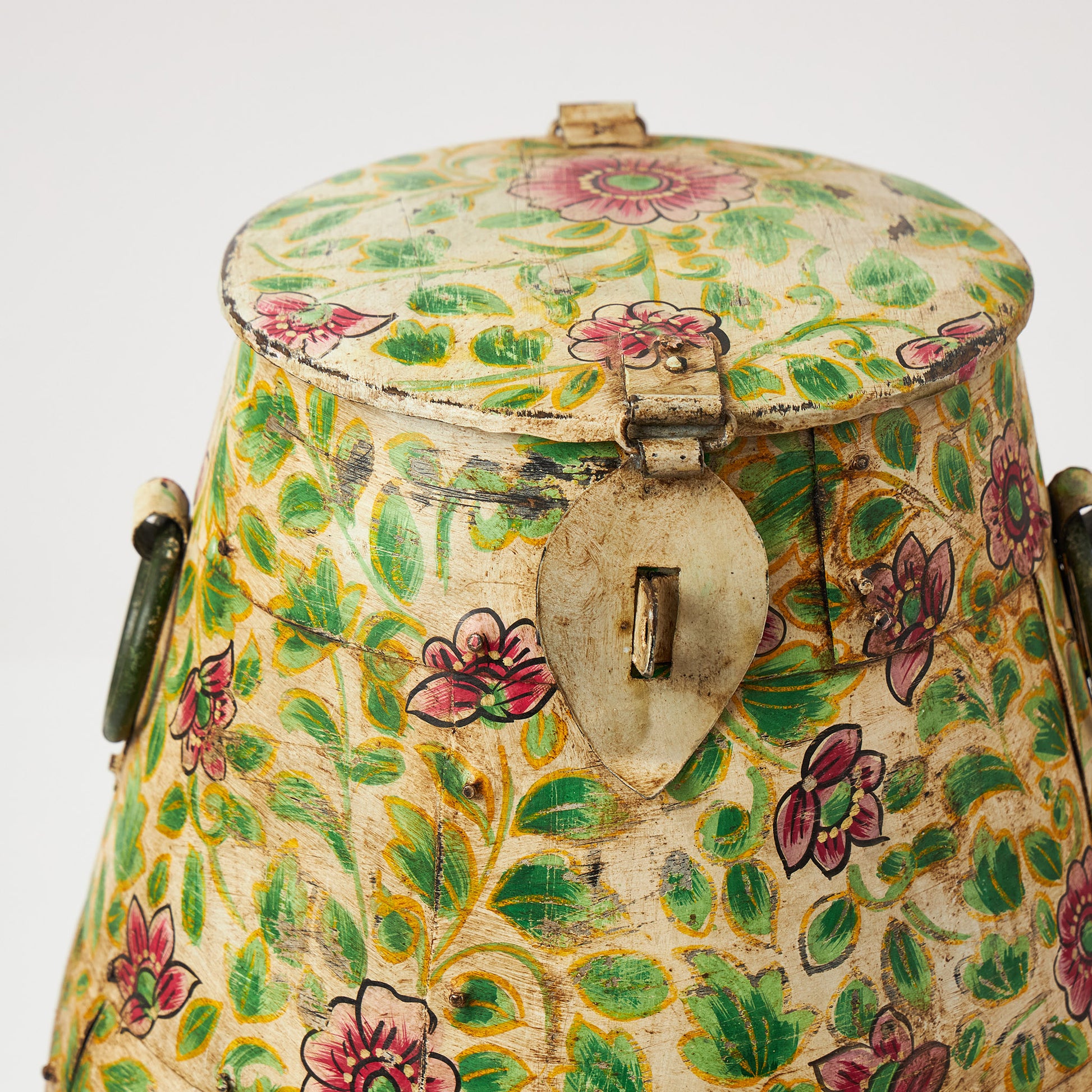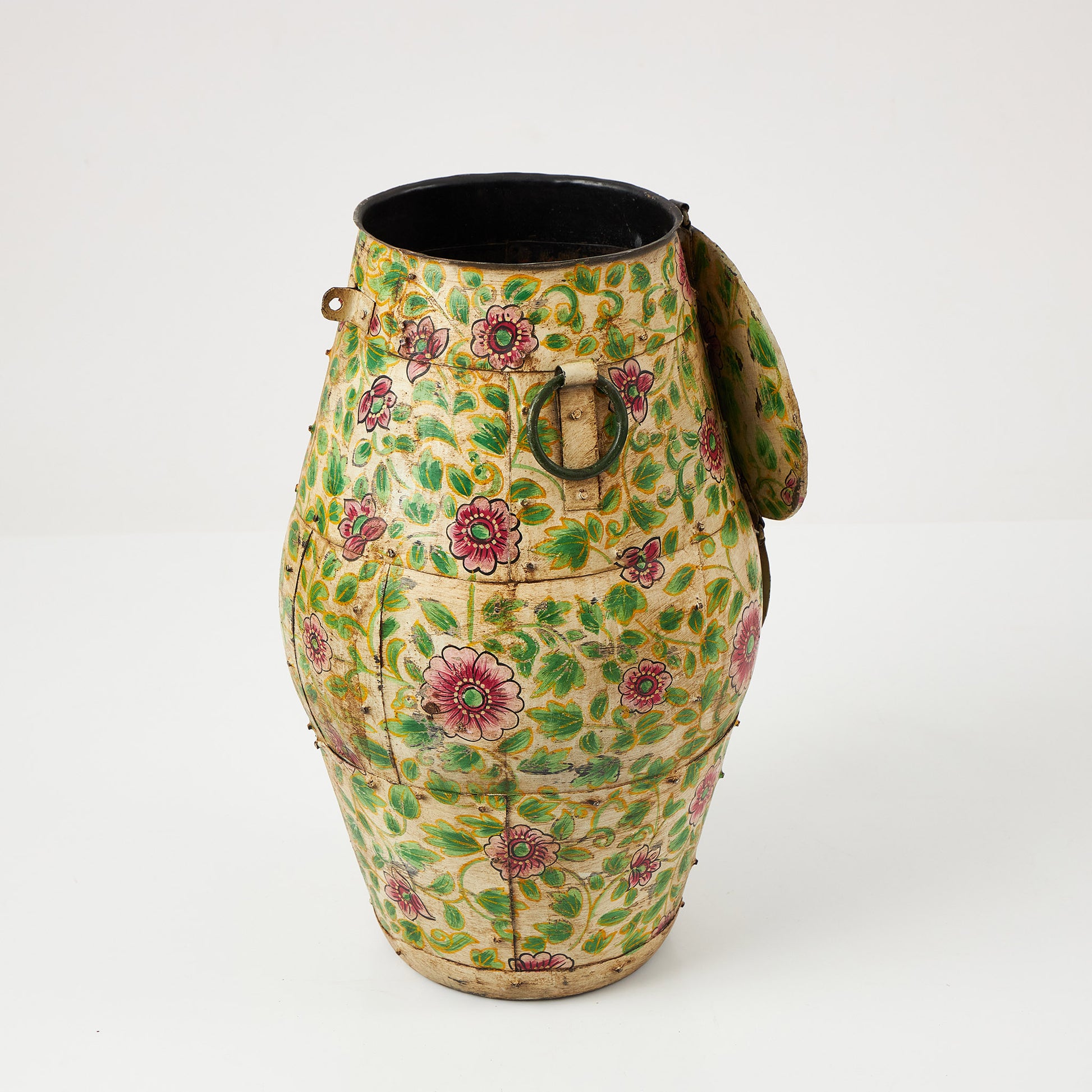 Un vas din metal decorat manual cu flori în nuanțe de verde și roz, ce aduce un plus de culoare în orice spațiu. Poate fi folosit ca obiect decorativ sau pentru a pune în el flori uscate ori ramuri. Se potrivește pe o masă, într-un colț de living sau chiar pe balcon.