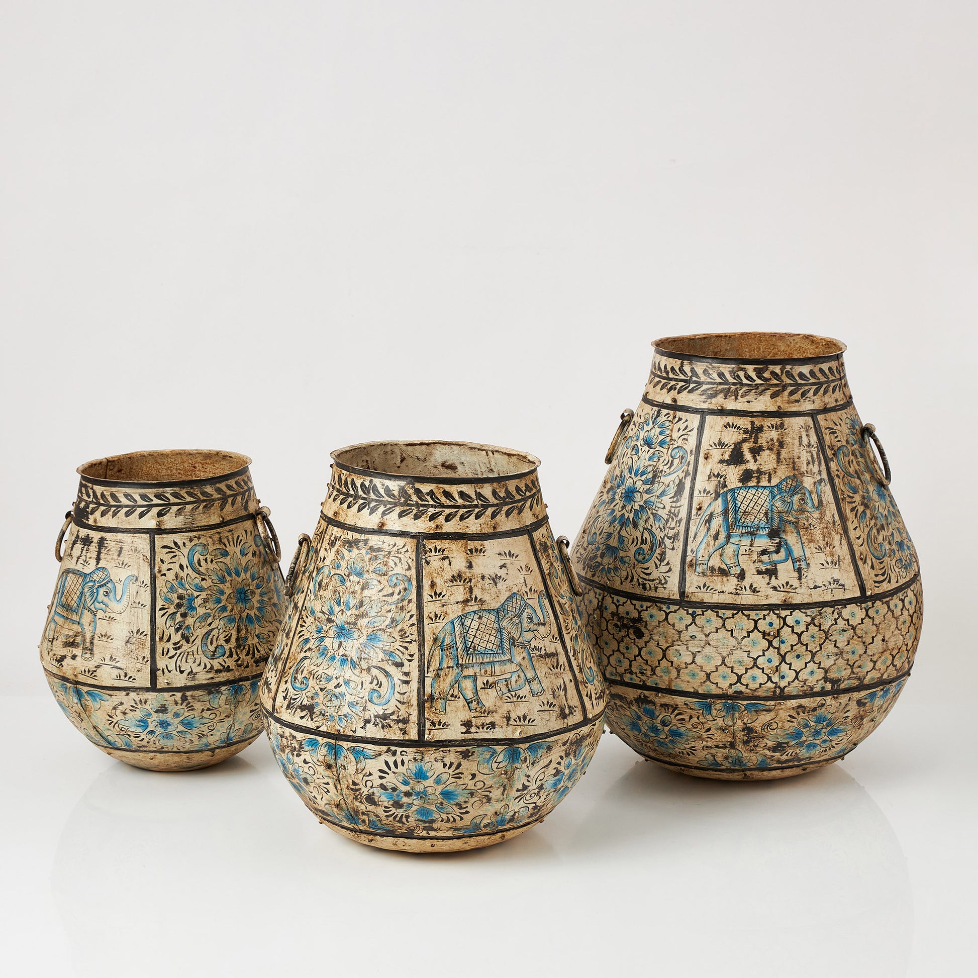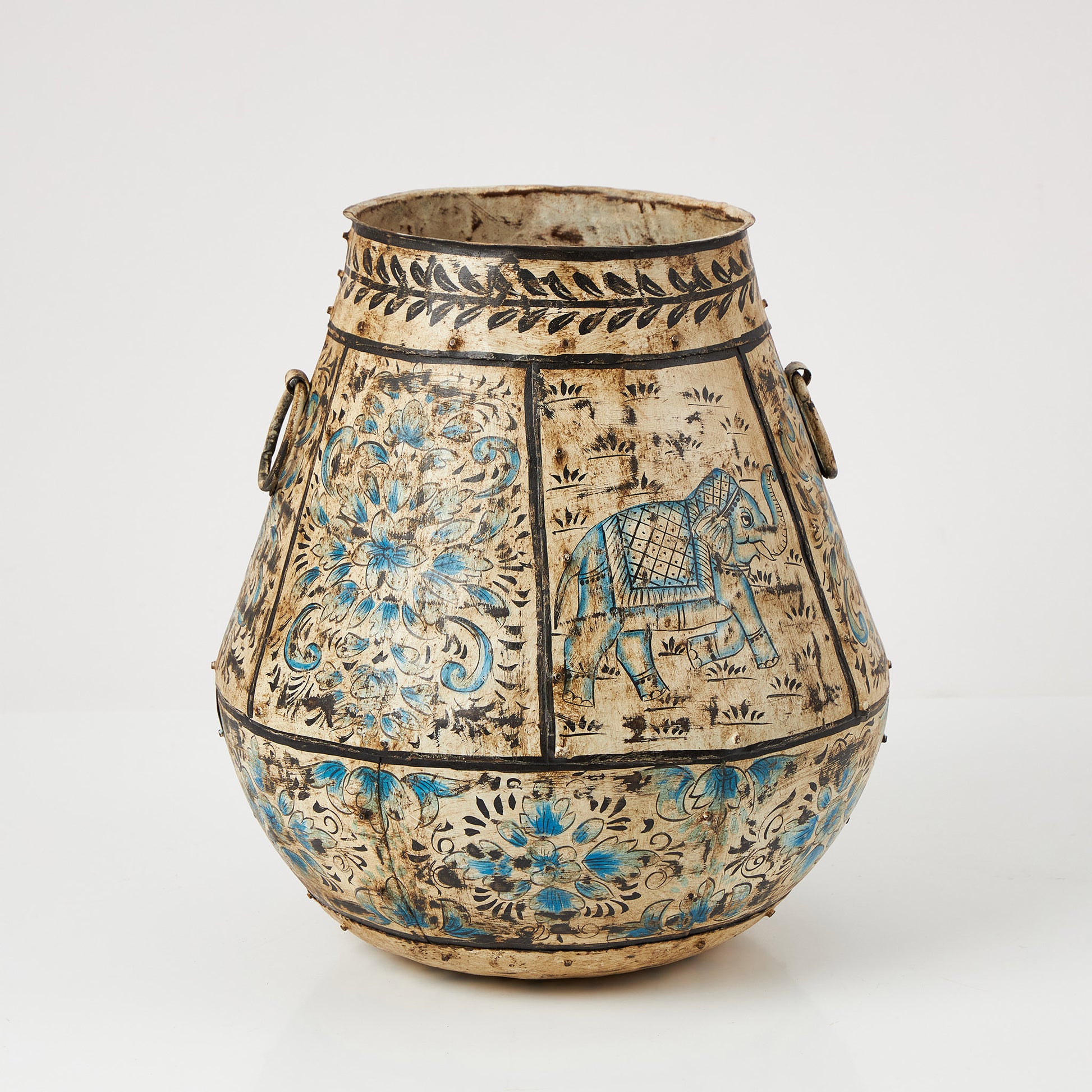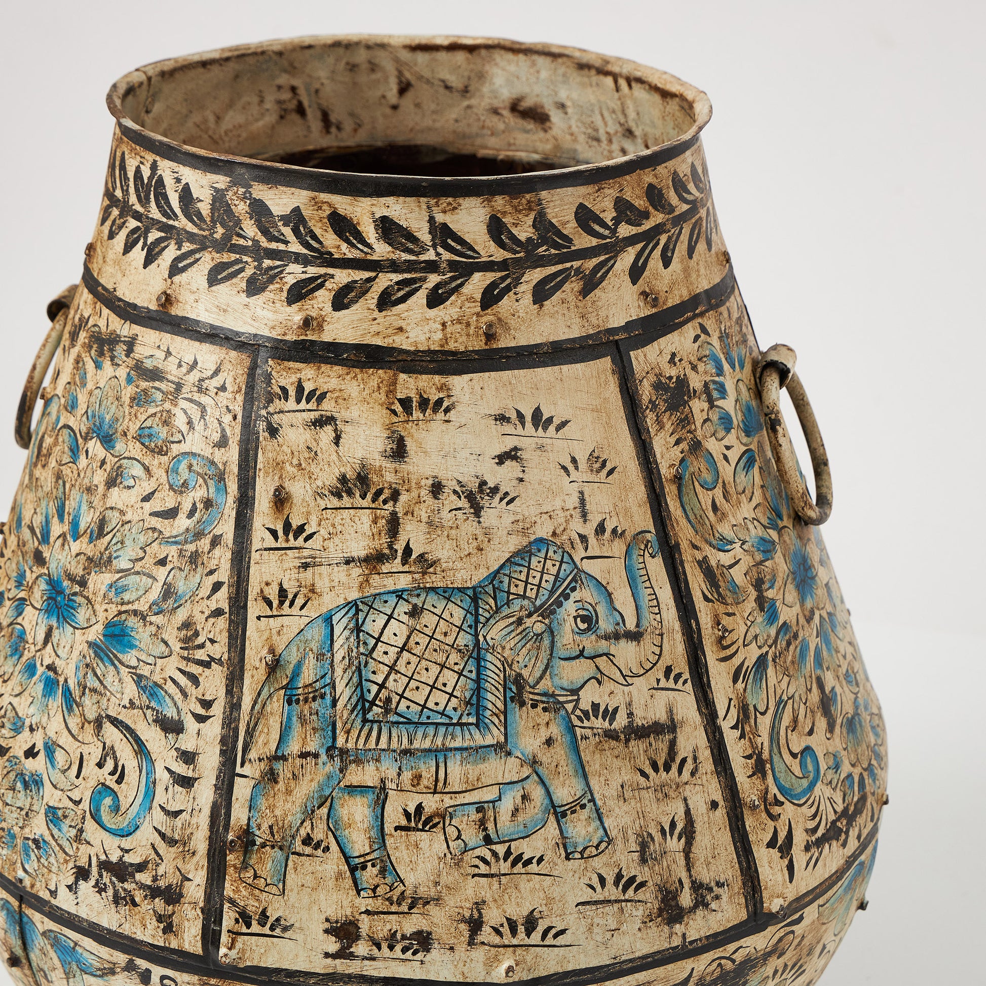 Vas lucrat manual din metal, decorat cu motive florale și figurative, în nuanțe de albastru și crem. Ilustrația cu elefant adaugă un aer exotic și tradițional. Poate fi folosit ca obiect decorativ în living, pe hol sau pe terasă, dar și ca suport pentru flori uscate ori crengi decorative.