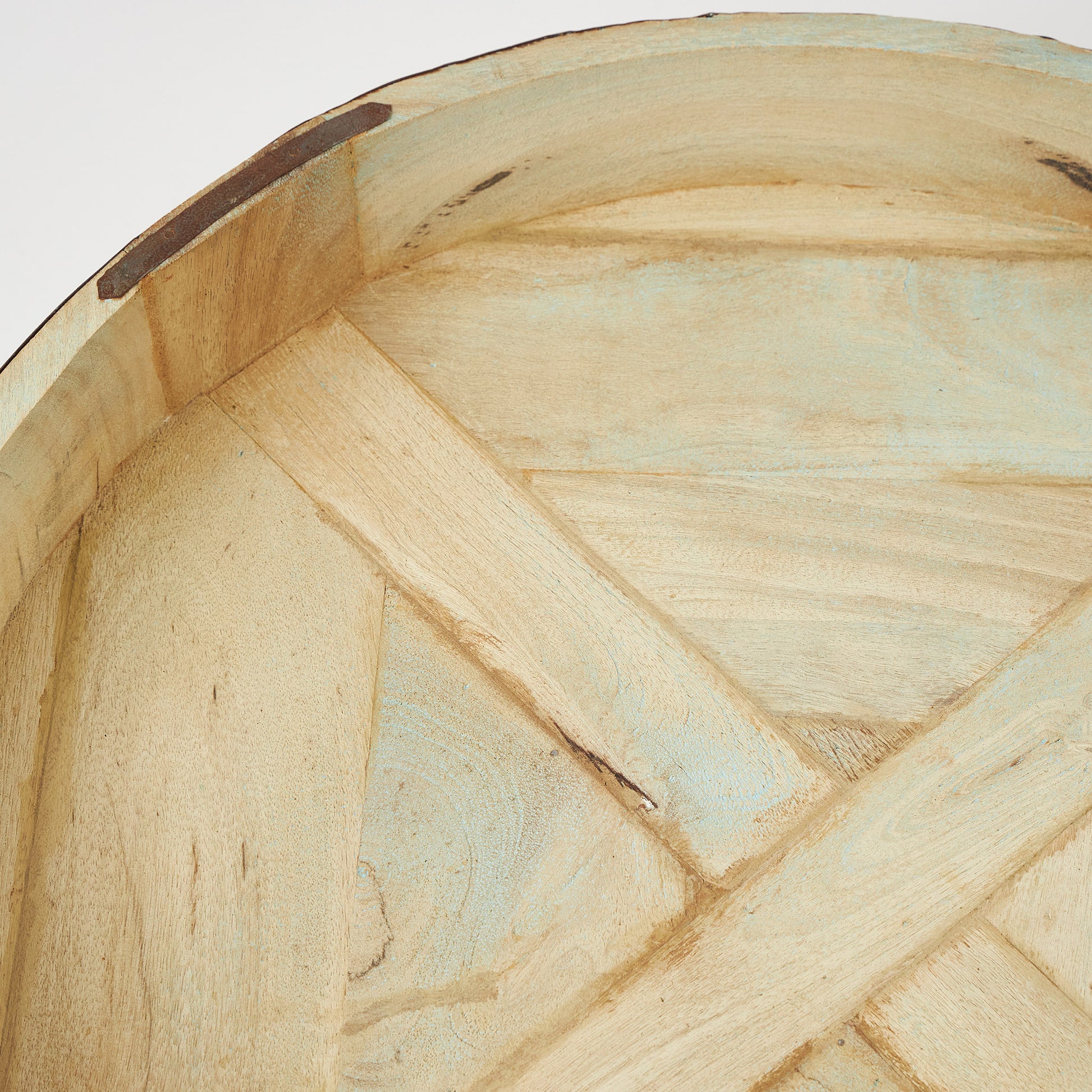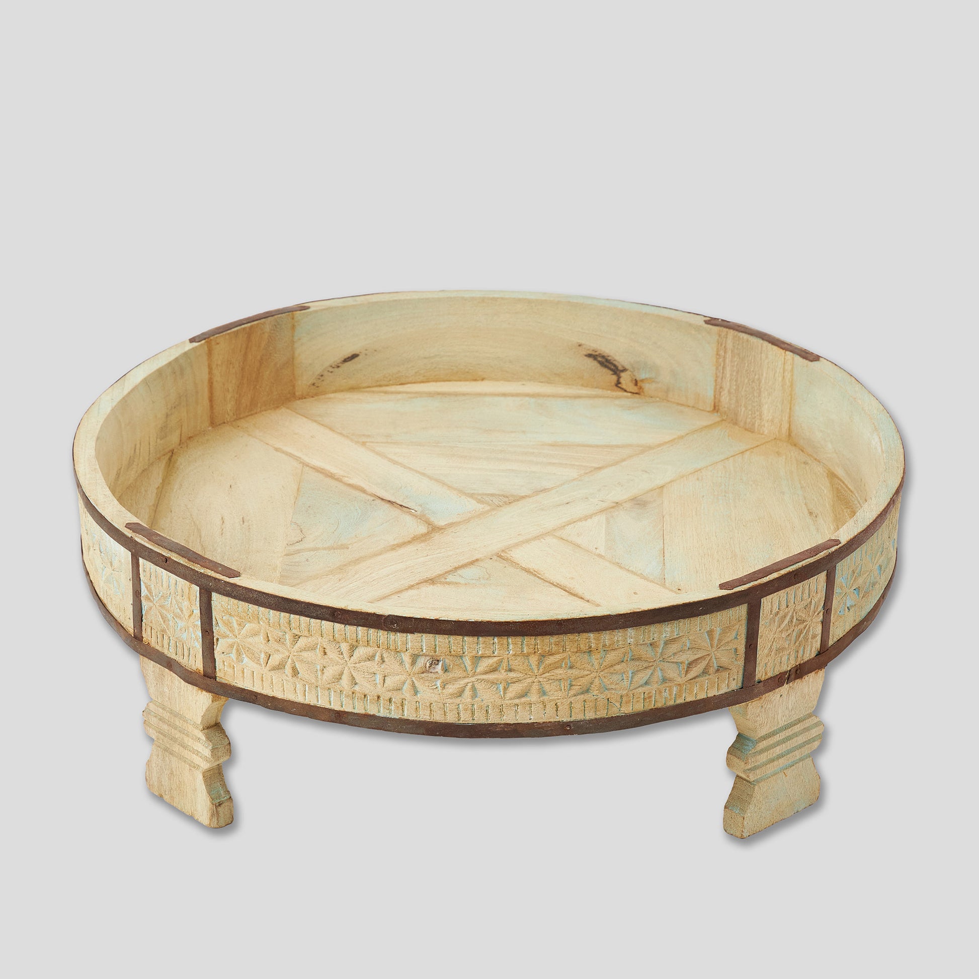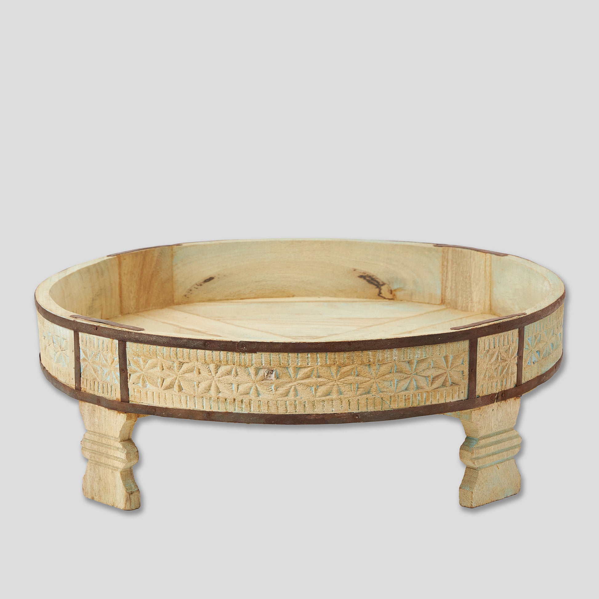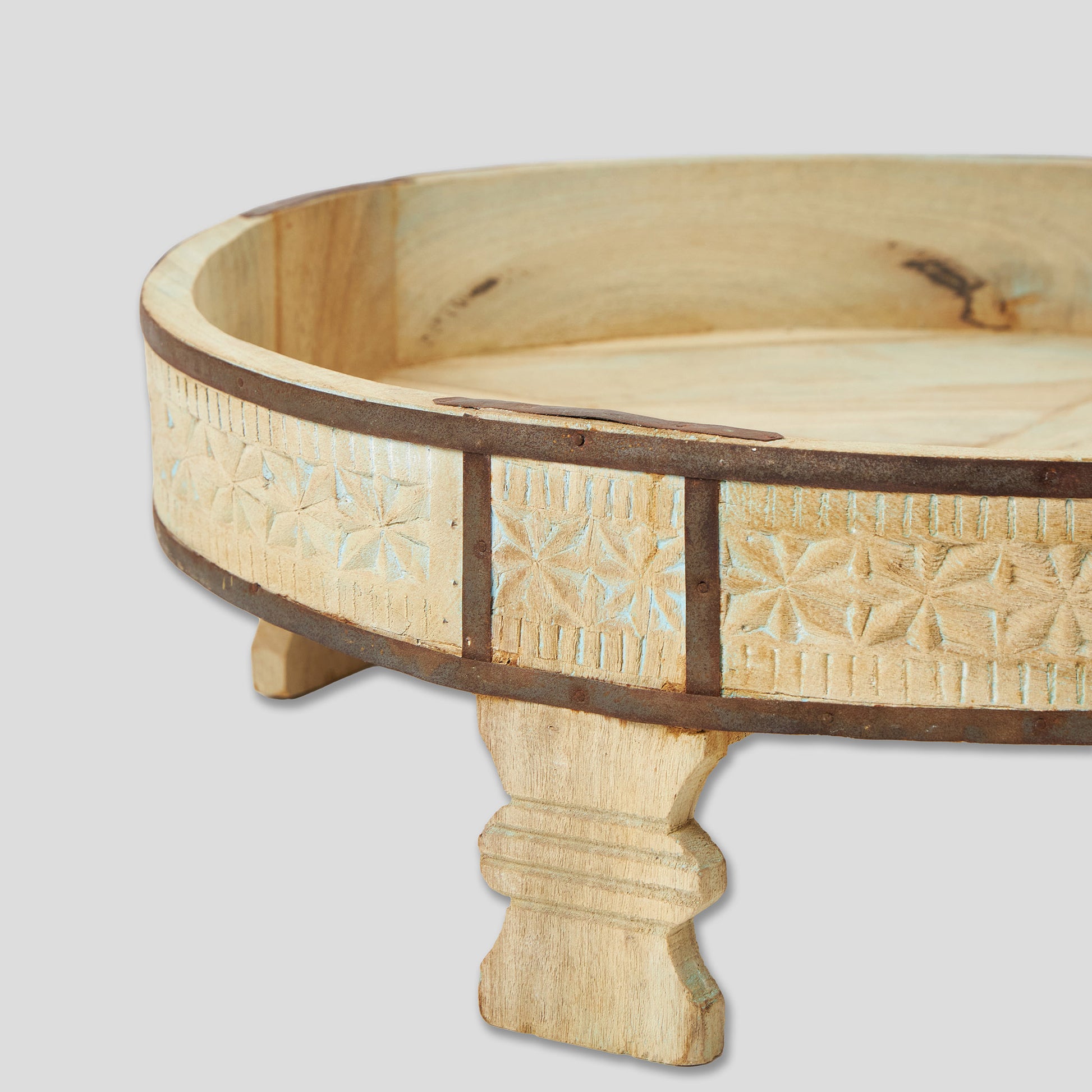 Confecționată manual din lemn masiv, această masă joasă are detalii sculptate discret pe margine și un design rotund sprijinit pe picioare solide. Poate fi folosită ca suport pentru obiecte decorative, lumânări, aranjamente florale sau chiar ca măsuță de servire în spații de relaxare.