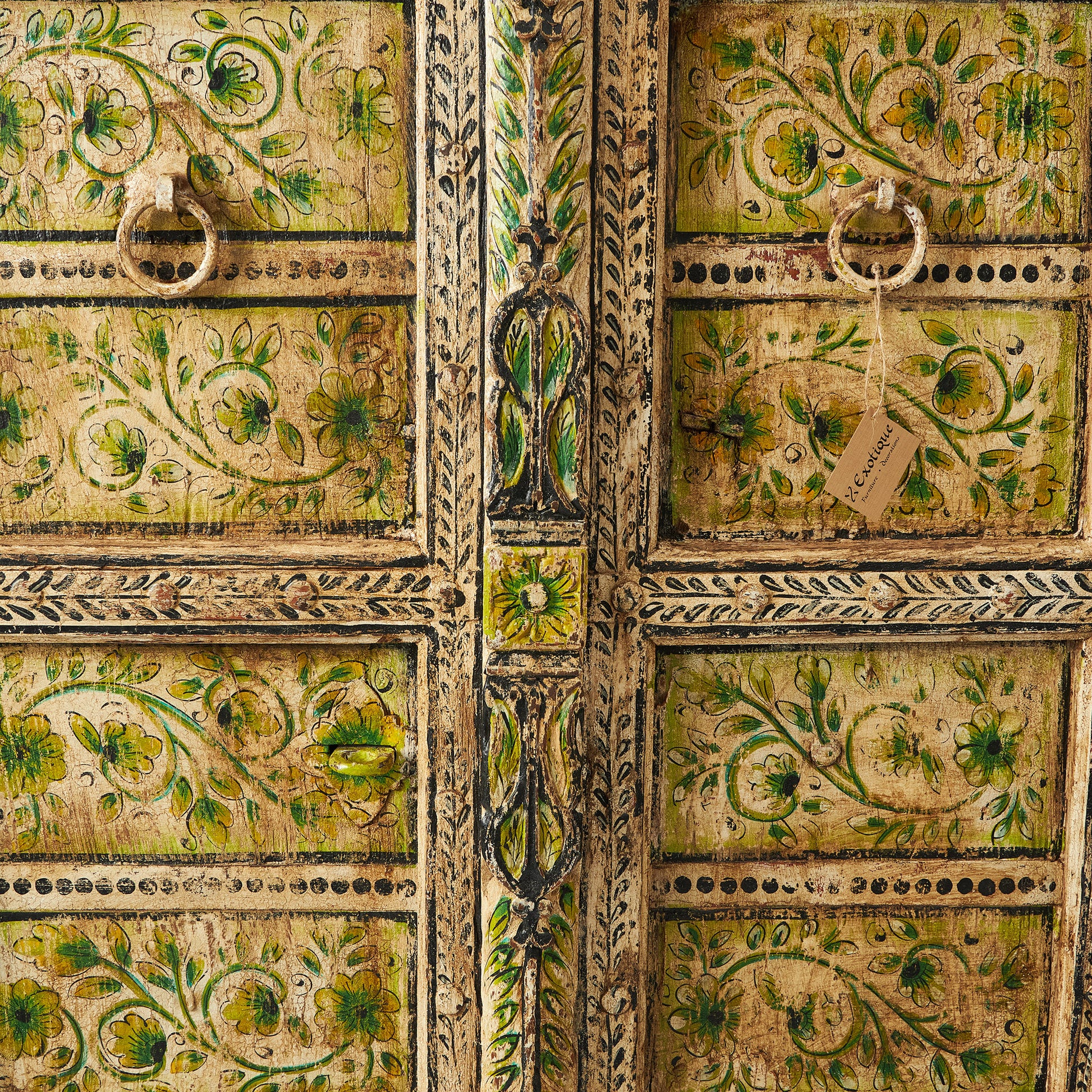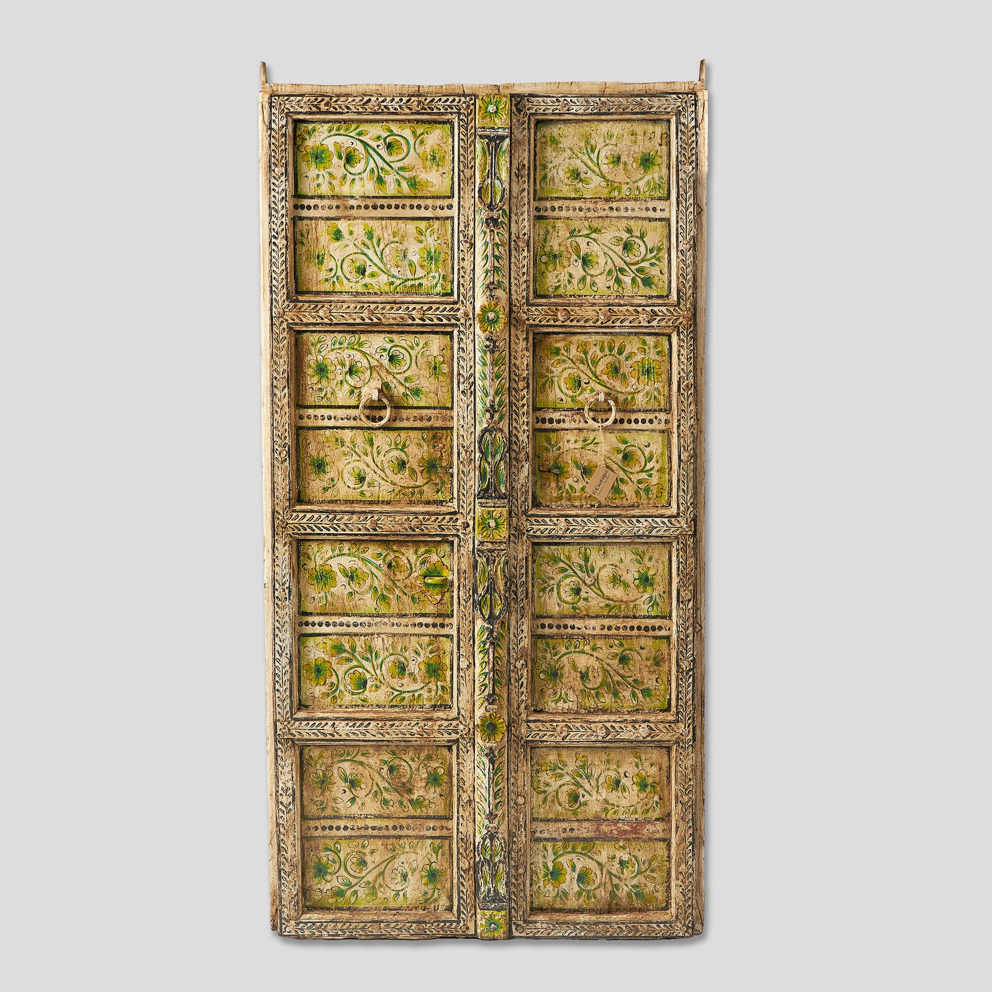 Acest panou decorativ este lucrat din lemn și decorat manual cu motive florale în nuanțe de verde. Forma sa, inspirată de stilul porților tradiționale indiene, îl transformă într-o piesă de accent ce poate fi folosită atât ca element decorativ pe perete, cât și ca fundal într-un spațiu de tip showroom, restaurant sau hotel.