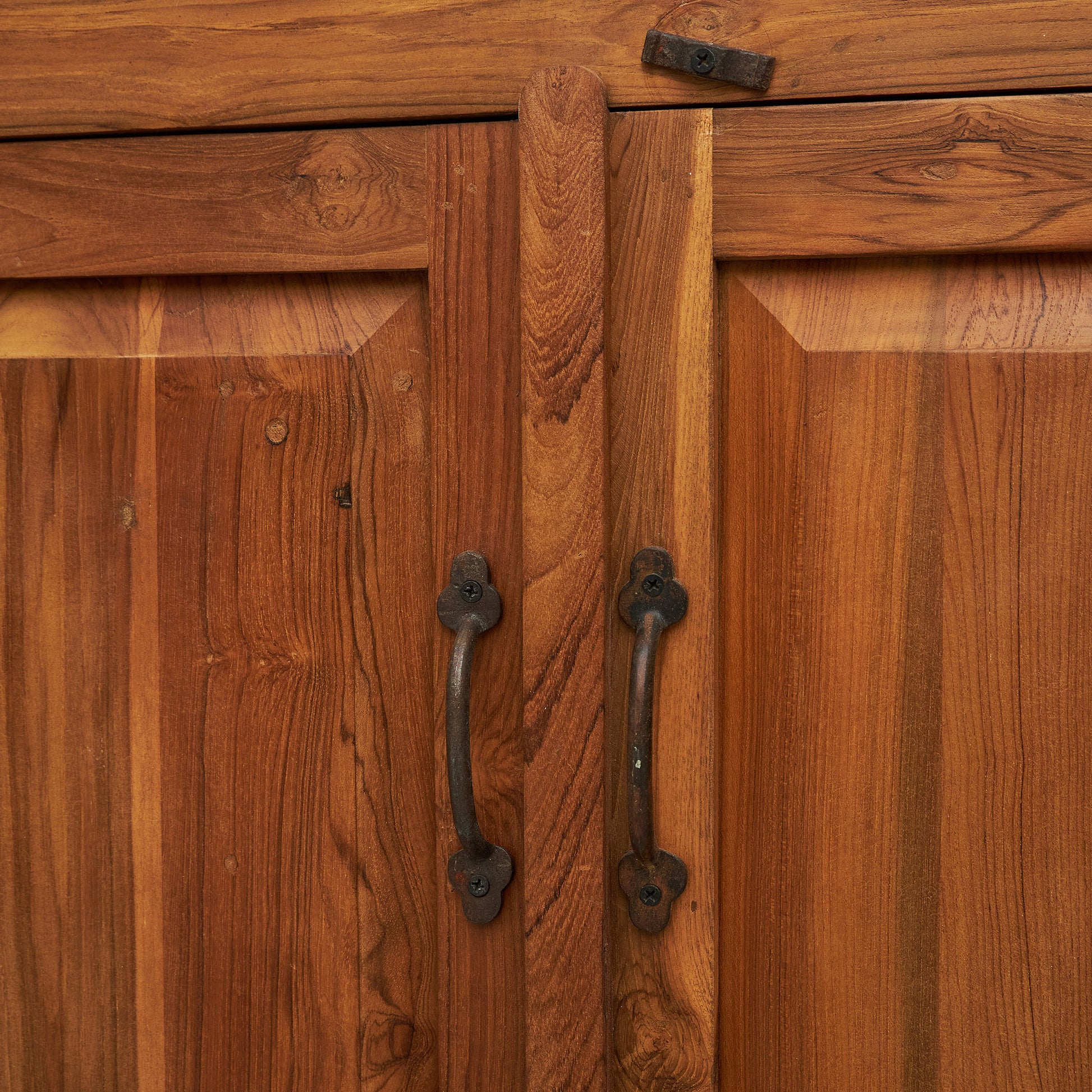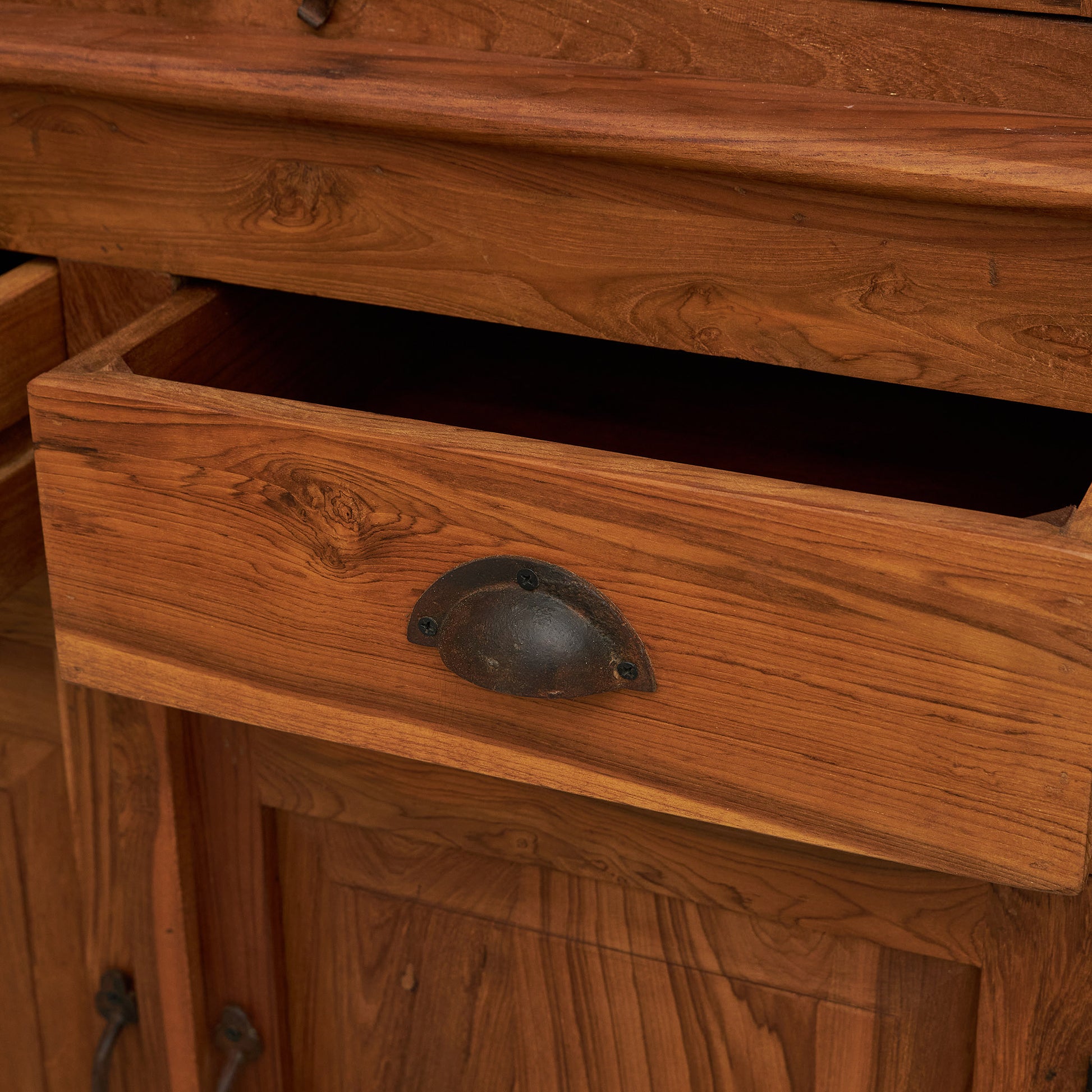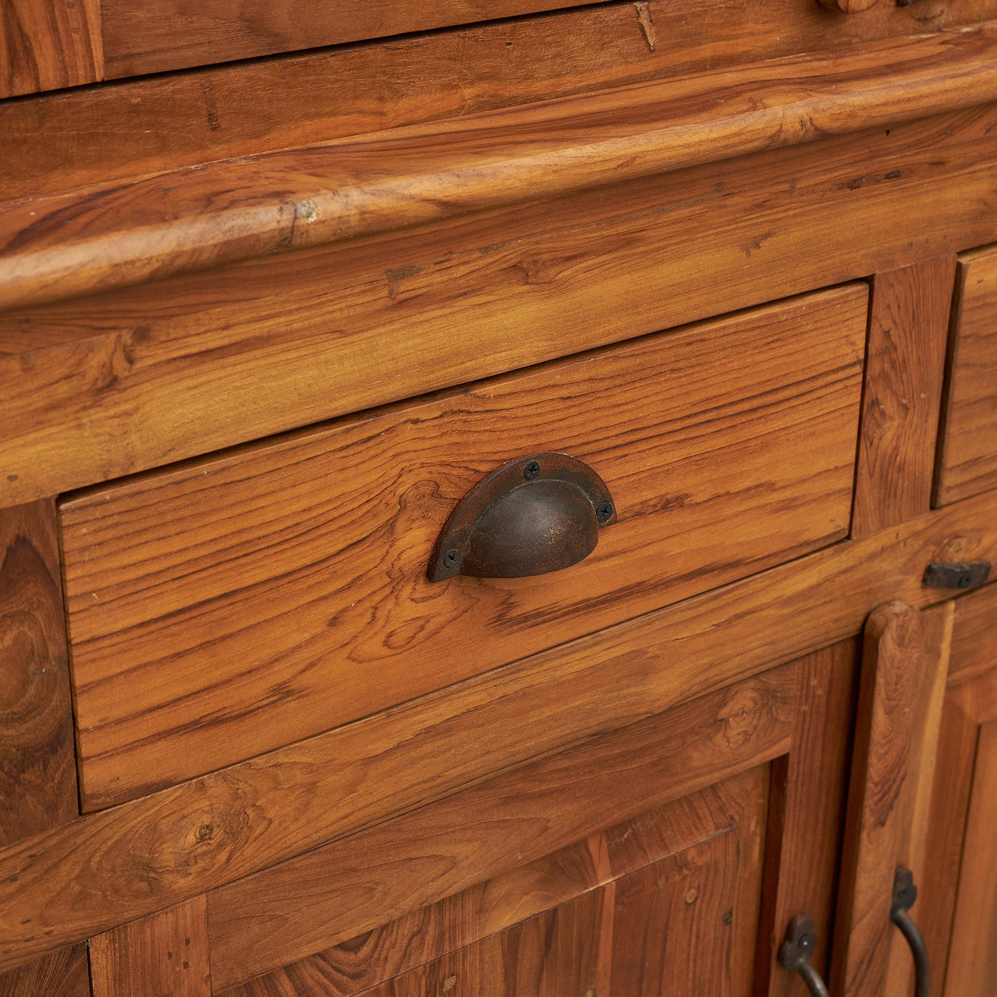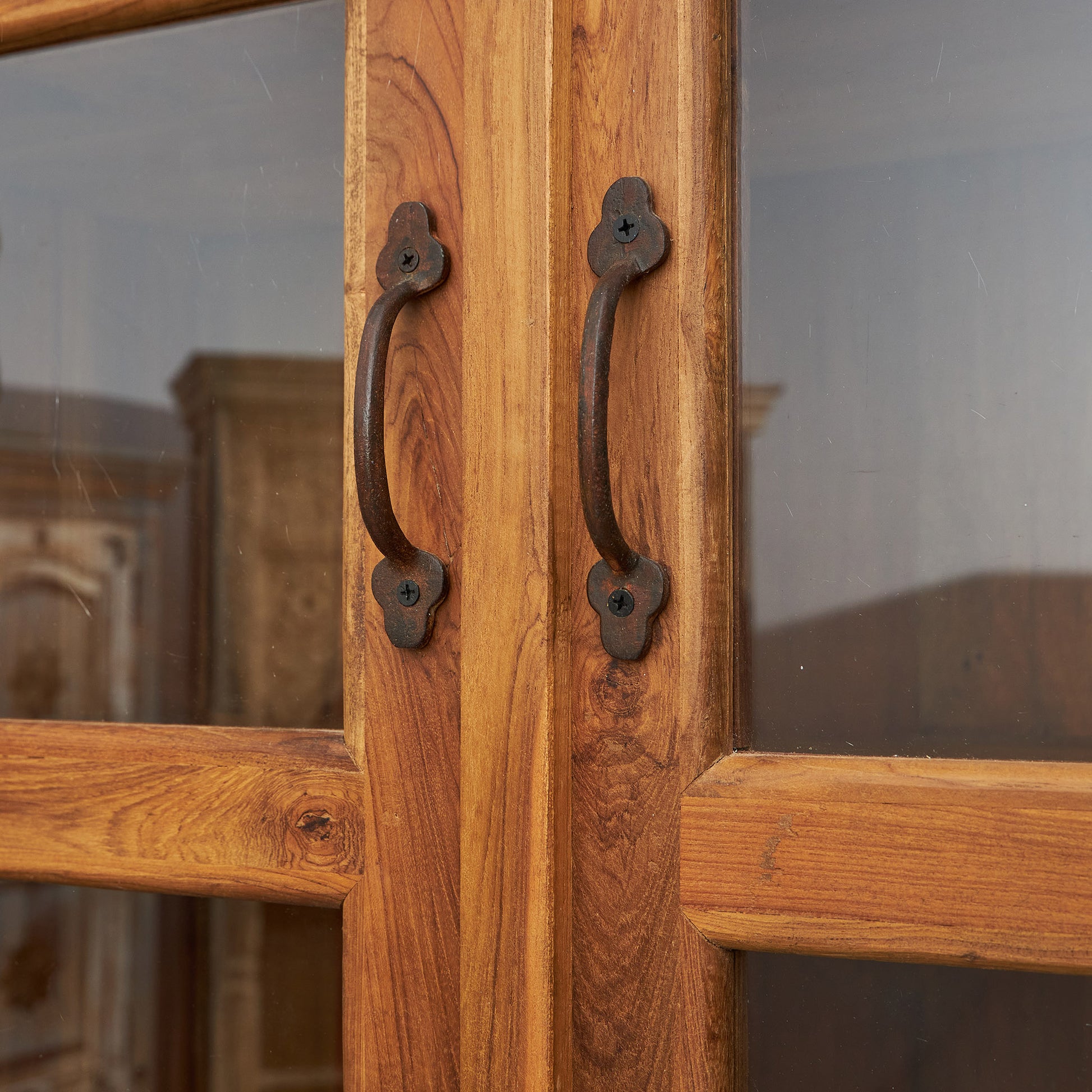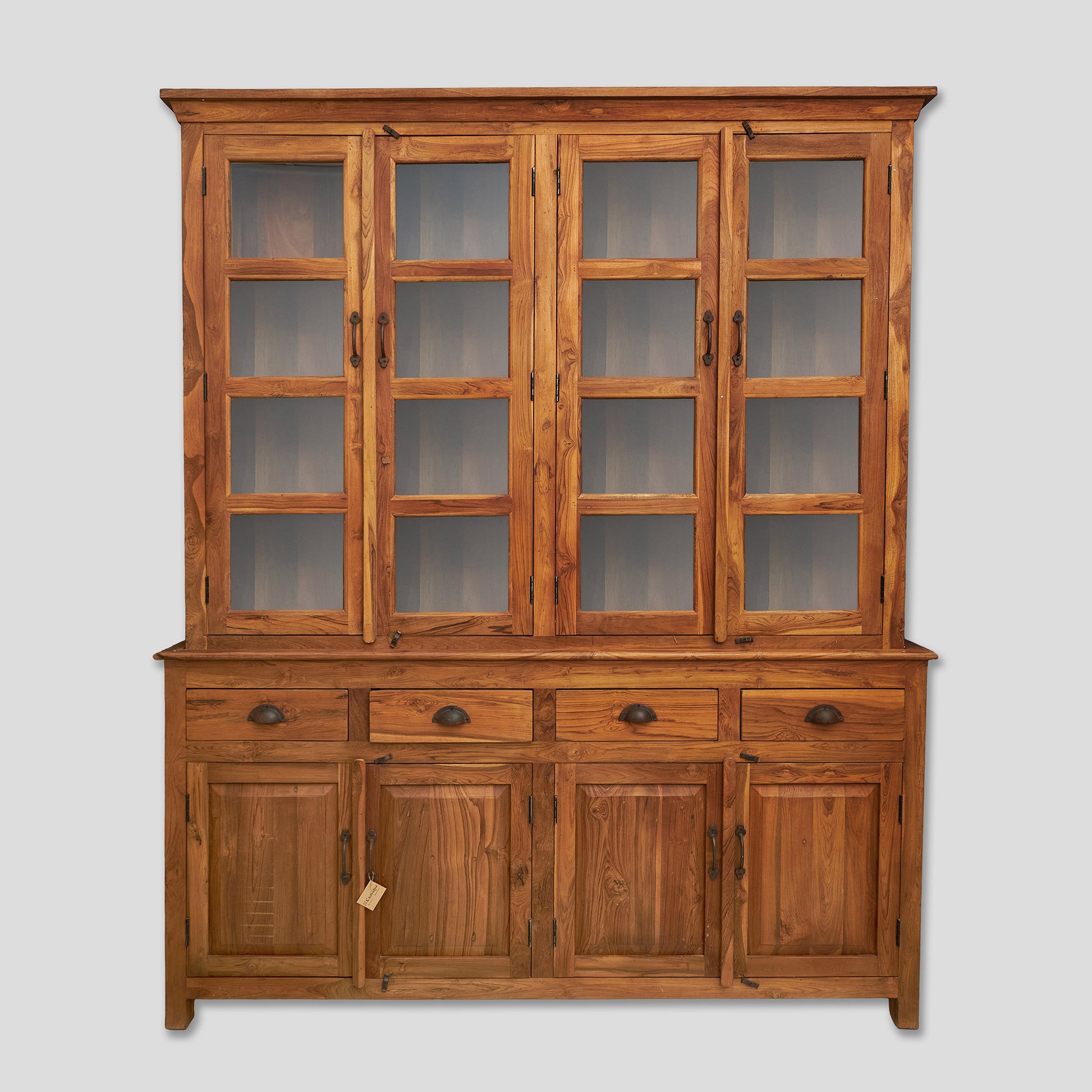 Acest dulap cu vitrină este realizat din lemn de tec, un material recunoscut pentru rezistența și durabilitatea sa. Piesa are o structură solidă, cu partea superioară prevăzută cu uși din sticlă, ideale pentru expunerea veselăriei, a obiectelor decorative sau a colecțiilor personale. Partea inferioară este dotată cu sertare și spații de depozitare închise, utile pentru organizarea obiectelor de uz zilnic. Designul simplu, dar elegant, îl face potrivit atât pentru dining, cât și pentru living sau spații de tip horeca unde este nevoie de o combinație între expunere și funcționalitate