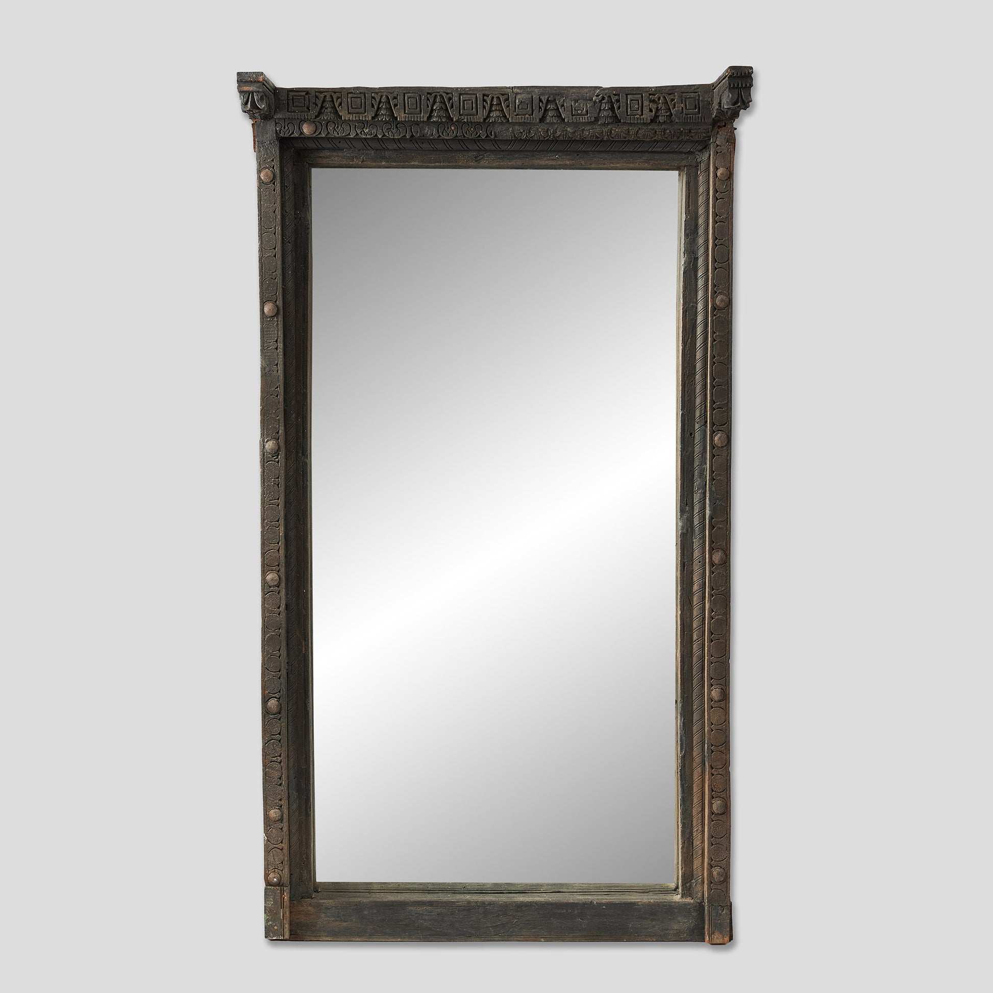 Aceasta este o oglindă dreptunghiulară cu ramă din lemn masiv, sculptată manual. Lemnul are o nuanță închisă și un aspect patinat, iar detaliile decorative sculptate îi dau un aer autentic, inspirat din stilul tradițional indian. Poate fi folosită atât ca piesă practică, cât și ca element decorativ de impact. Se potrivește bine într-un dormitor, într-o intrare spațioasă, dar și în restaurante.