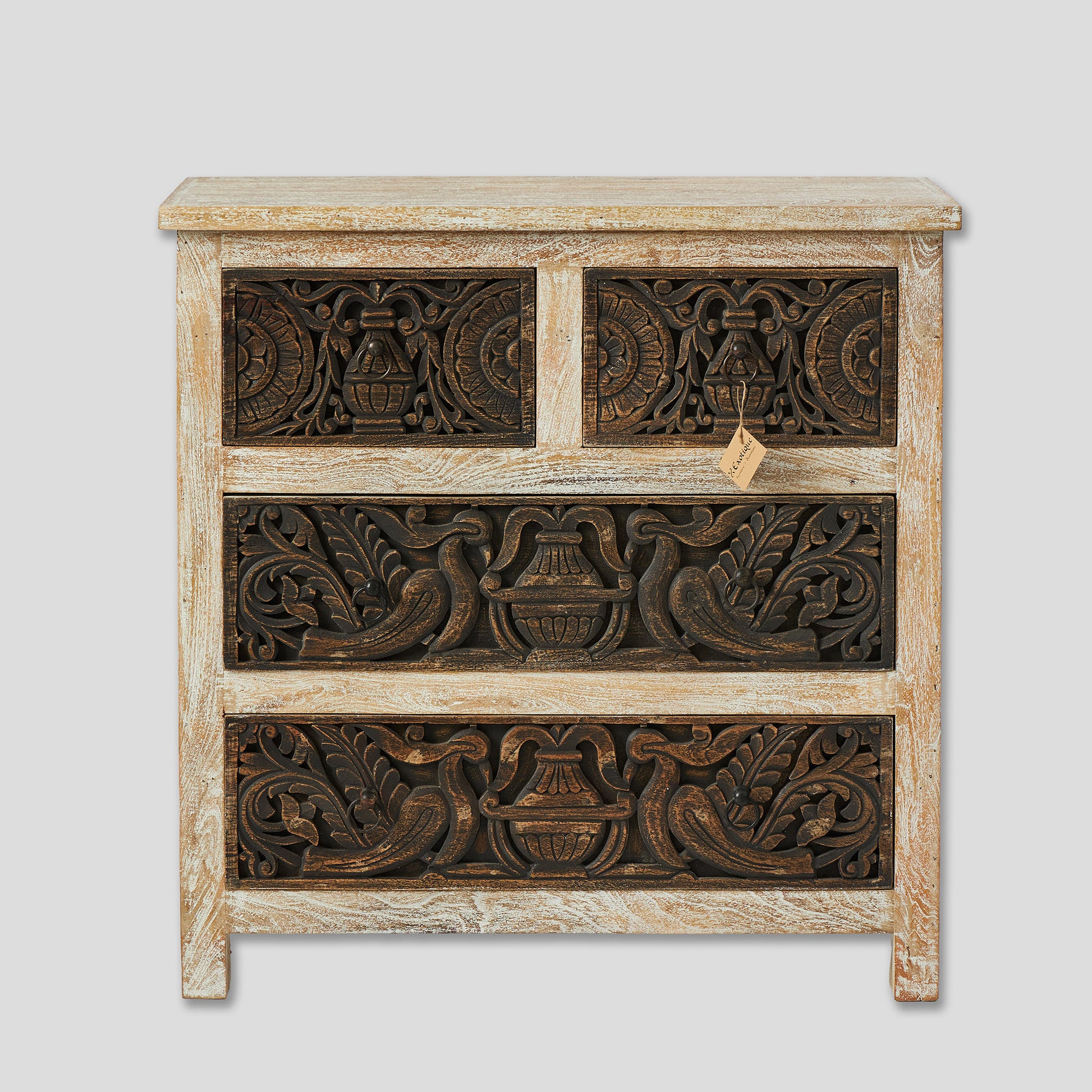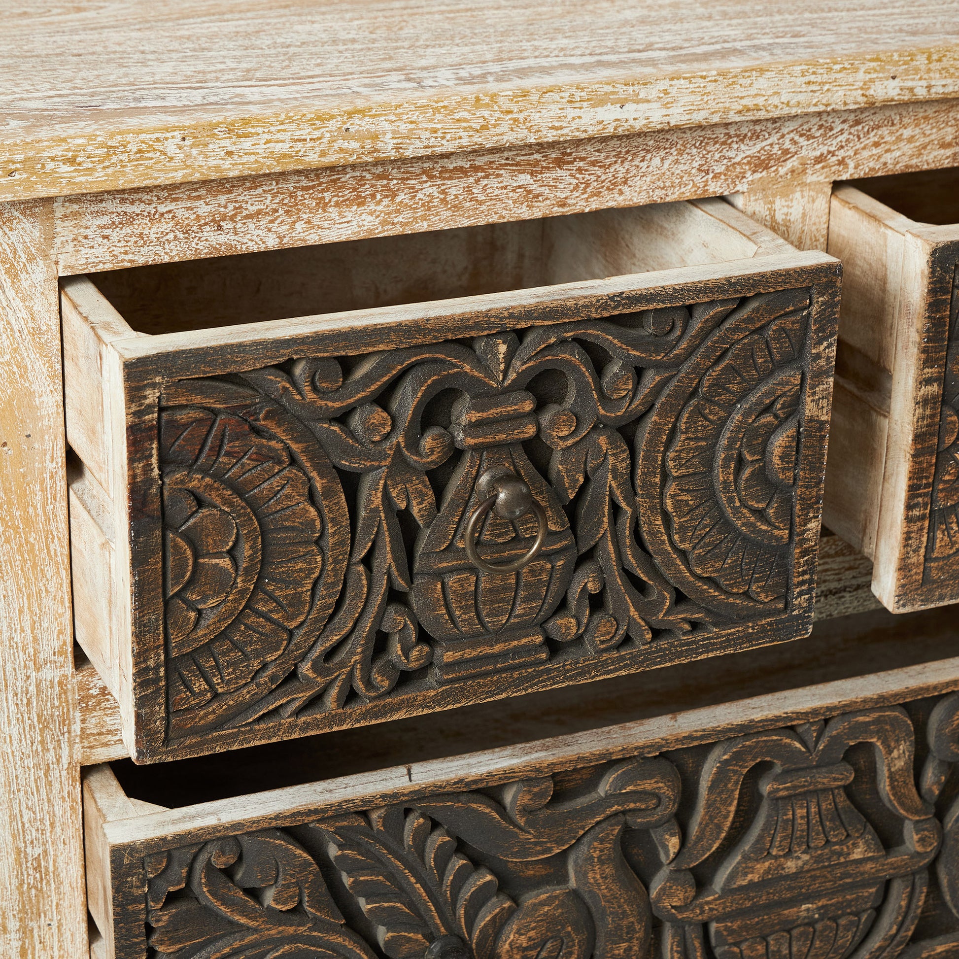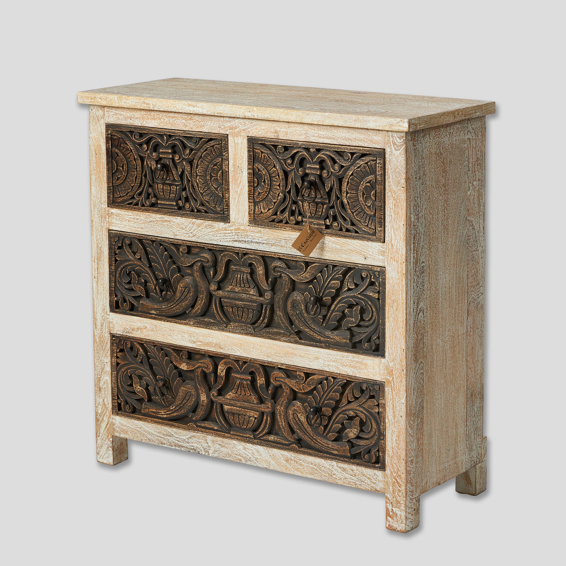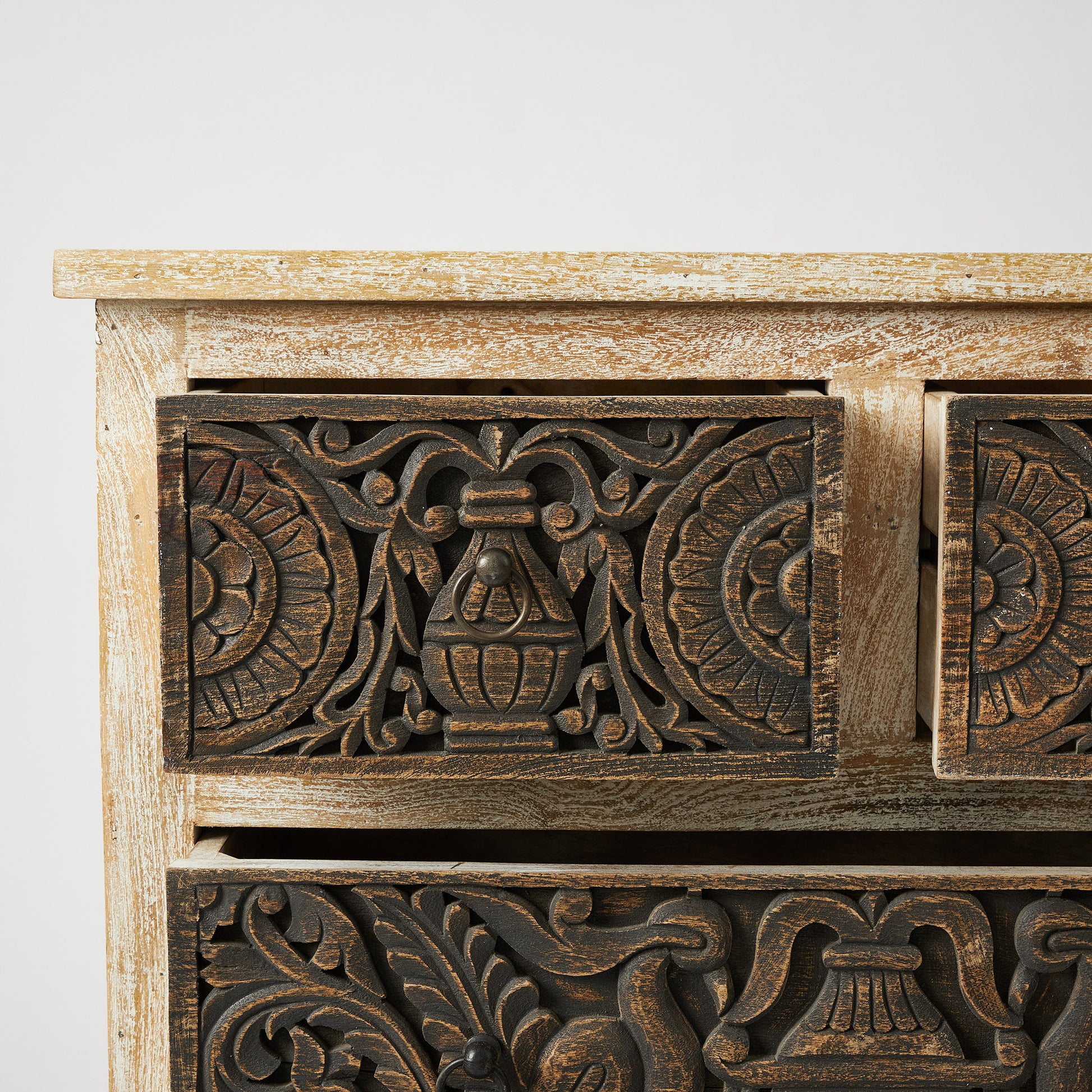 Comodă cu sertare din lemn sculptat, lucrată manual, cu detalii decorative fine și finisaj antichizat. Are sertare practice, potrivite pentru depozitarea documentelor, accesoriilor sau a altor obiecte utile. Datorită aspectului său deosebit, poate fi folosită atât în locuințe, cât și în spații precum birouri, pensiuni sau zone de recepție, unde oferă atât funcționalitate, cât și un accent distinct de decor.