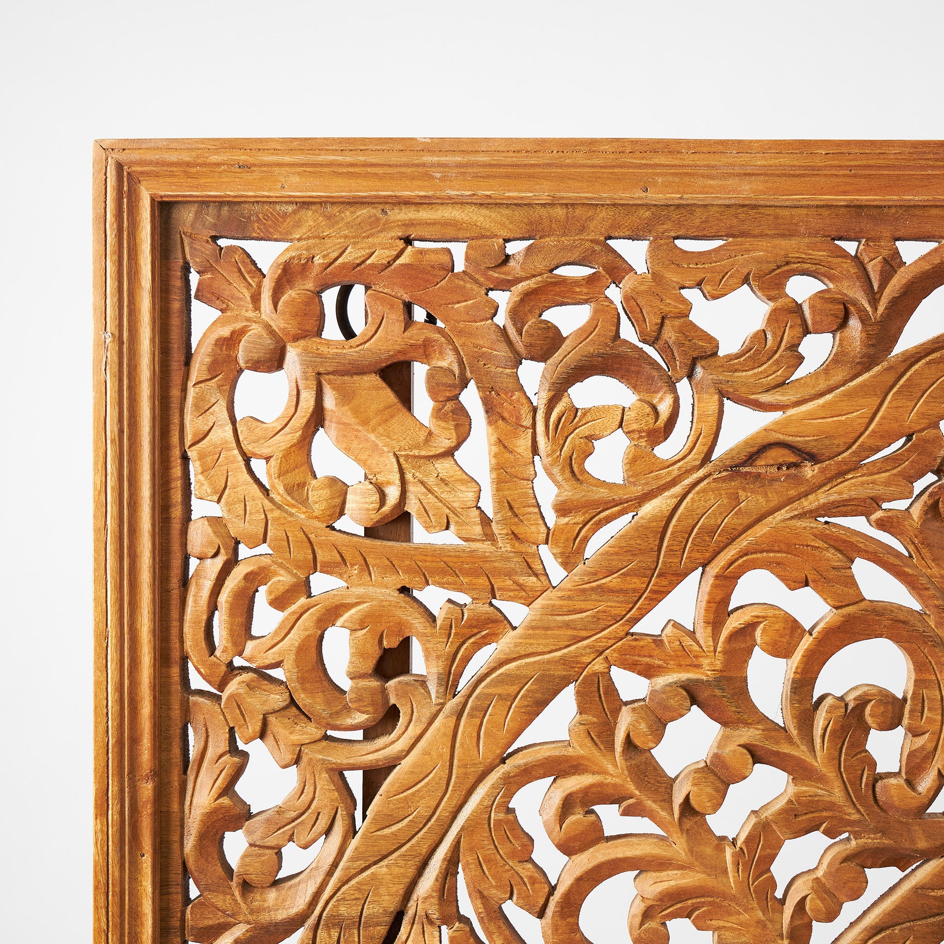 Panou pătrat din lemn, sculptat manual cu motive florale și simetrii atent lucrate. Detaliile fine și modelul central îl transformă într-un element de decor aparte. Se potrivește deasupra unei canapele, într-un living, pe un perete de dining sau chiar într-un spațiu de relaxare, unde poate aduce un plus de căldură și rafinament.