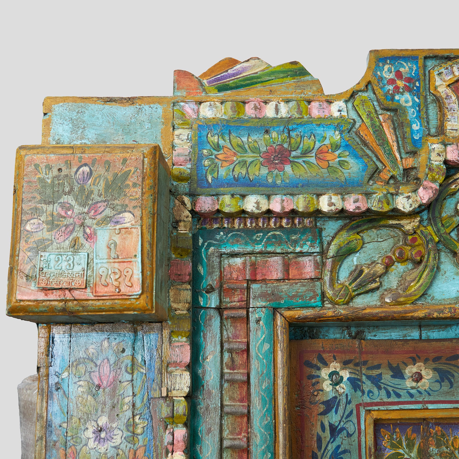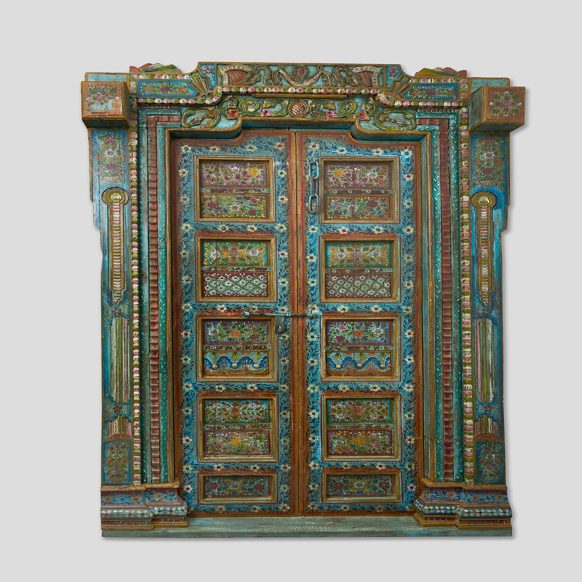Poartă decorativă, masivă din lemn, lucrată manual și pictată în nuanțe vii, cu motive tradiționale indiene. Este o piesă de accent ce poate fi integrată într-un living, hol sau spațiu comercial, aducând un aer autentic oriental.