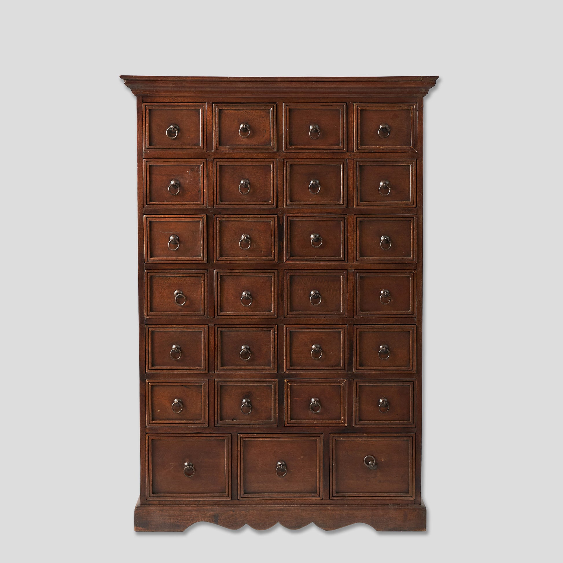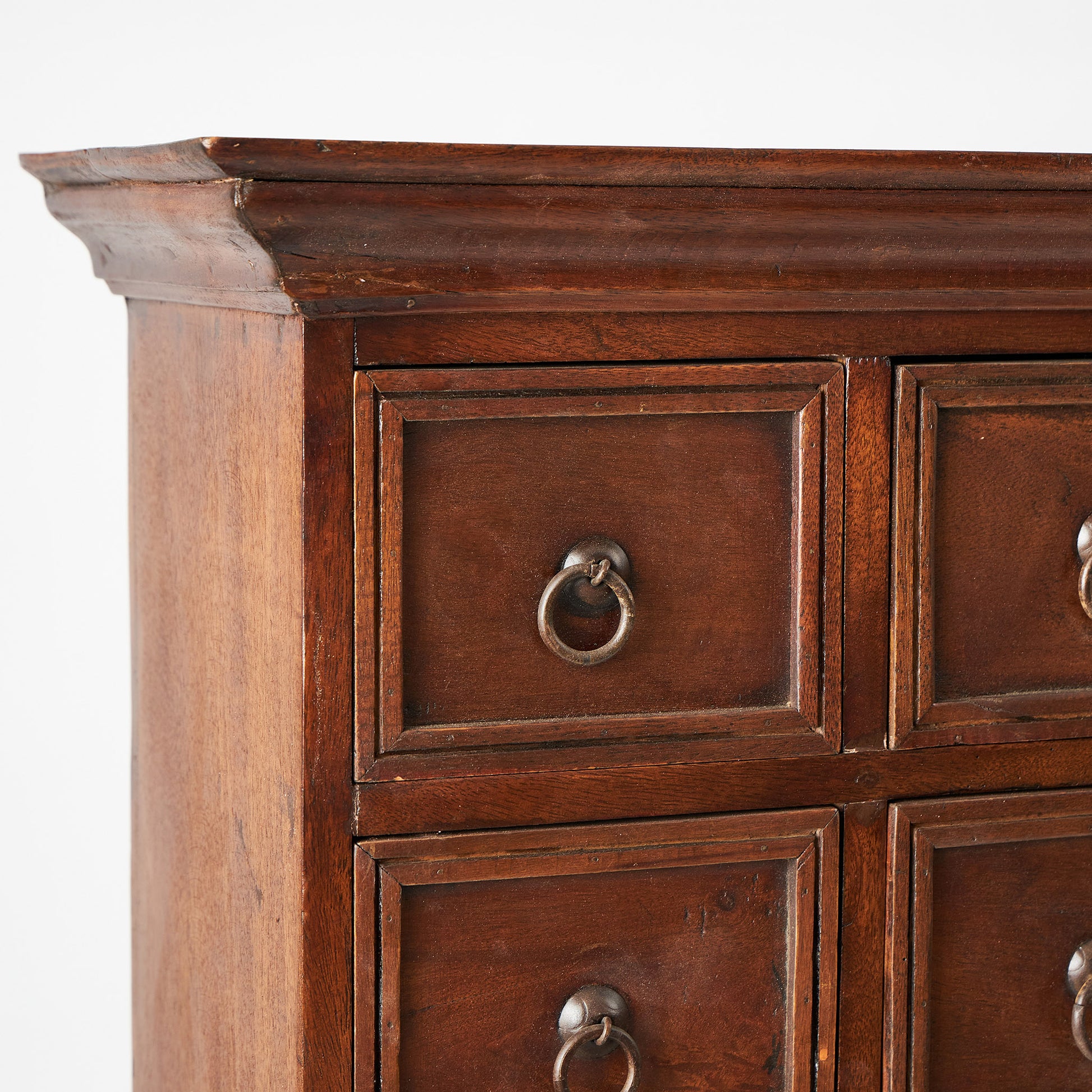 Piesă practică și rezistentă, realizată din lemn de tec, cu multe sertare mici, prevăzute cu mânere metalice rotunde. Este ideal pentru păstrarea bijuteriilor, accesoriilor, documentelor sau altor obiecte mărunte pe care vrei să le ai la îndemână.