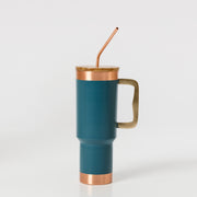 Cană realizată din cupru și vopsită în nuanță de albastru, prevăzută cu capac din lemn și pai metalic reutilizabil. Este potrivită pentru păstrarea băuturilor reci, iar mânerul oferă o prindere confortabilă și sigură. Designul simplu și materialele durabile o fac ideală pentru utilizarea zilnică sau ca element decorativ practic.