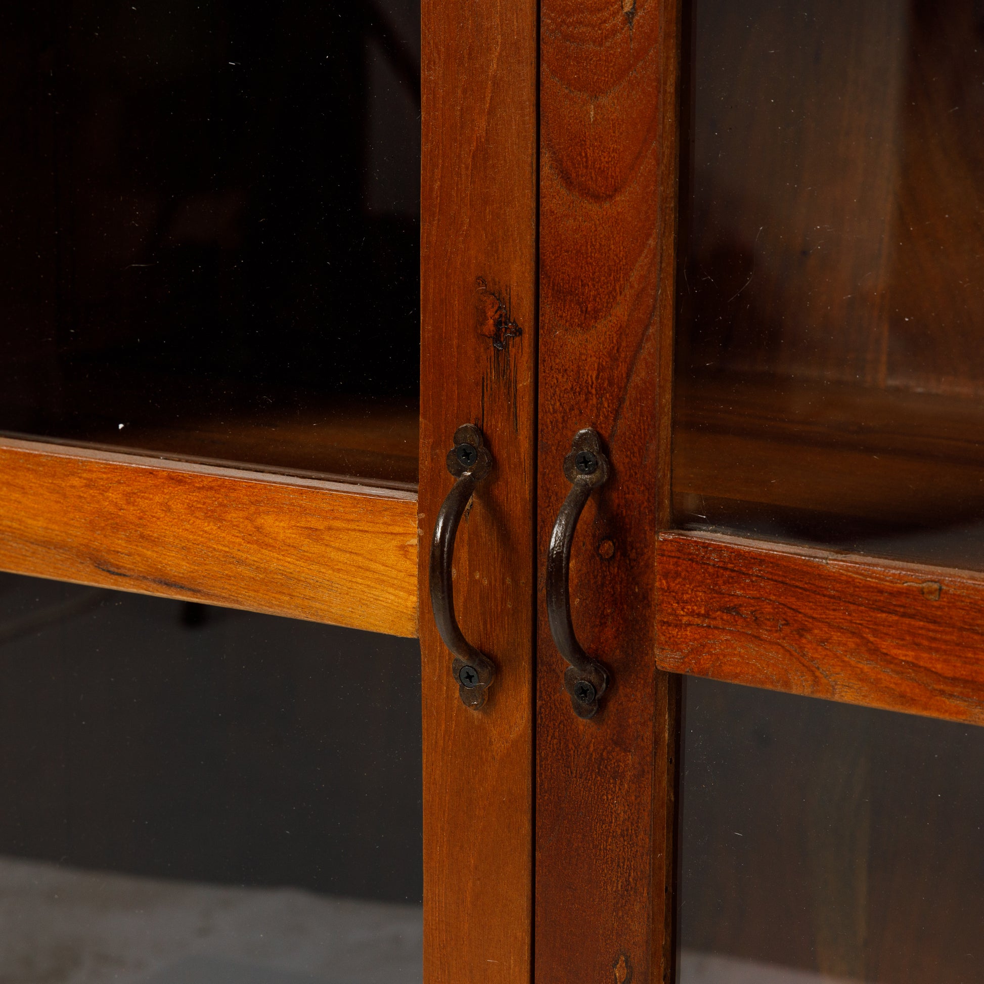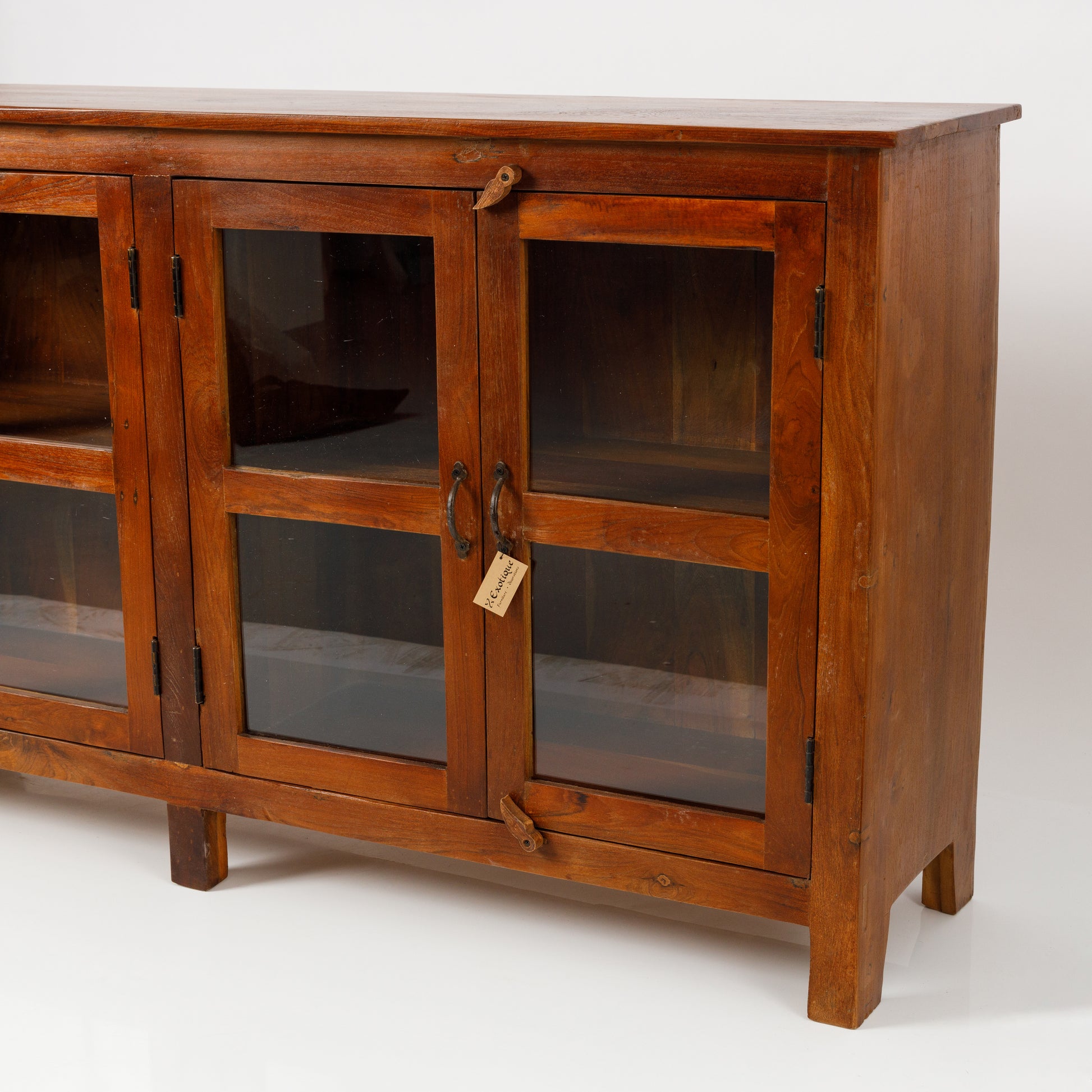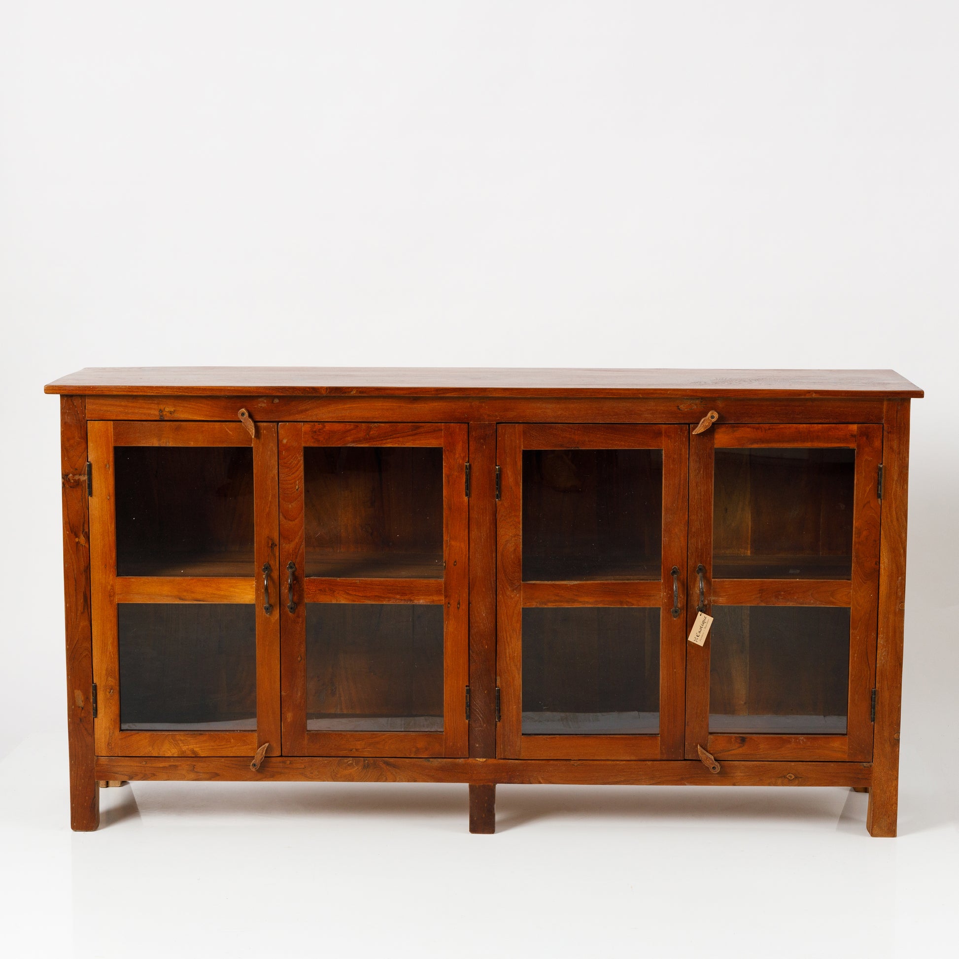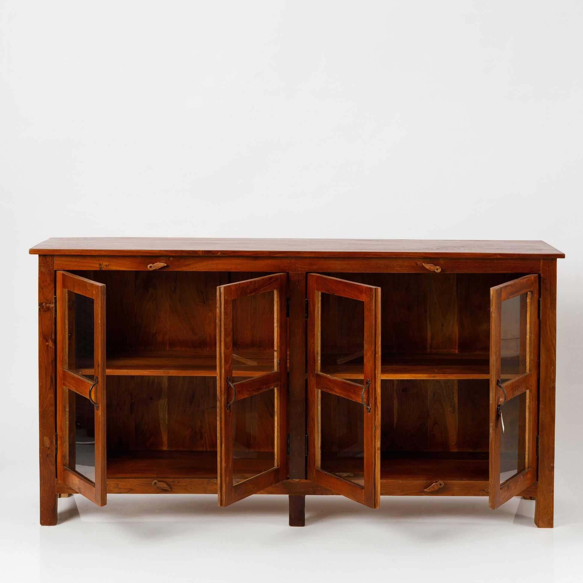 Comoda din lemn de tec are un design simplu, cu patru uși din lemn și sticlă, oferind spațiu generos pentru depozitare. Poate fi folosită pentru a organiza veselă, cărți sau obiecte decorative. Se potrivește într-o sufragerie, bucătărie sau birou. Lemnul masiv și finisajul său îi dau un aspect plăcut, care se integrează ușor în spații cu mobilier din materiale naturale.