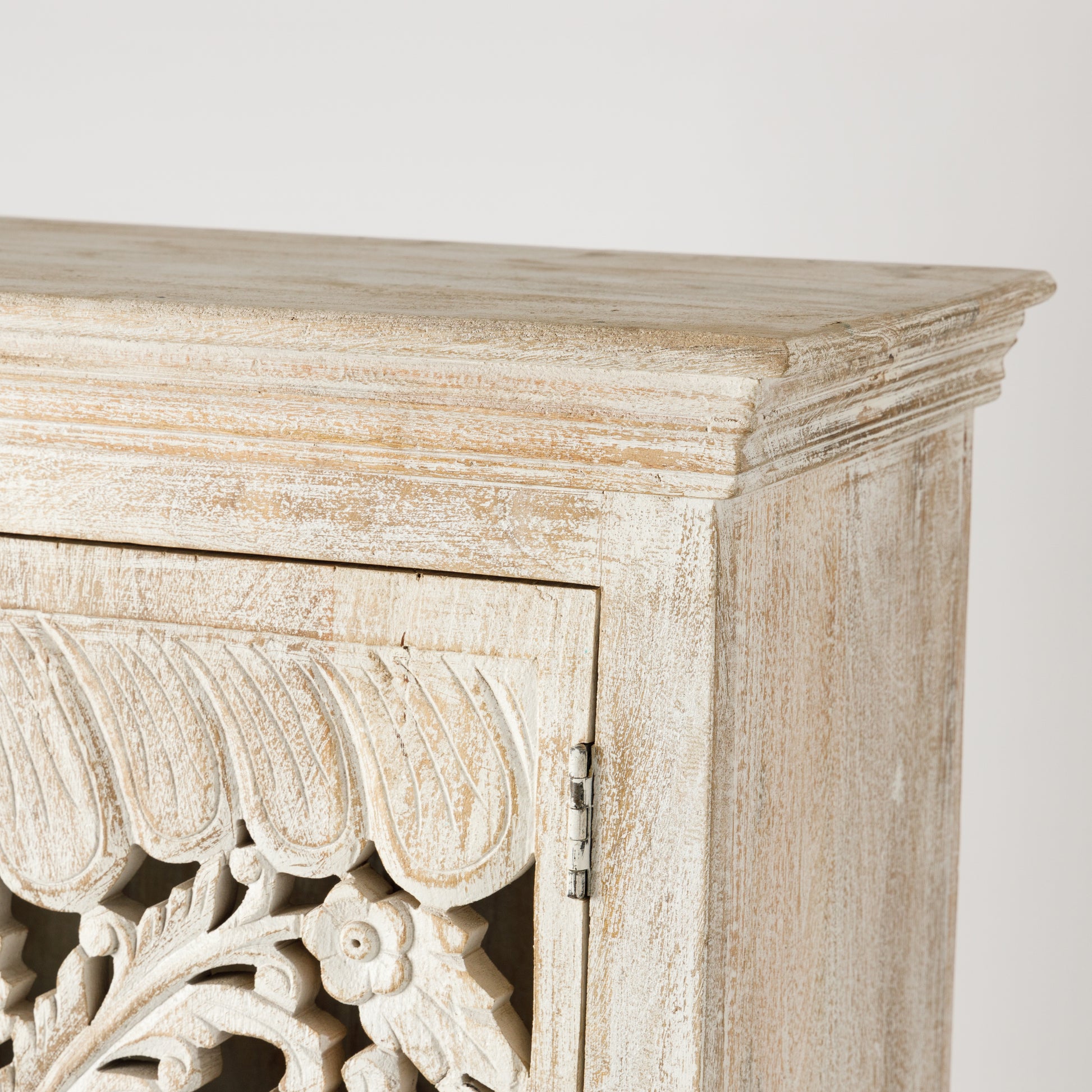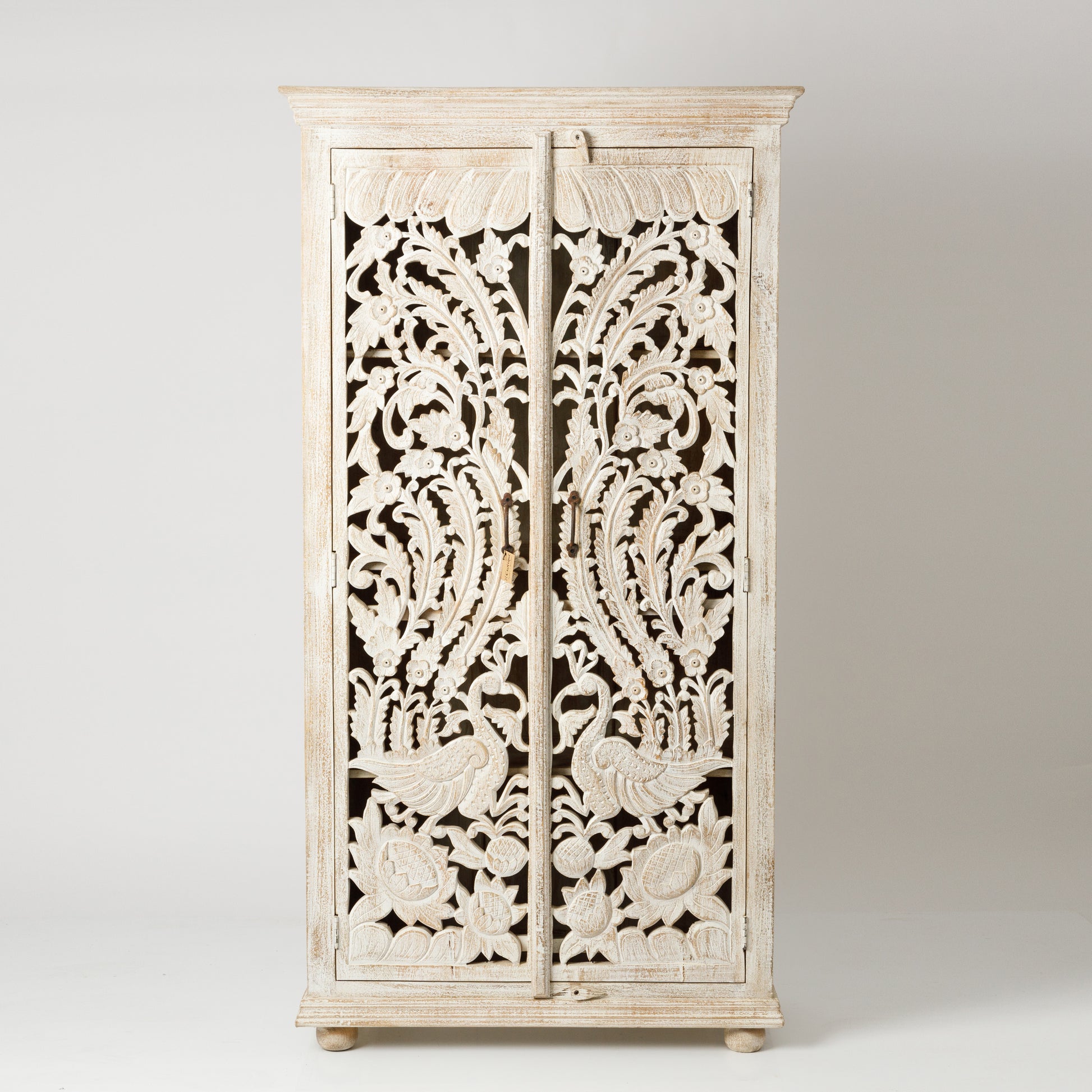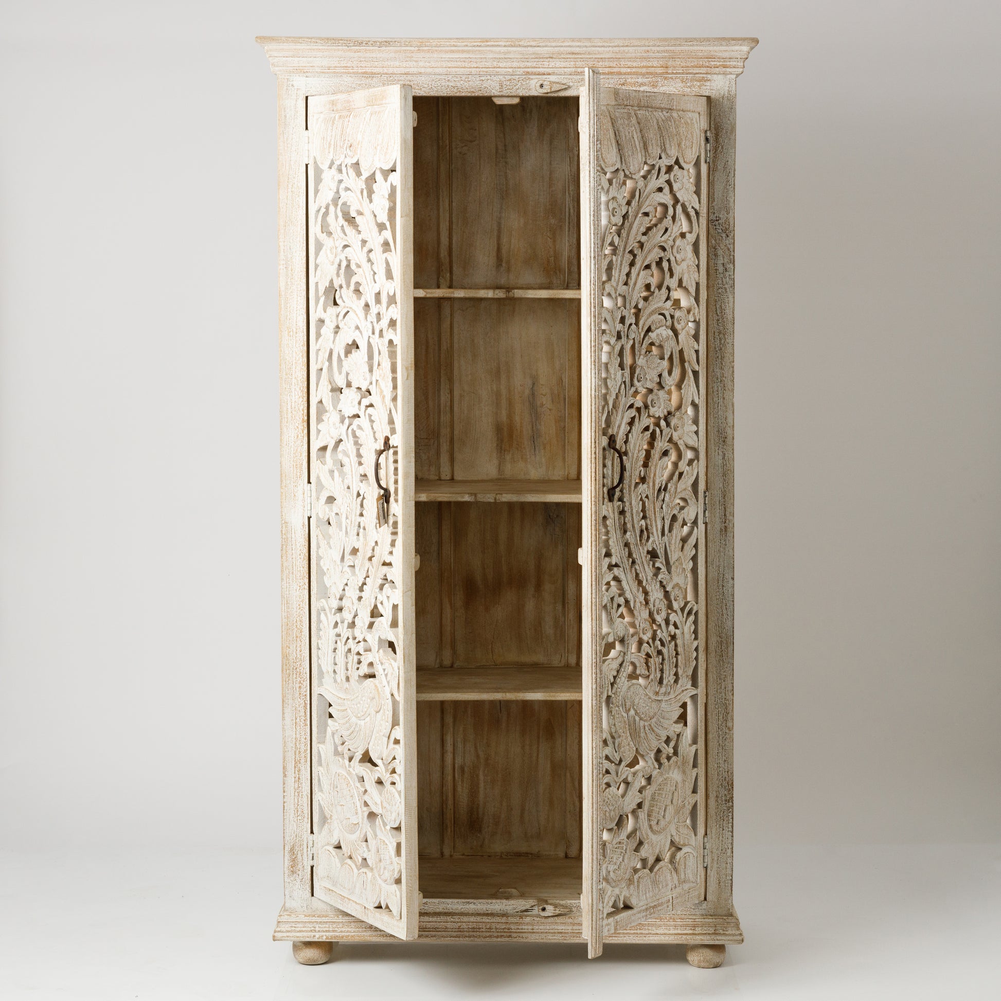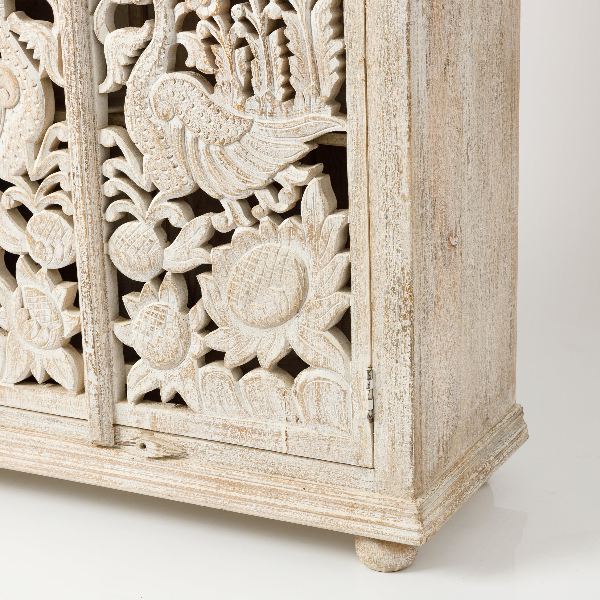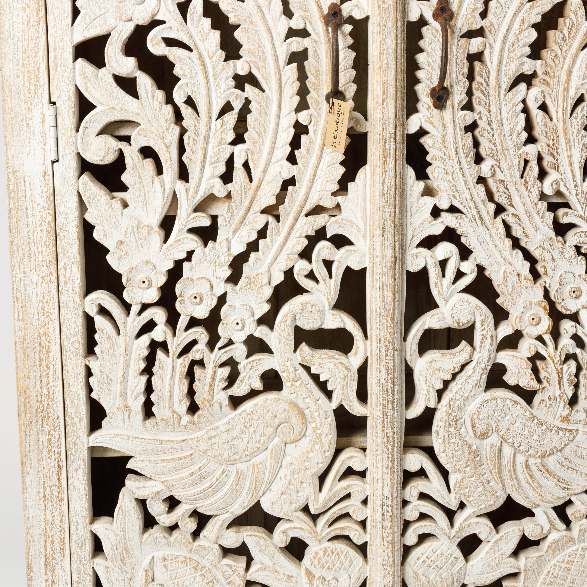 Acest dulap din lemn de mango sculptat manual nu este doar o piesă de mobilier, ci și o soluție practică pentru depozitare. În spatele ușilor sculptate cu detalii inspirate din natură – frunze, flori și păsări – se află un interior spațios cu rafturi solide, perfecte pentru organizarea hainelor, textilelor, vaselor sau chiar a unor obiecte decorative. Fiind o piesă versatilă, poate fi folosit atât acasă, în dormitor, living sau hol, cât și în alte spații. Se potrivește perfect într-un boutique, într-un hotel cu influențe exotice sau într-un restaurant cu un decor aparte.